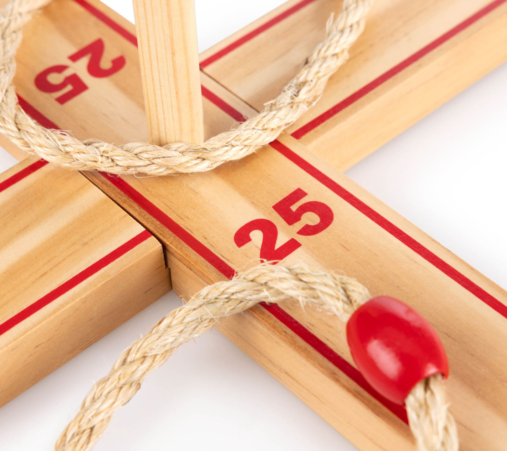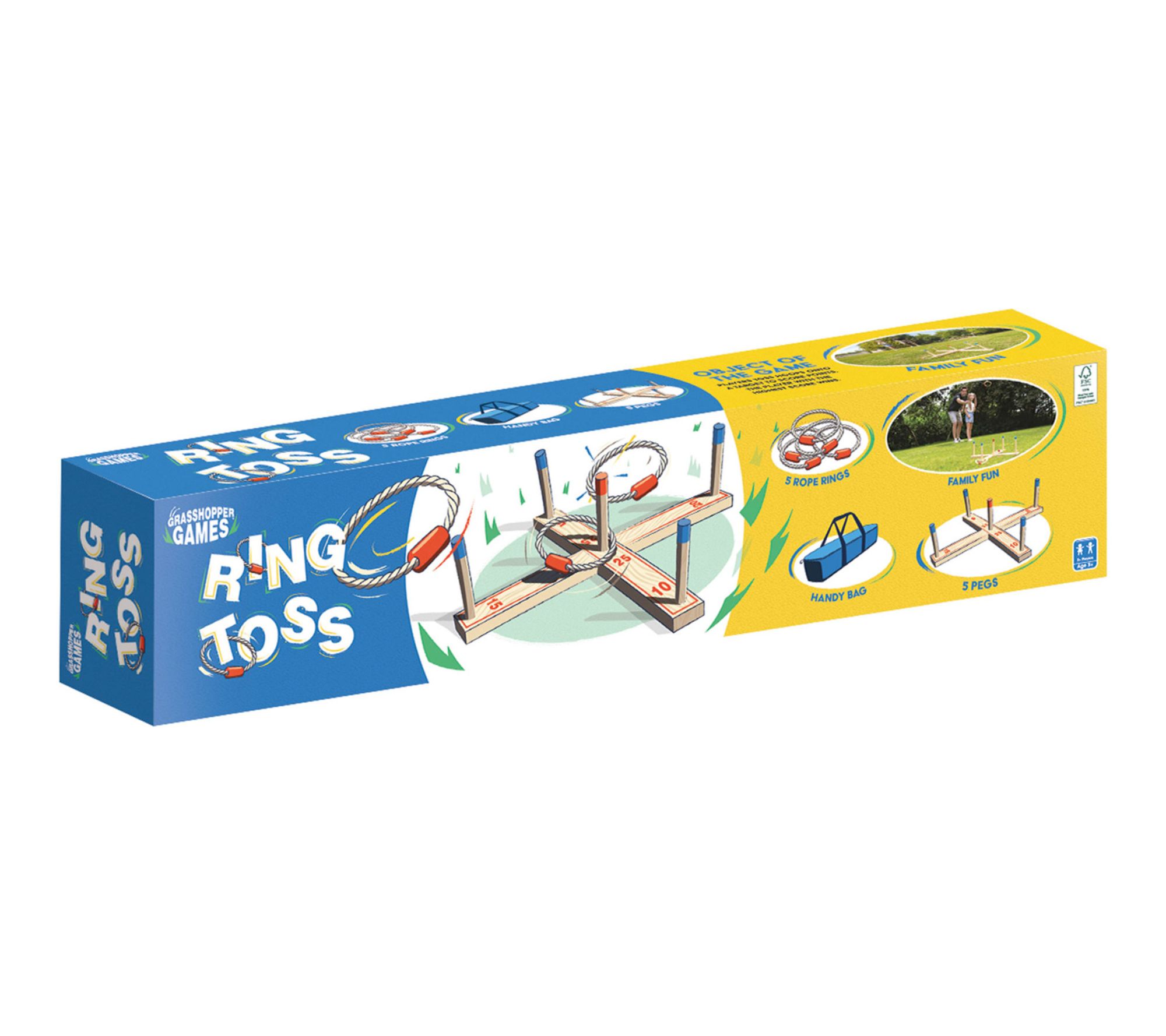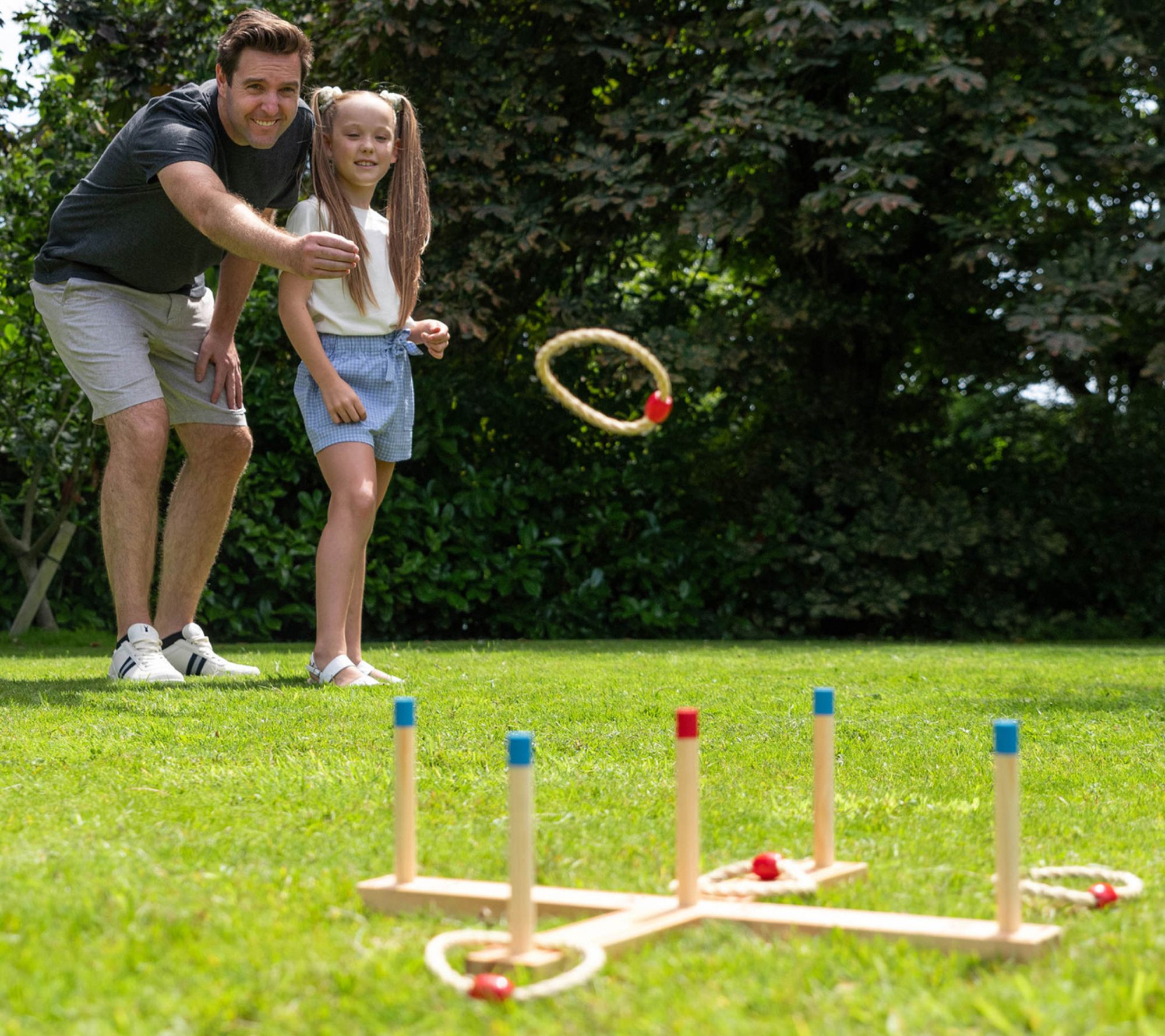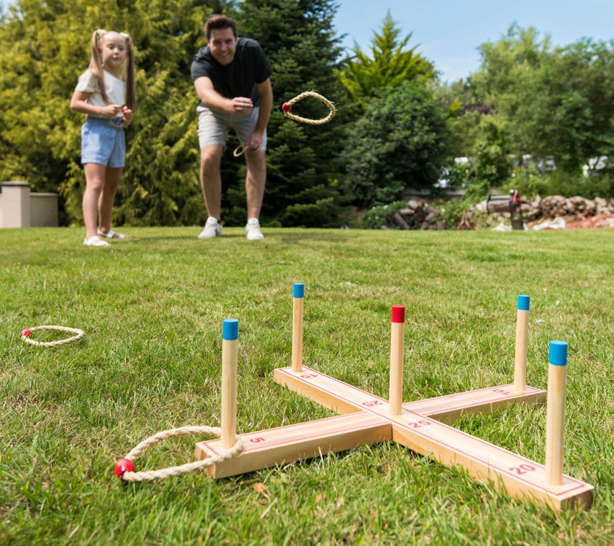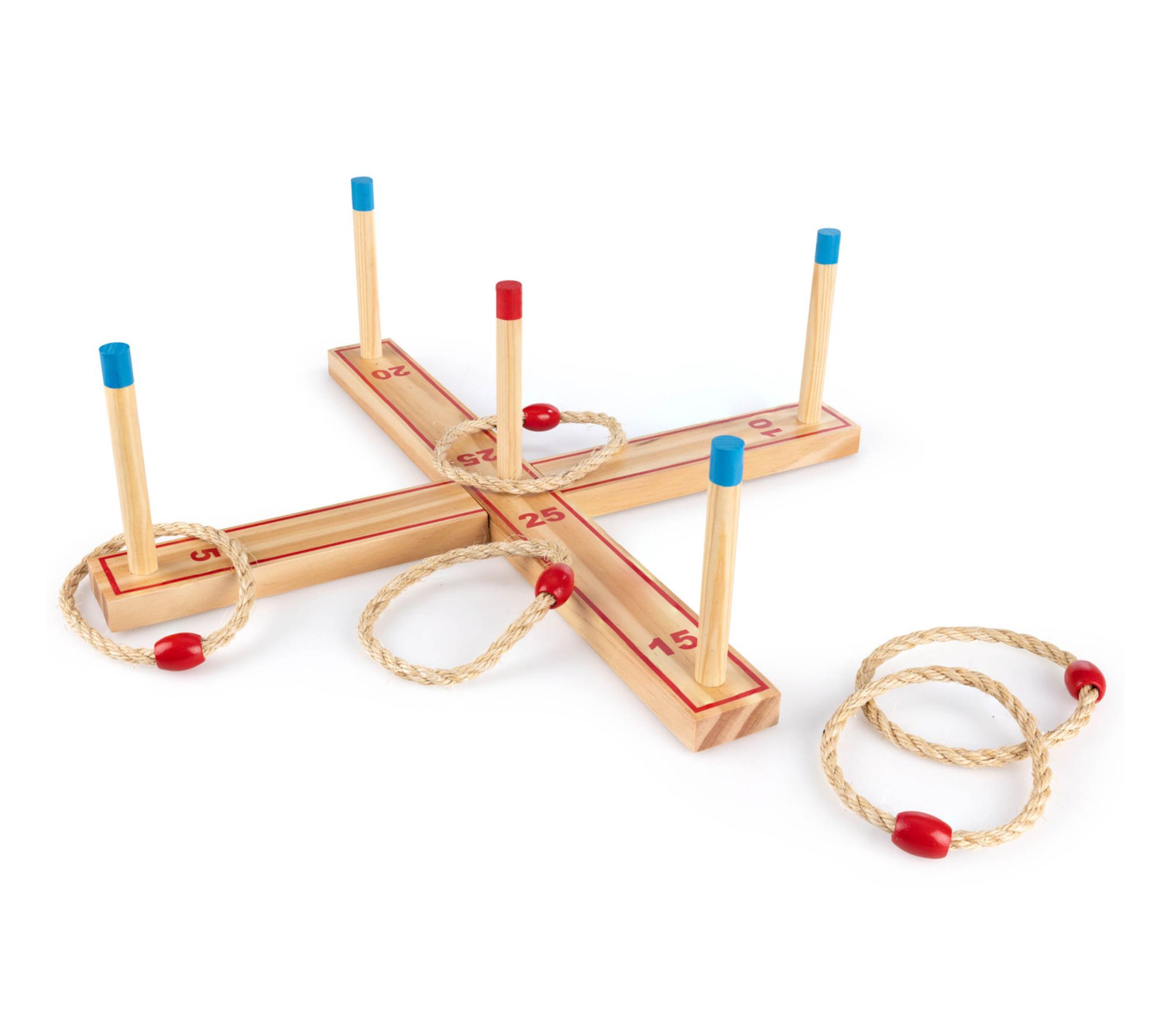 Lazy afternoons turn into memorable competitions with this classic ring toss set, crafted from sturdy wood for hours of outdoor entertainment. Five wooden posts and five rope hoops set the stage for friendly challenges that encourage hand-eye coordination and fun for all ages. Lightweight and easy to pack, it's ready for backyard games, picnics, or spontaneous gatherings wherever you go. From Grasshopper Games.