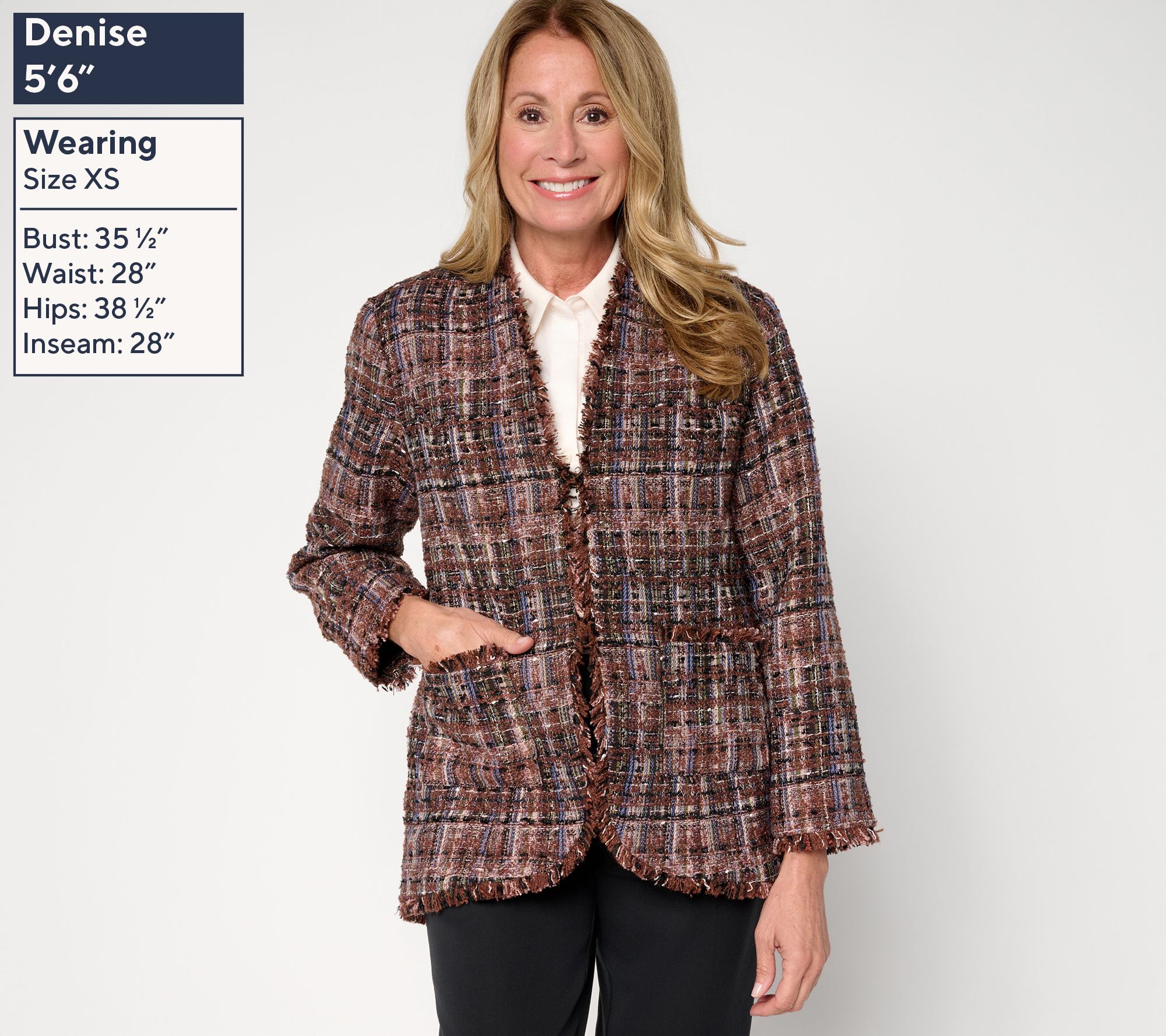 Whether you're leading a team of 20 or one, this frayed tweed topper commands attention. Layer it over trousers and tailored shirts for the office, then style it over a dress for a wedding or dinner date. Chic weekend getaway? Watch it absolutely wow with your favorite denim. Rich multi-hued colorways play nice through multiple seasons of style. From Susan Graver.