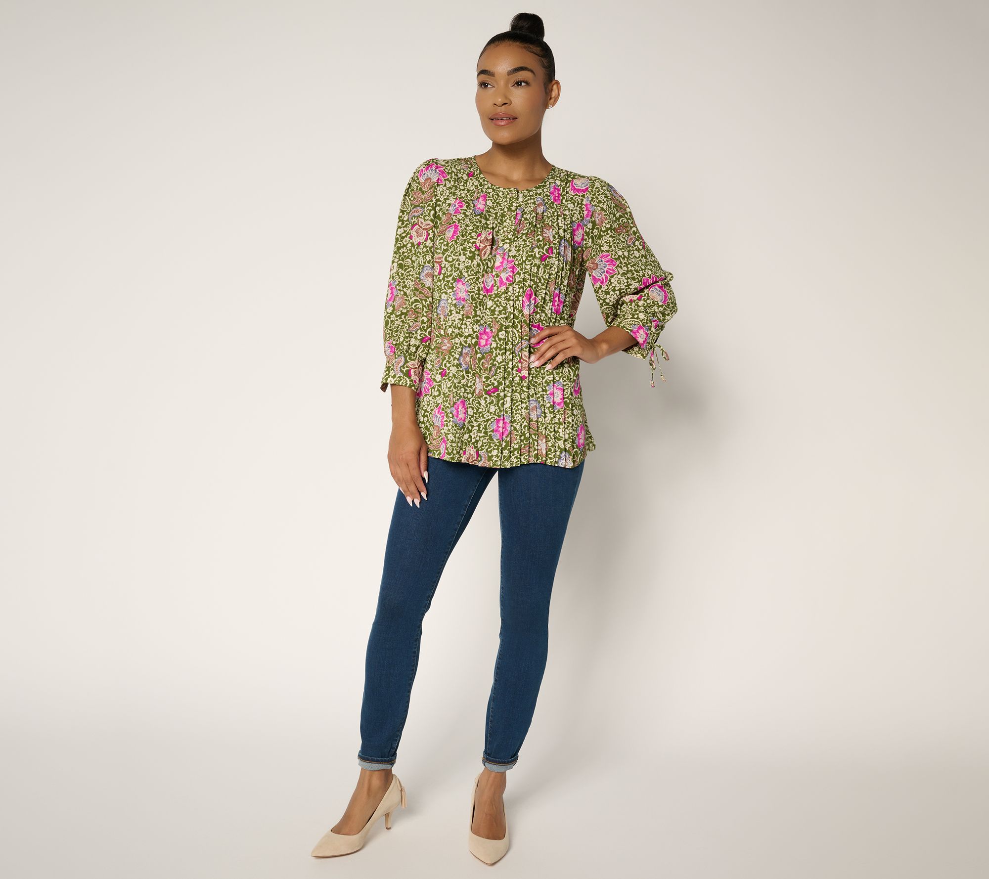 GRAVER Susan Graver Printed Pleated Woven Blouse w/ 3/4 Tie Sleeves