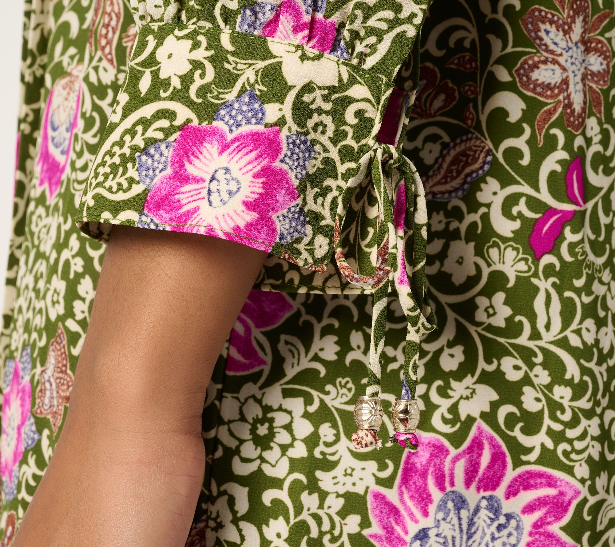• Features: printed, pleated details, 3/4-length slight blouson sleeves with sleeve ties, buttons at center front placket