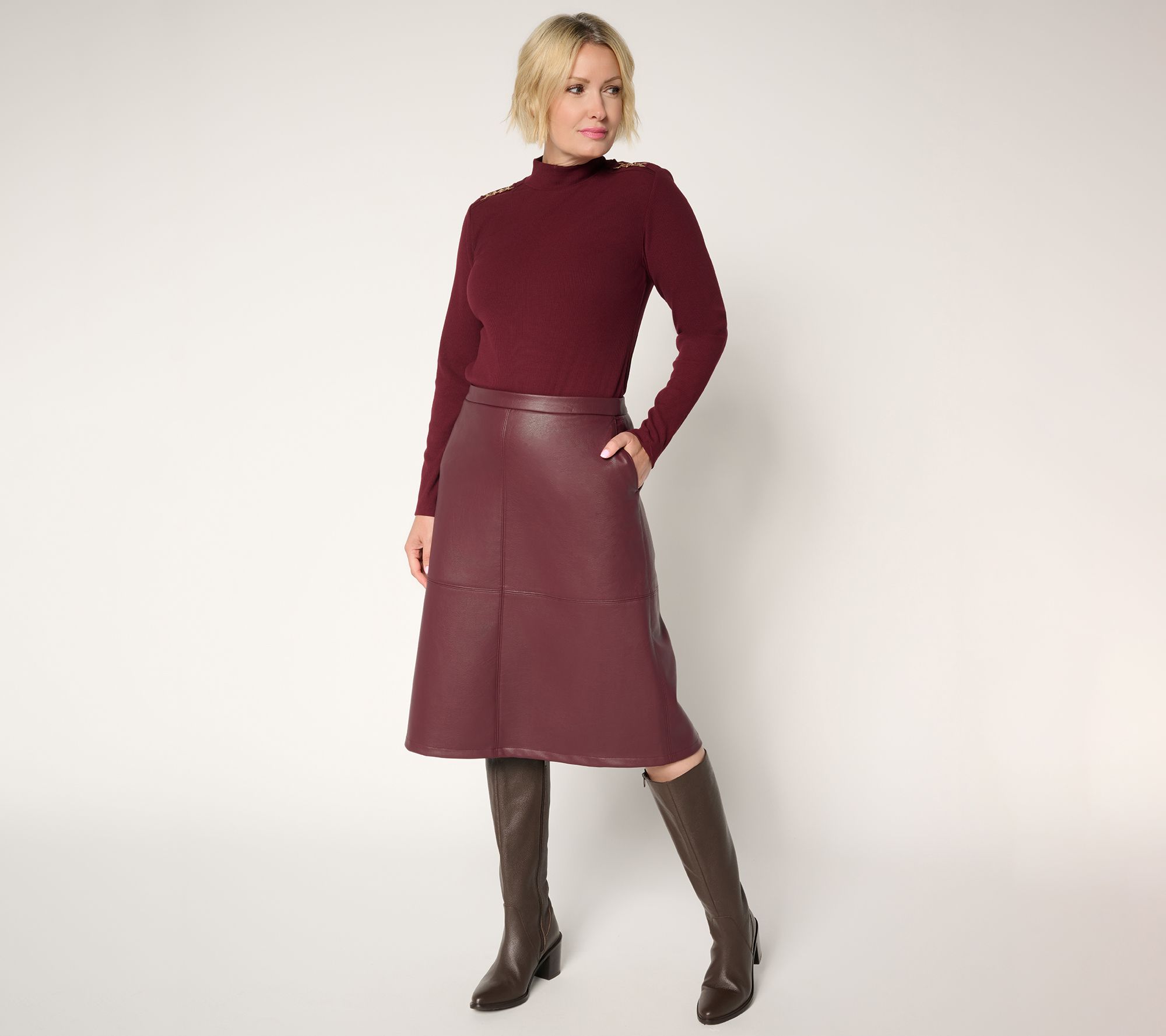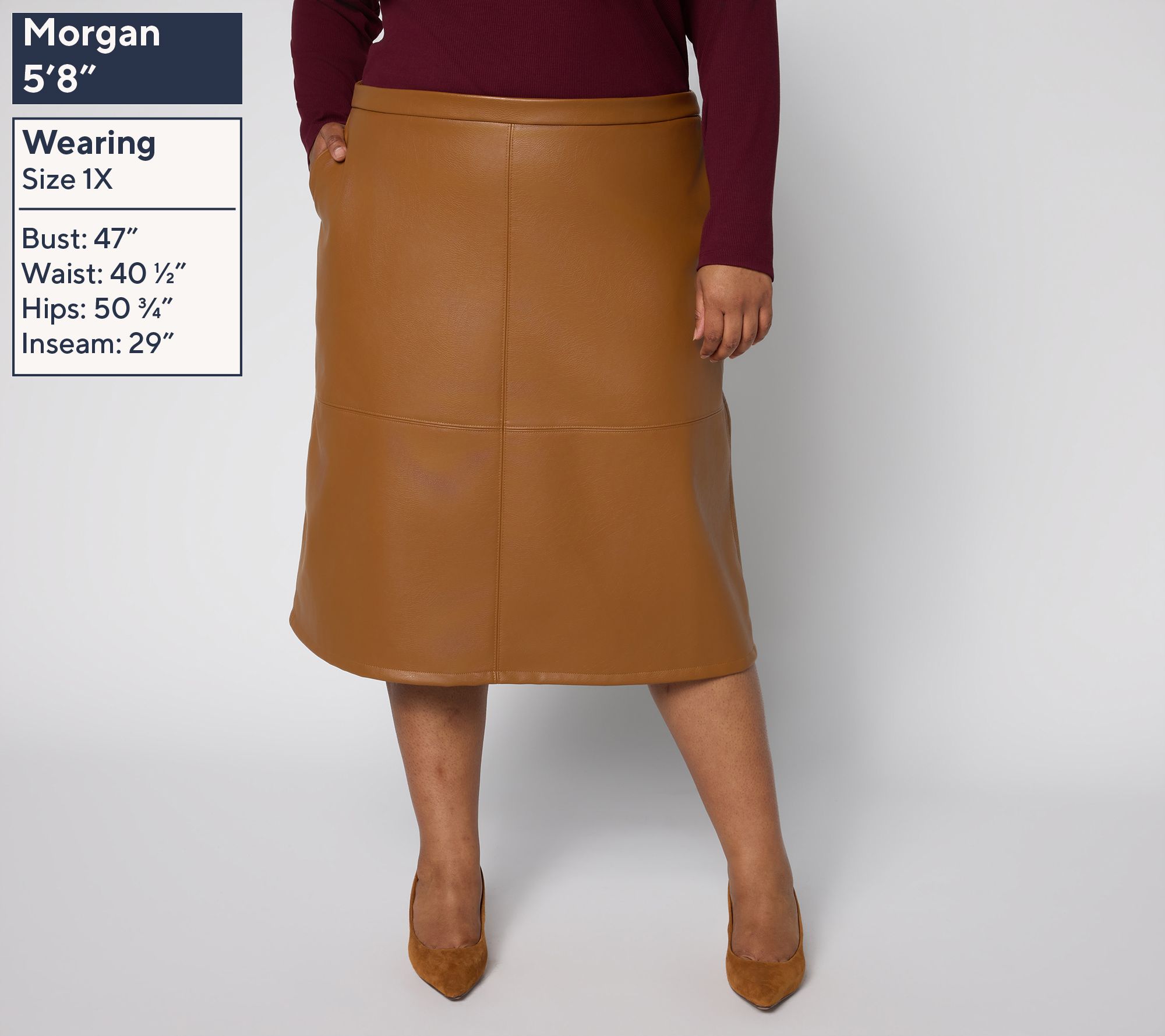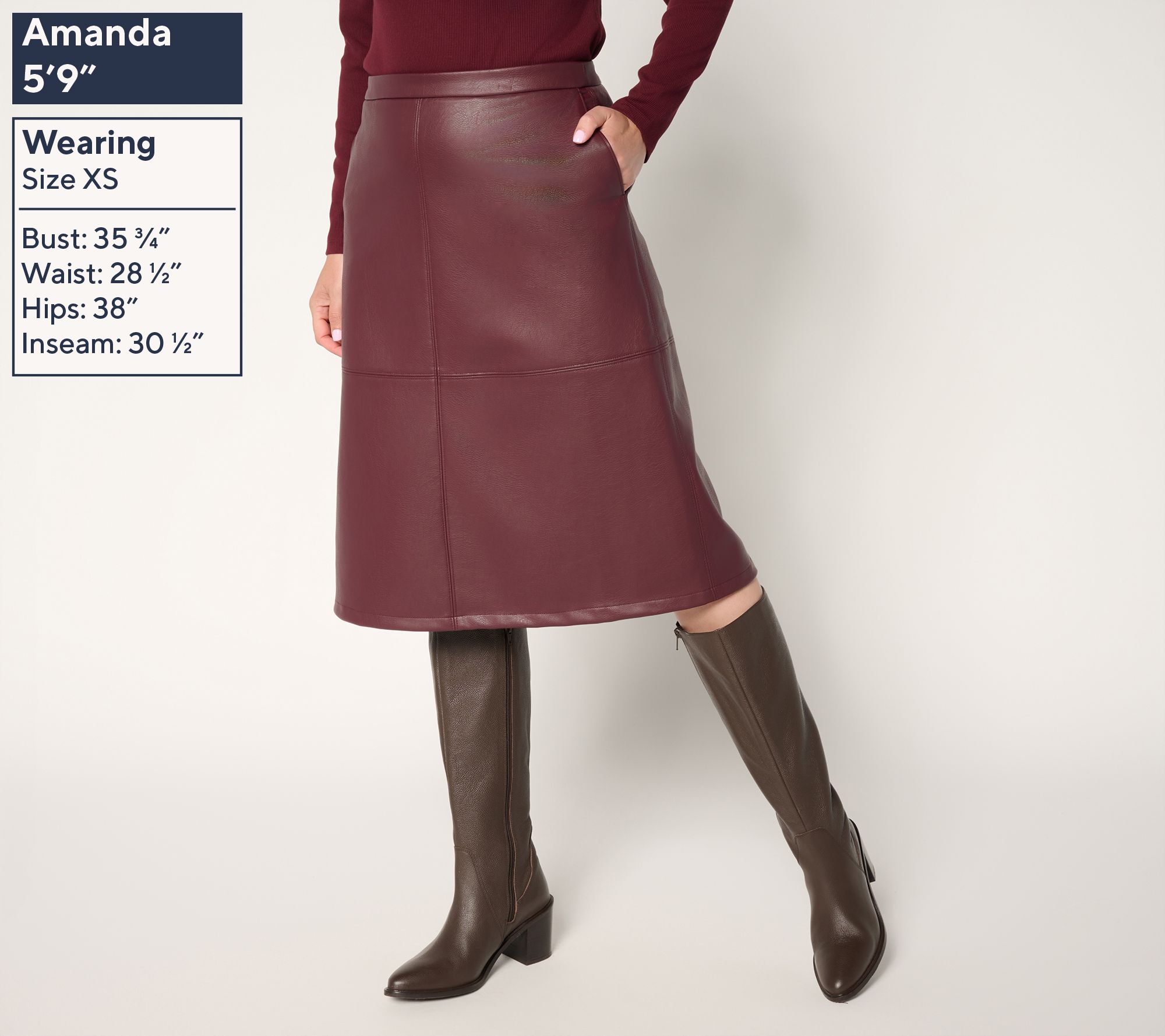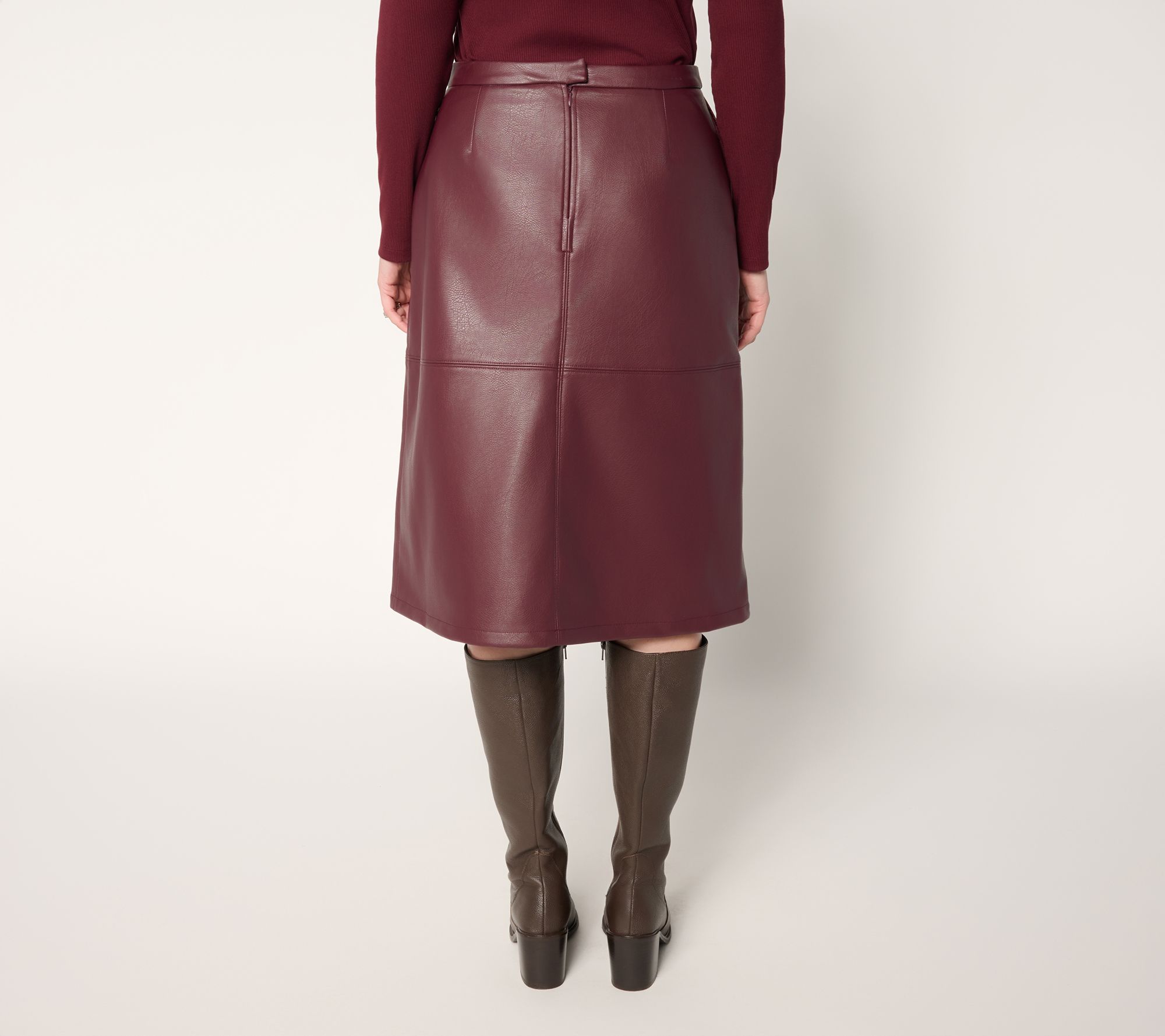 So sleek! Whether you're adding polish to a workday outfit or planning your look for a night out, this faux-leather A-line midi skirt brings modern edge to any wardrobe. Clever paneling and a hidden snap waistband create a smooth, flattering drape that easily transitions from office meetings to evening gatherings. From Susan Graver.