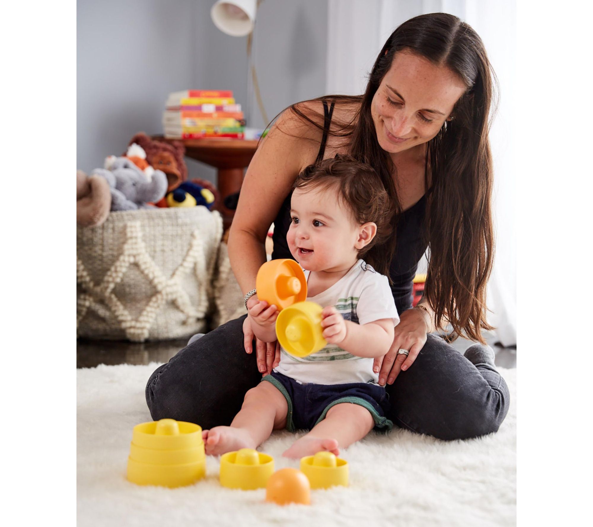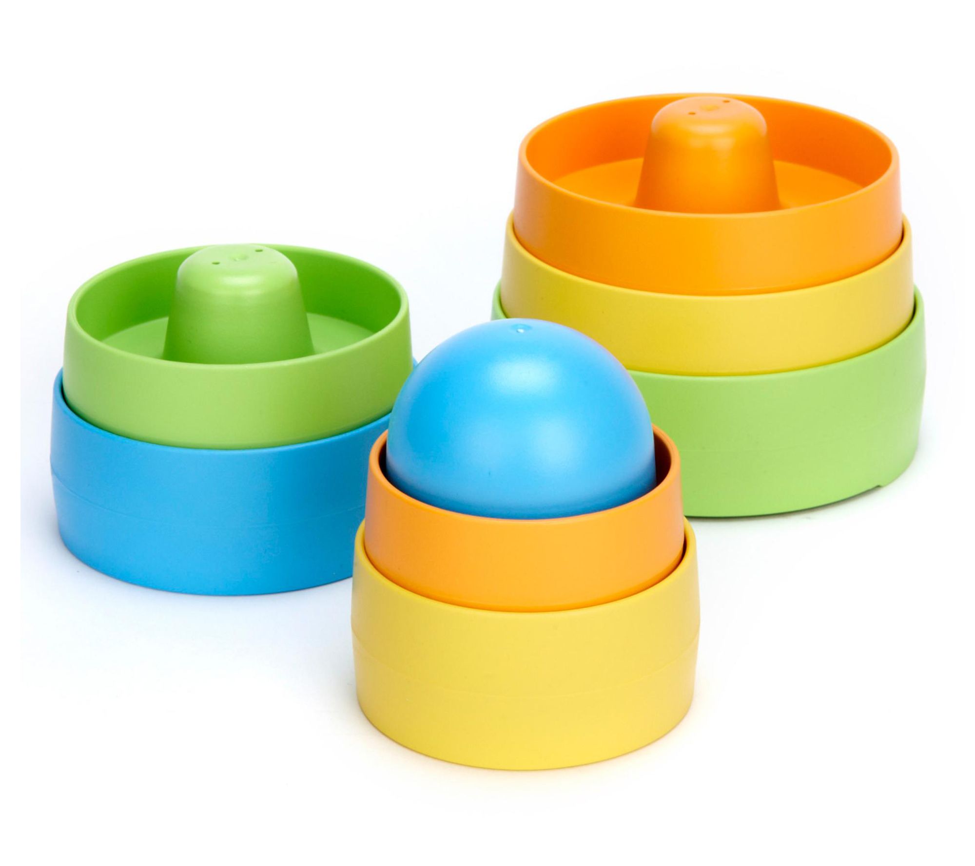 Little builders will delight in bright, imaginative fun as they nest and stack eight colorful cups, creating new patterns and towers each time. With a unique design featuring no center post or sharp edges, this stacking toy makes playtime both safe and engaging -- perfect for developing hand-eye coordination and color recognition during tummy time or on-the-go adventures. From Green Toys.