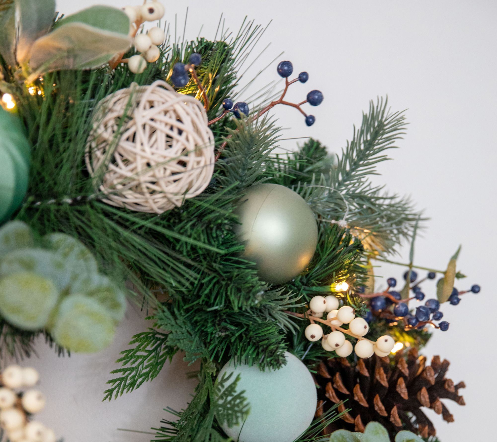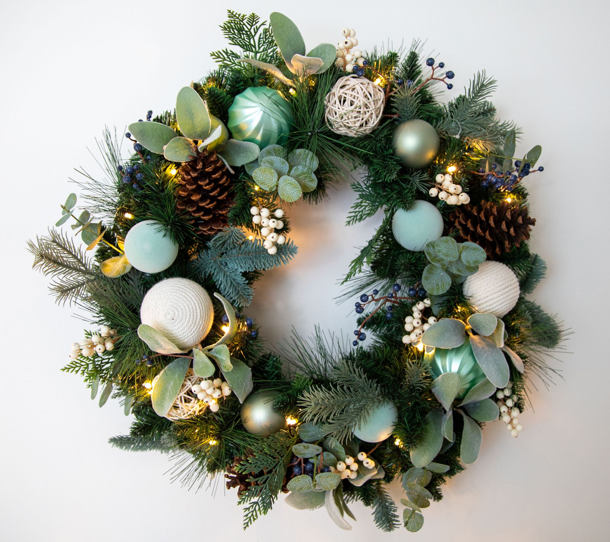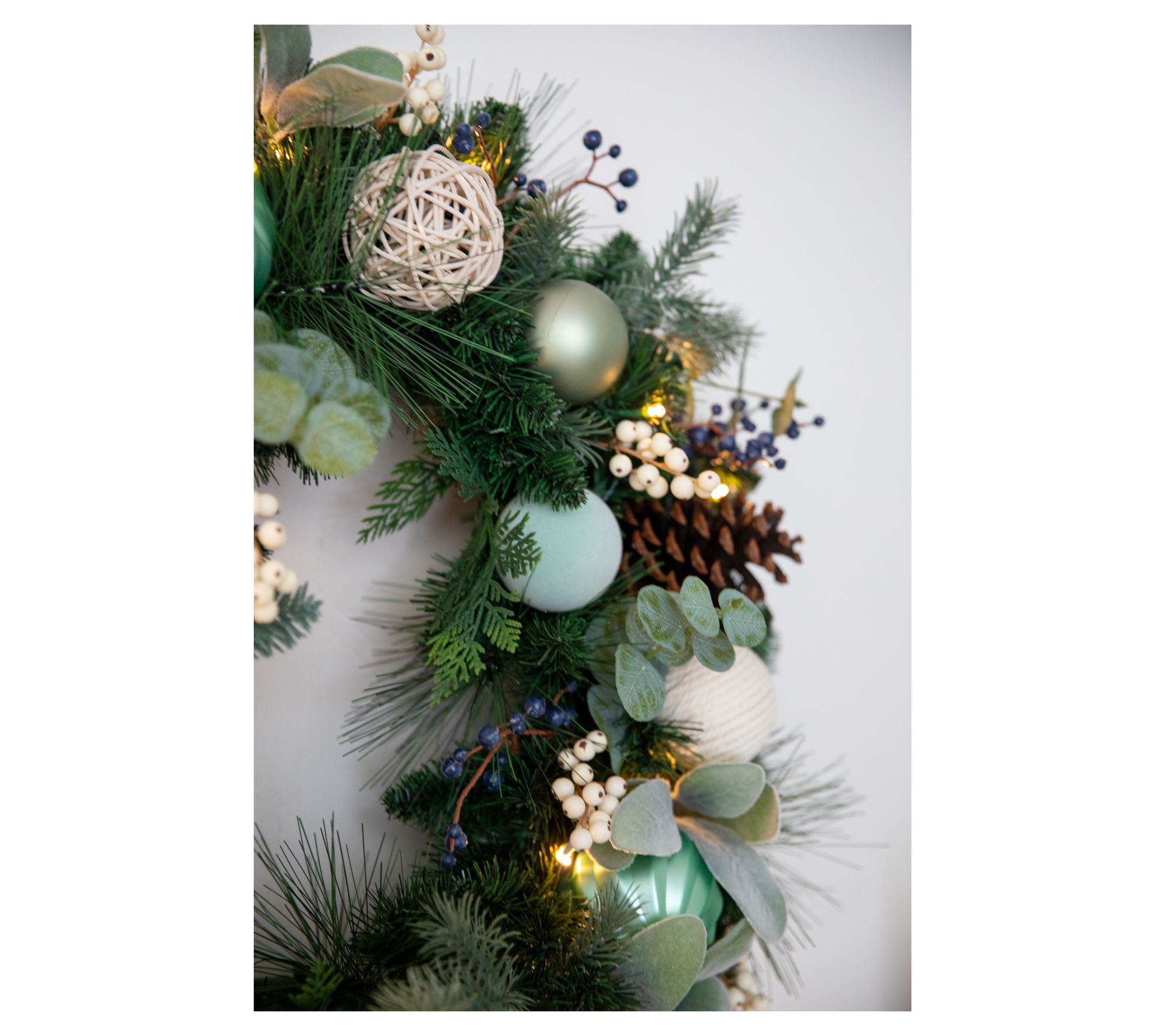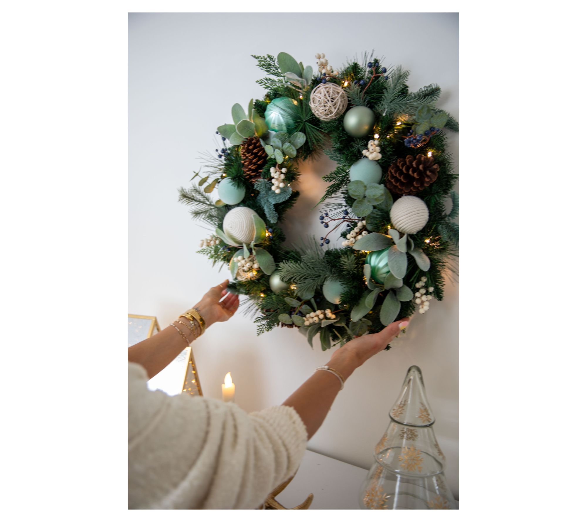 Guests will be drawn in by the subtle sparkle and layered texture of this wreath, with its lifelike greenery, playful ornaments, and clusters of berries. A string of LED lights adds a subtle glow, while the timer turns it on and off at the same time each night. From Lauren McBride.
