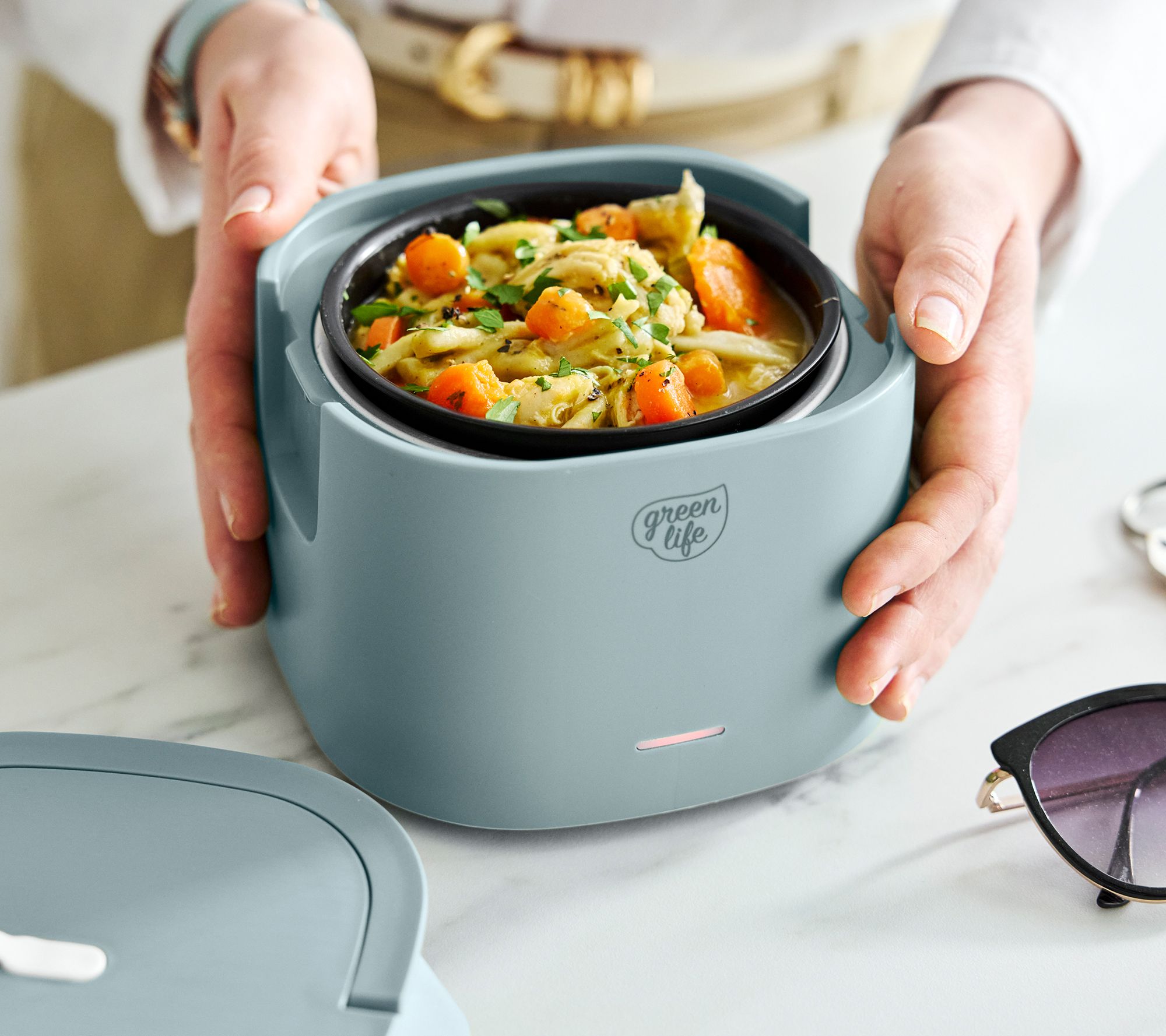 Enjoy warm, delicious meals on the go with this heated lunch box. It features a durable housing unit for even warming and a tight-sealing lid to lock in heat and prevent spills. The convenient carrying handle and detachable cord make it easy to transport and store. From GreenLife.