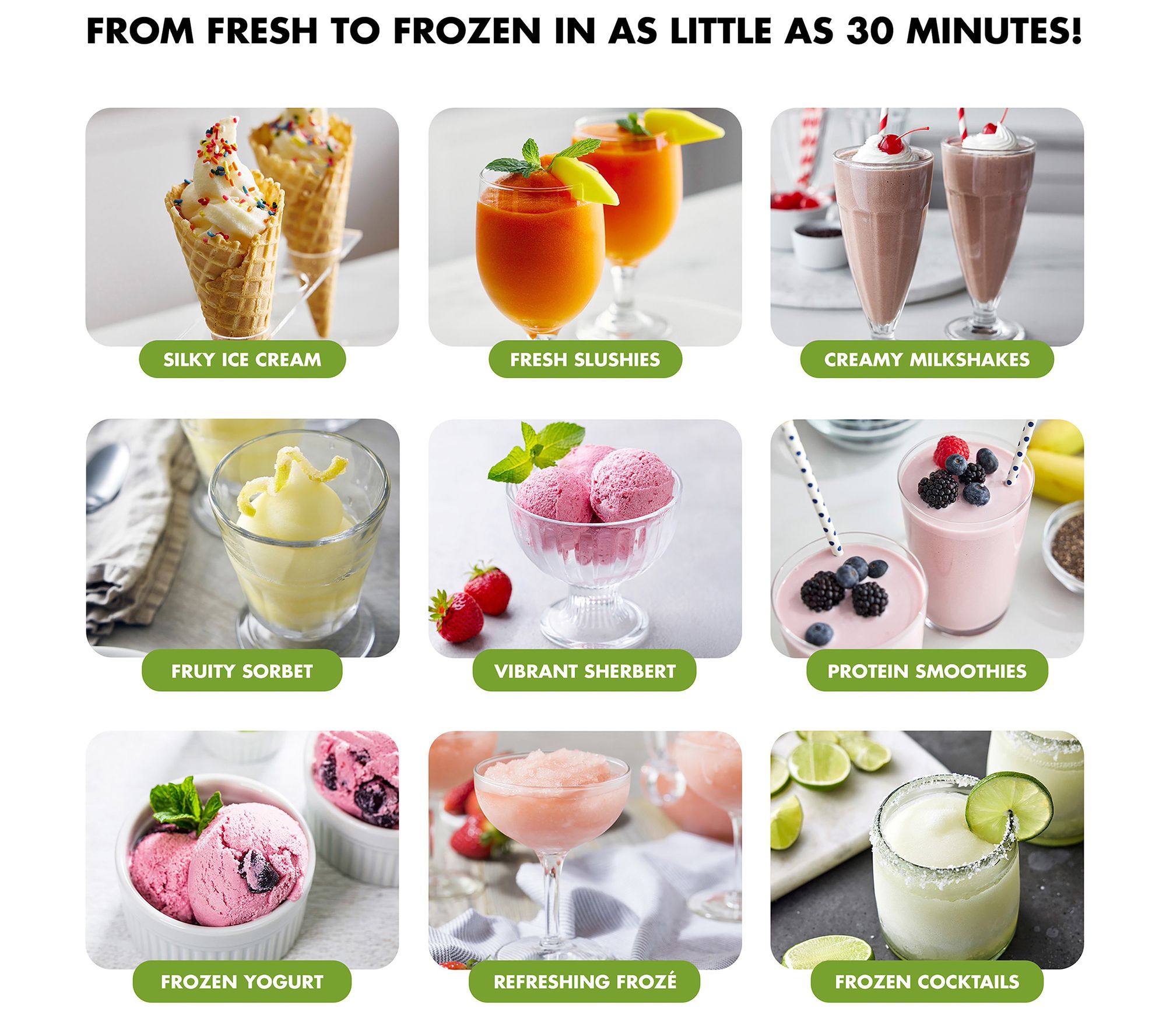 • Makes soft serve ice cream, milkshakes, slushies, frozen yogurt, frozen cocktails, mocktails, sorbet, sherbet, smoothies, froze, custard, protein shakes, and dairy-free/vegan ice cream