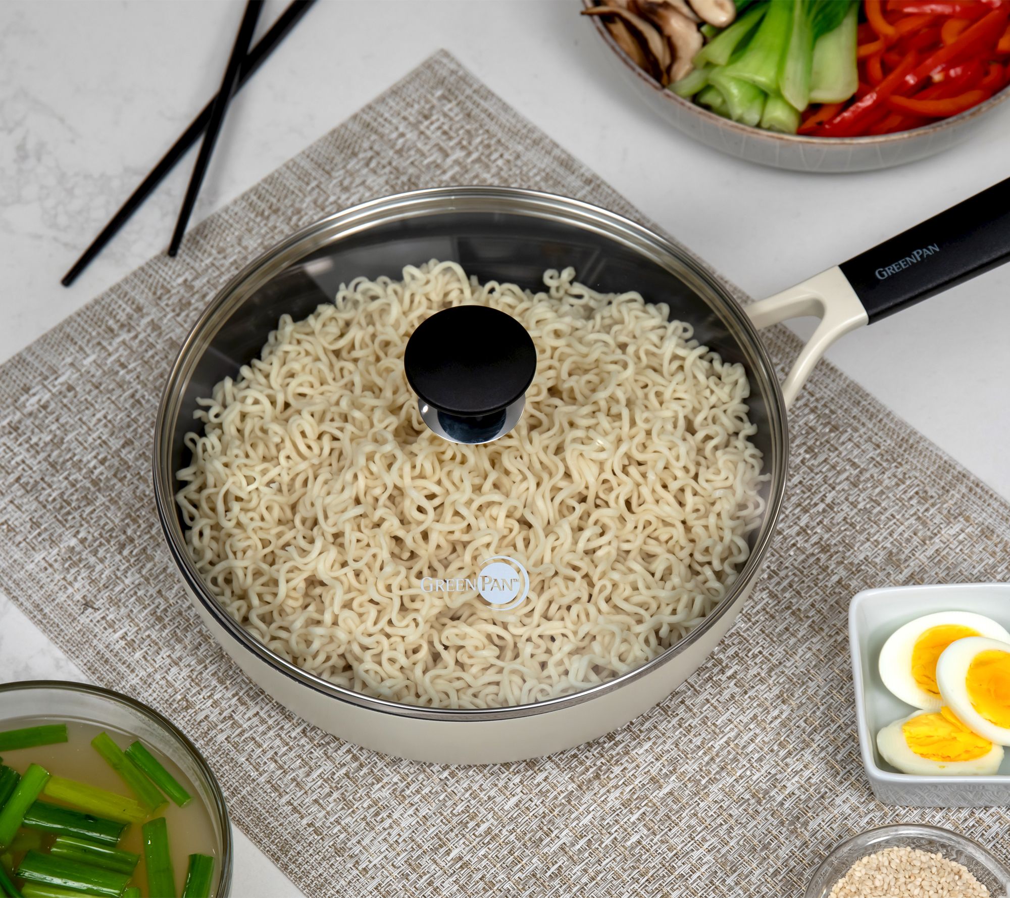 Truly a kitchen staple, this 3-qt Chef's Pan comes with a glass lid so you can cook and look. Metal utensil-safe, it's truly a versatile vessel great for whipping up many meals. From GreenPan.