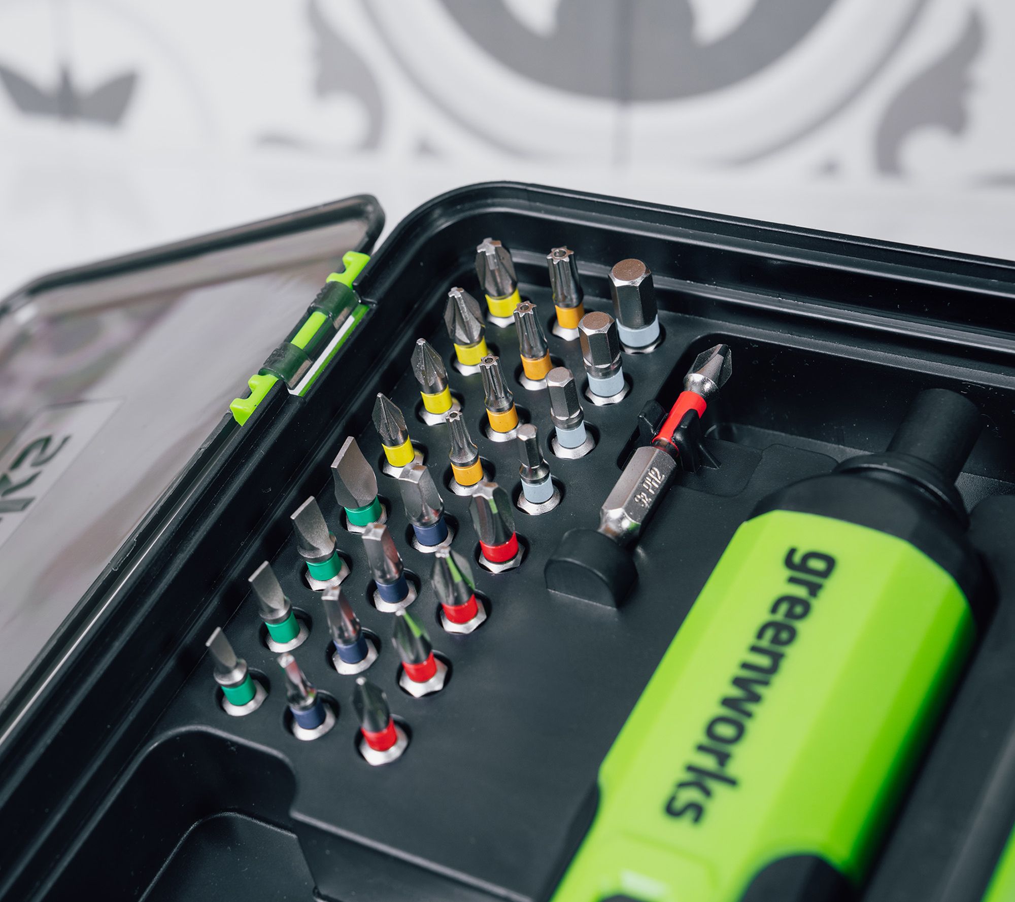 Good things come in small packages. Compact and powerful, this 4V cordless screwdriver is your household hero, easily handling tough tasks with more mobility than its big brothers. With 26 accessories, you can repair, assemble, or quickly fix with a forward/reverse switch while also brightening dark or tight workspaces with its convenient onboard LED light. From Greenworks.