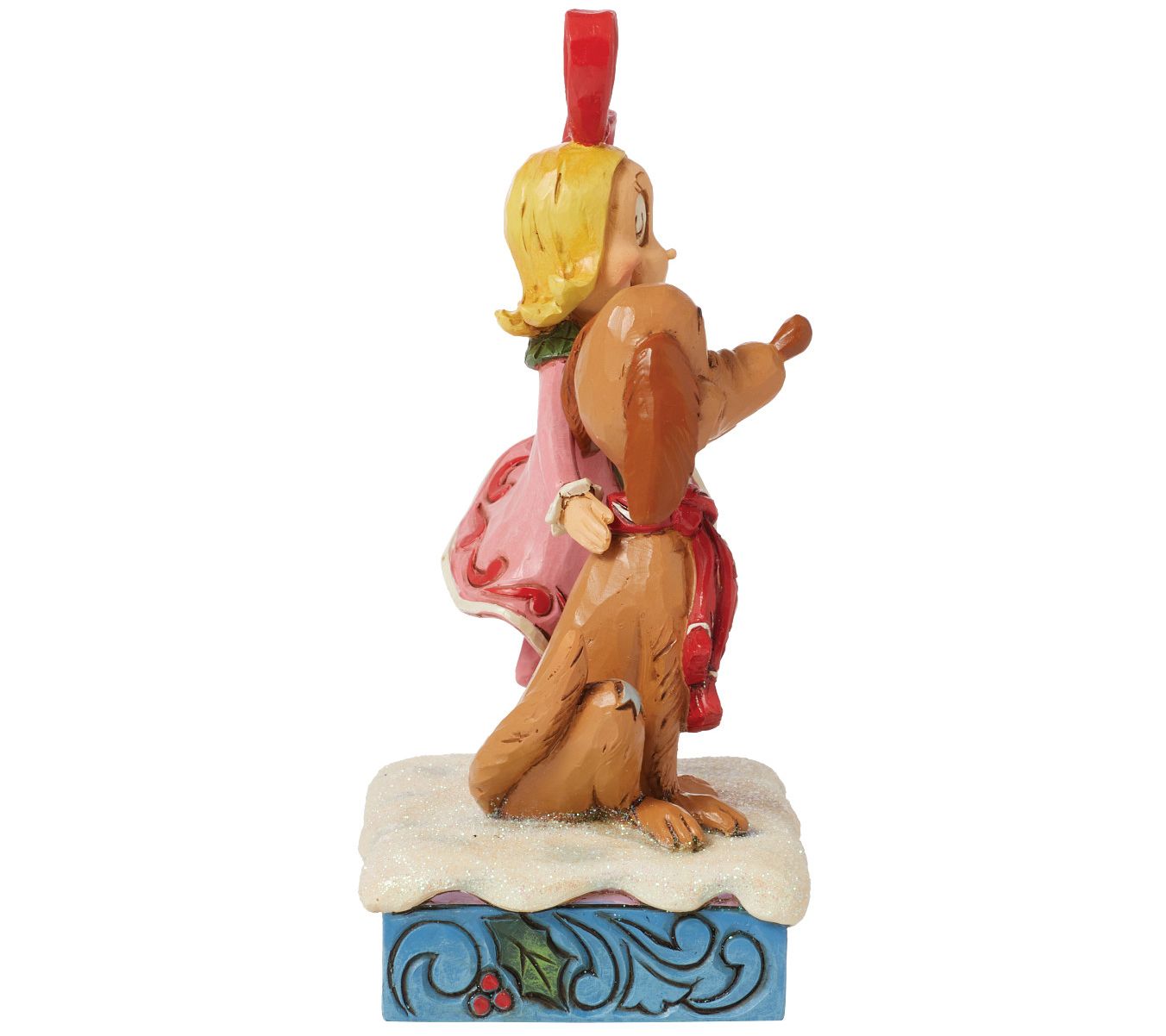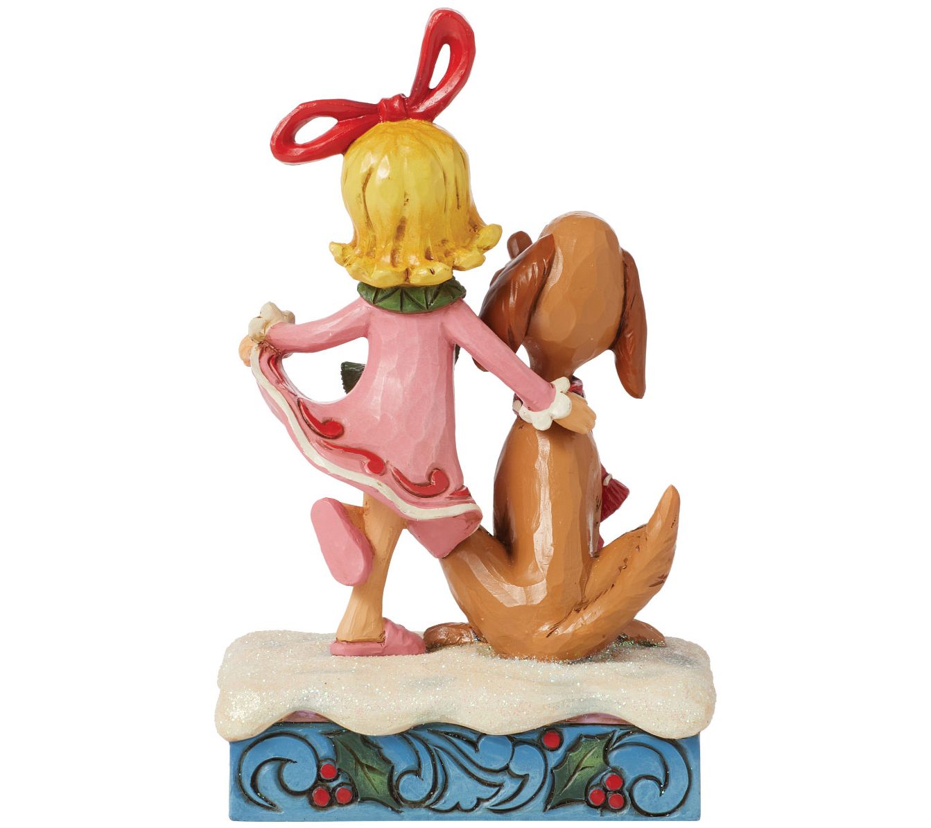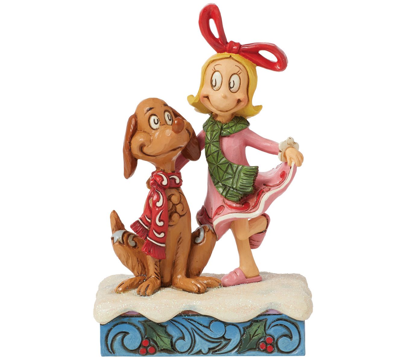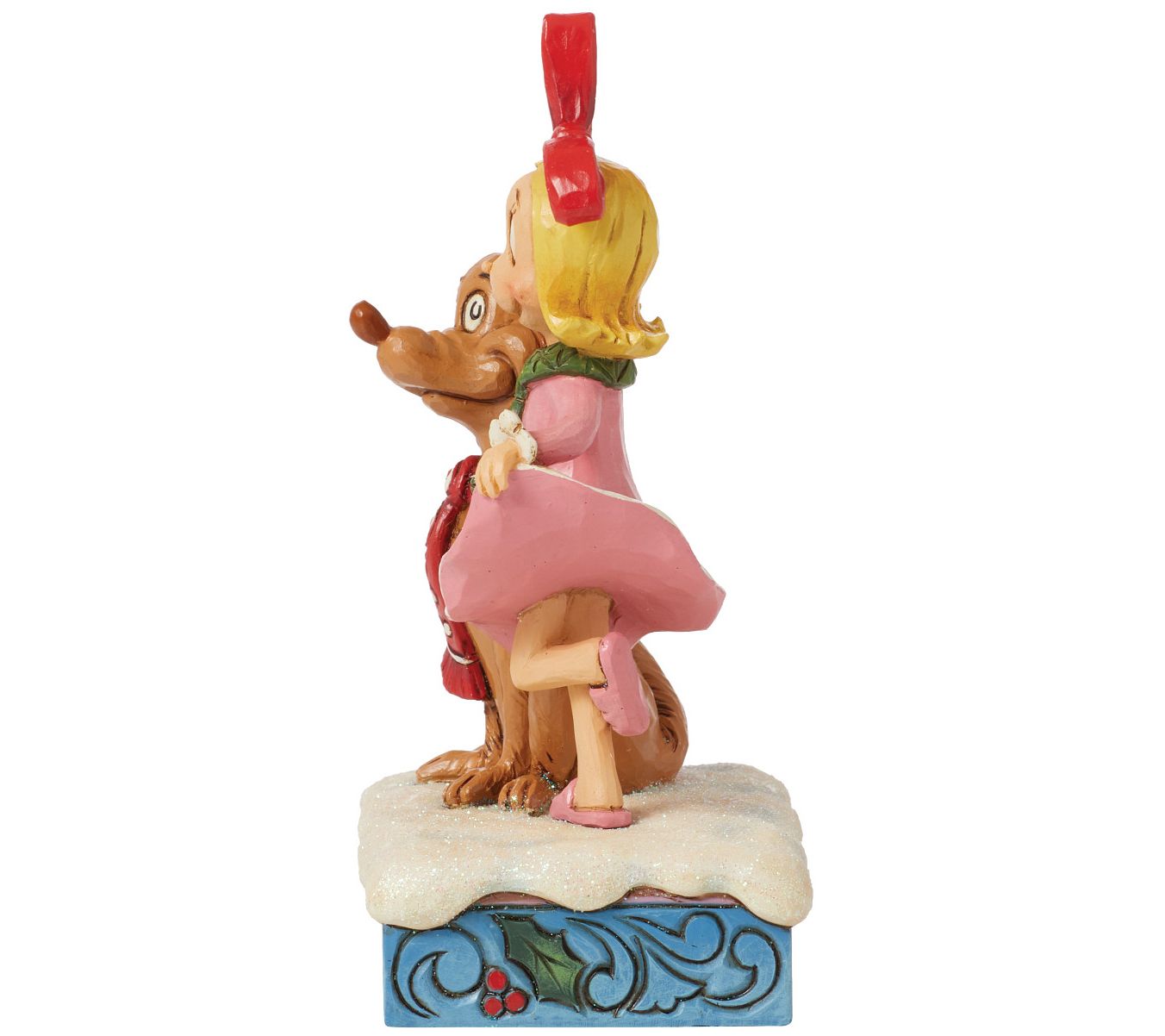 Capture the heartwarming scene of Whoville with this sweet figurine, showcasing Cindy Lou's affection for Max amidst a snowy backdrop. Their charming expressions and festive attire, adorned with rosemale details, are sure to bring a touch of whimsy and warmth to your holiday decor. From Jim Shore.