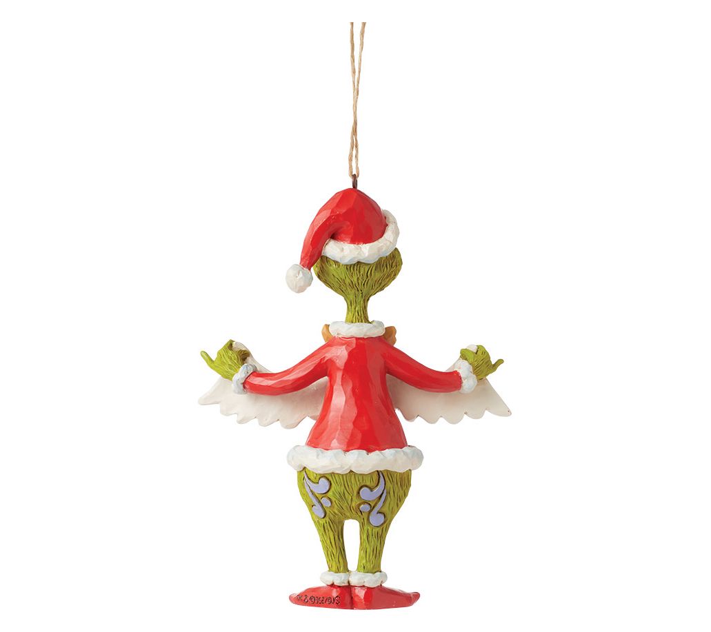 There is always room for a little mischief (and a little holiday cheer) when you hang this ornament on your tree. Featuring the Grinch in his Santa suit and hat, he holds a festive “Merry Christmas” banner and holiday wreath, complete with a jingle bell and rosemale details. Share a playful nod to the season with a character that brings a smile every year. From Jim Shore.