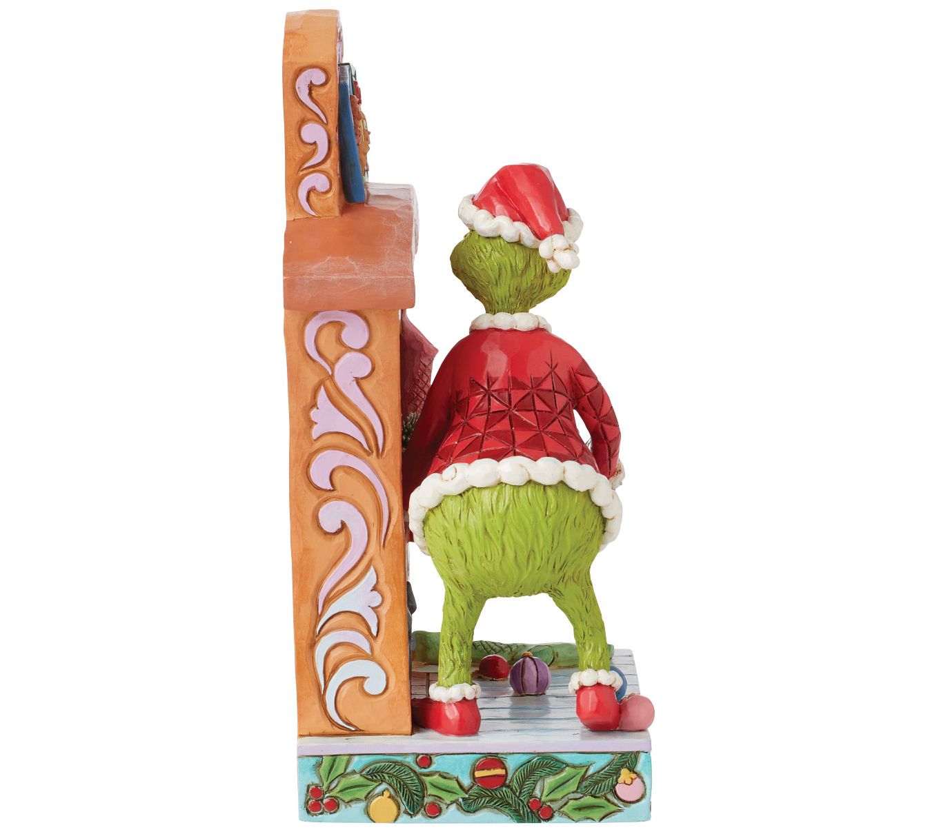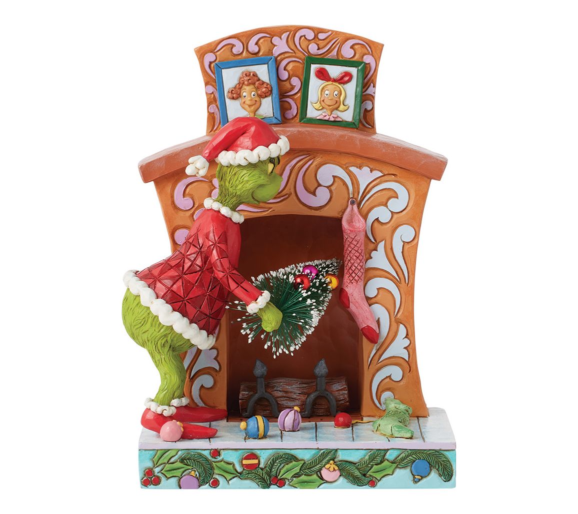 Capture the whimsical spirit of Whoville with the Grinch Pushing Tree Up figurine. This vibrant piece showcases the Grinch, disguised as Santa, in the act of stealing a Christmas tree, complete with rosemale detailed chimney, bringing a touch of mischievous charm to your holiday decor. From Jim Shore.