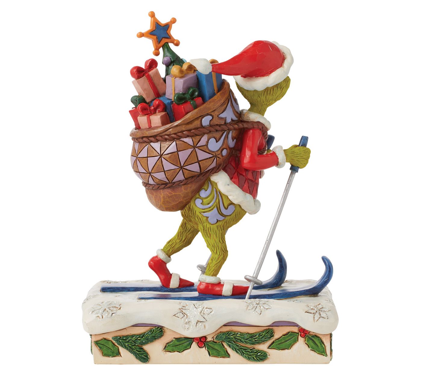 Capture the whimsical charm of the holiday season with the Grinch Skiing figurine. This delightful piece showcases the iconic Grinch, dressed as Santa, cross-country skiing with a bag of gifts and a tree, ready to swipe Christmas cheer from the unsuspecting residents of Whoville. From Jim Shore.