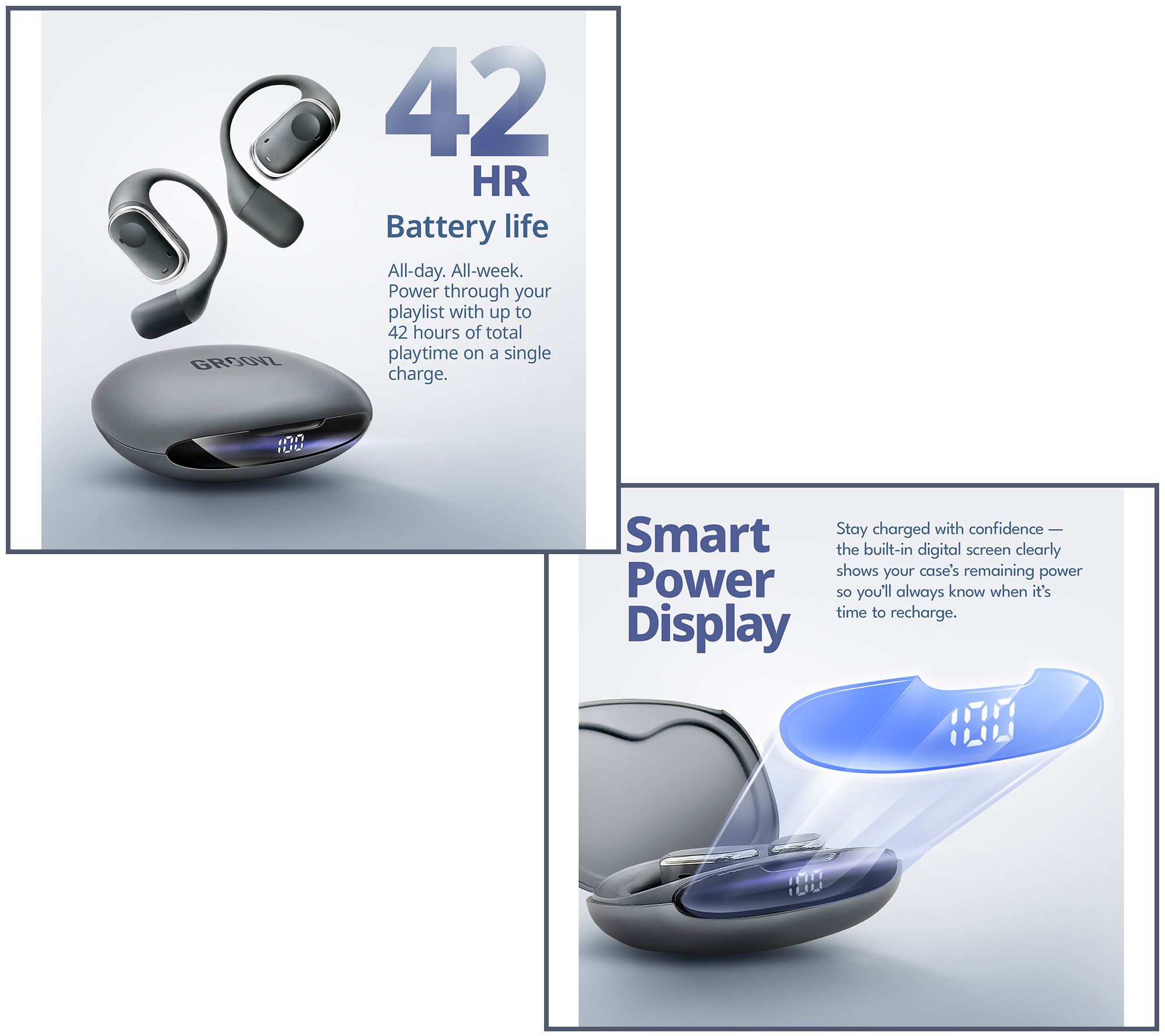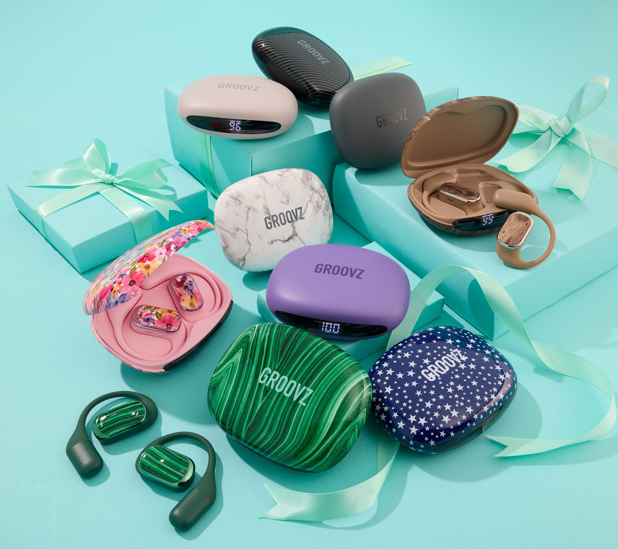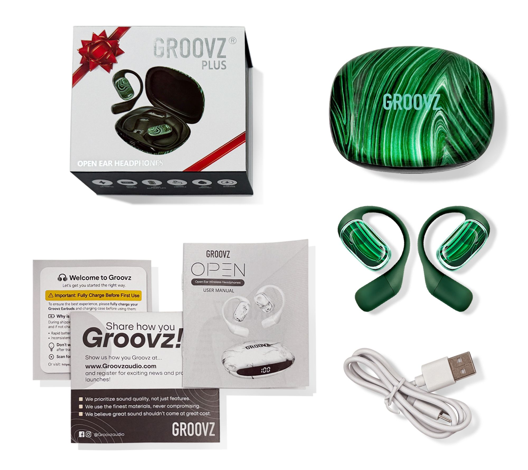 Includes Groovz Plus true wireless open-ear headphones, charging case, and USB-C charging cable