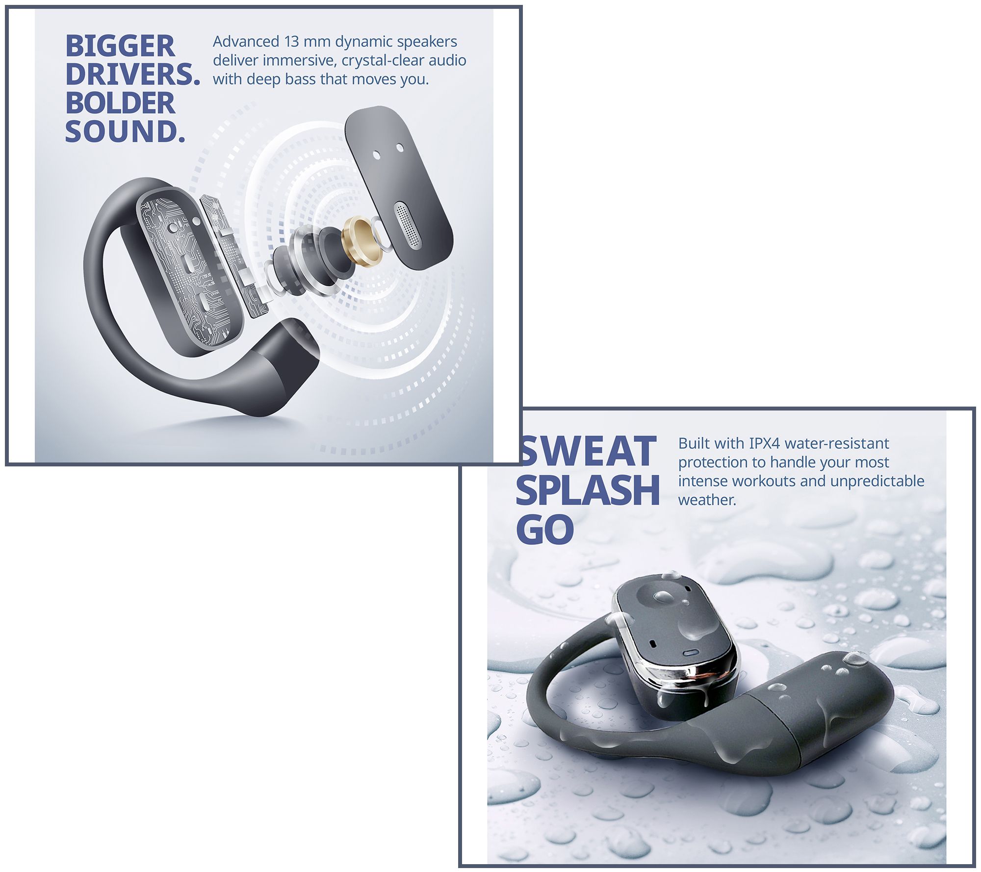 Connect to your sound -- and your surroundings. Groove to bold, immersive sound with touch controls and an open-ear design that allows you to still hear the world around you -- perfect while walking, cooking, or working out. And with a front-facing LED power display, you'll always know when it's time to power up.