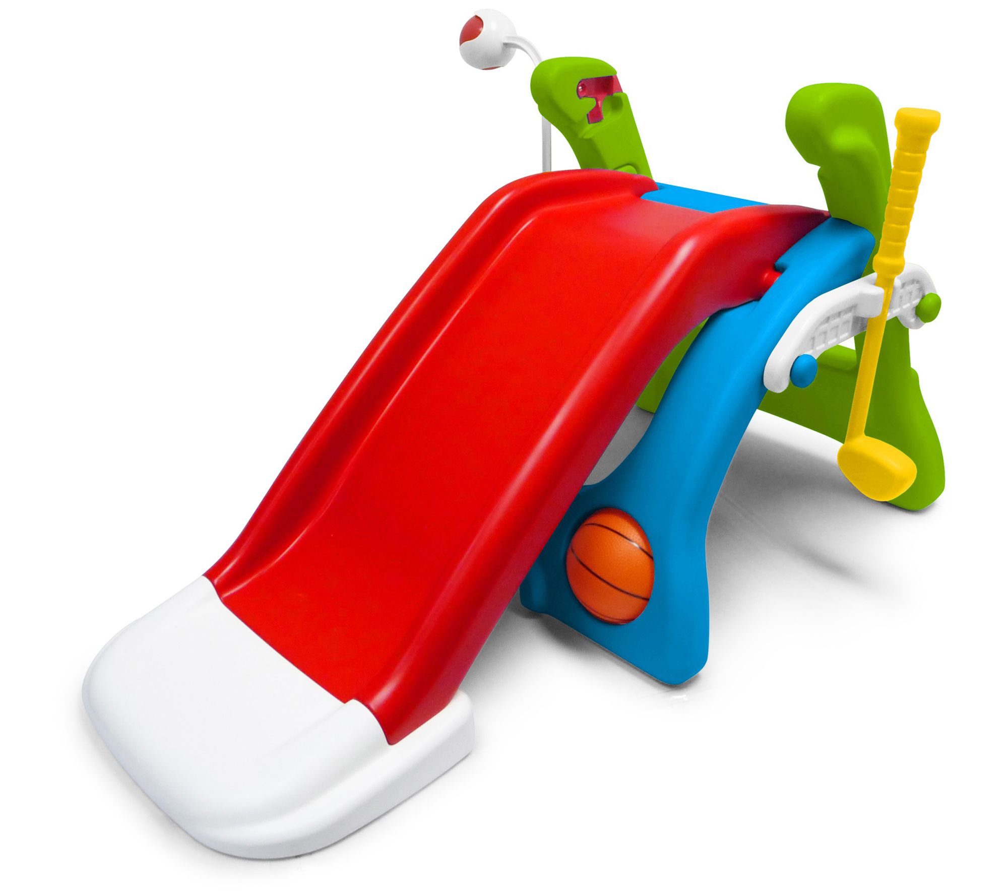 This innovative design allows toddlers to try basketball, soccer, baseball, golf, T-ball, and slide play. From Grow 'N Up.