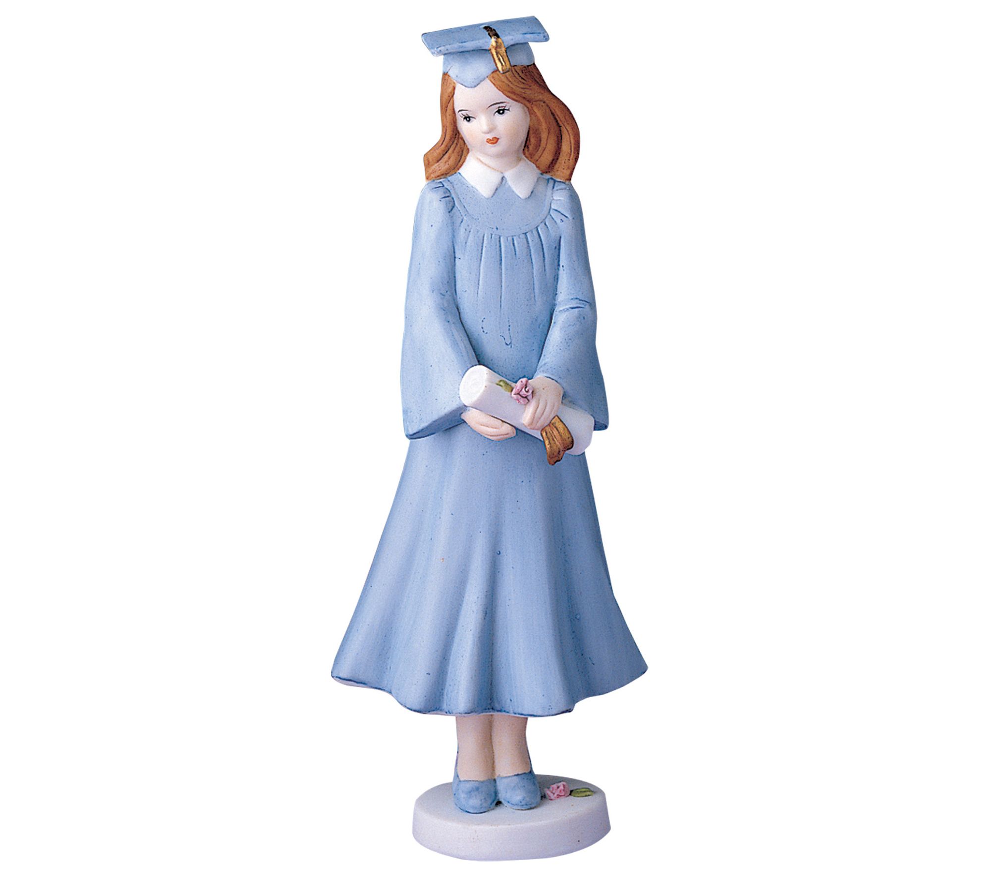 Celebrate the milestone of graduation with this charming Growing Up Girls brunette graduate figurine. Dressed in a blue cap and gown and holding her diploma with pride, she stands on a small pedestal adorned with a delicate rose, symbolizing both achievement and elegance. Perfect as a gift or a keepsake to commemorate this special occasion. From Growing Up Girls.