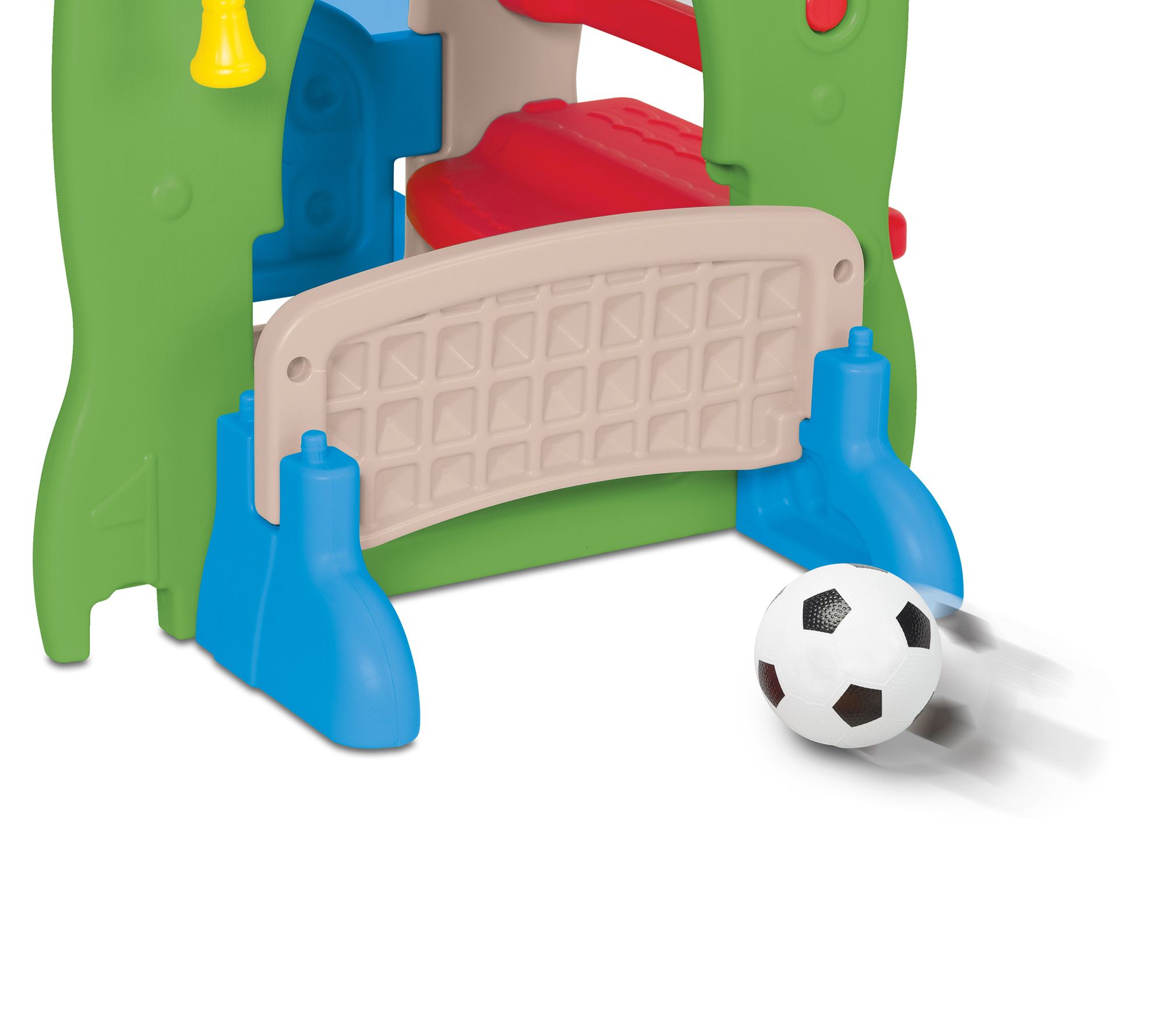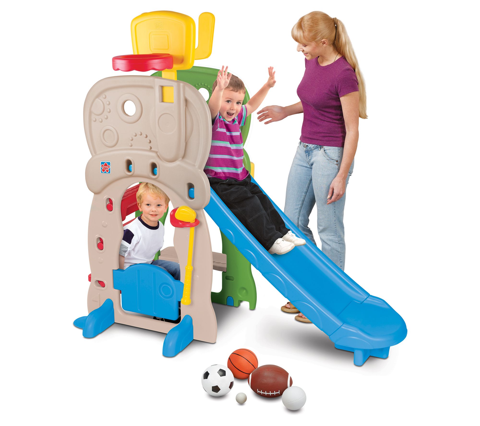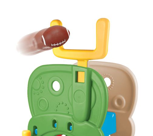 Your little sports star can practice their skills and have hours of enjoyment when you set up this 5-in-1 kiddie clubhouse featuring a variety of activities and a fun five-foot slide. From Grow'n Up.