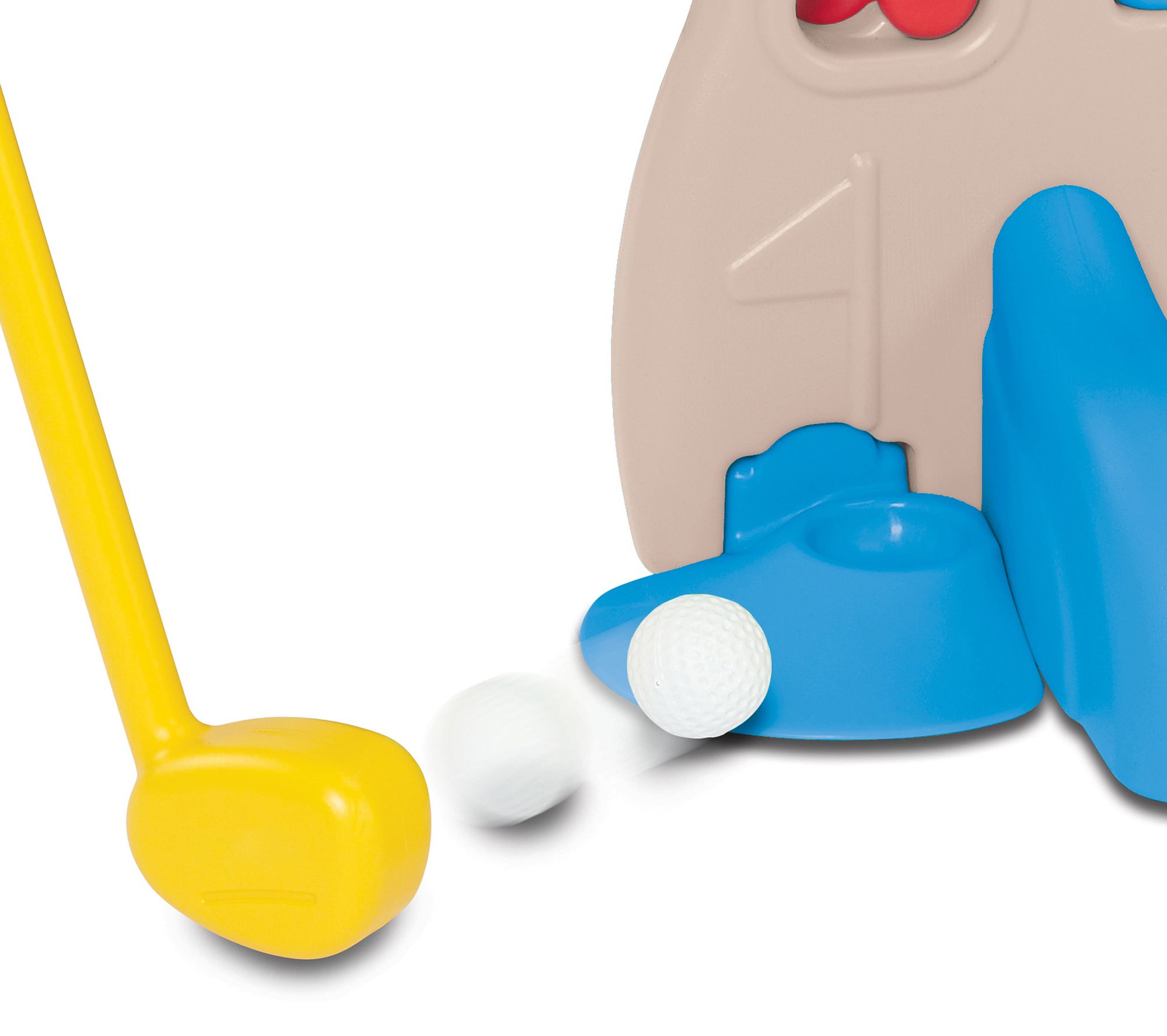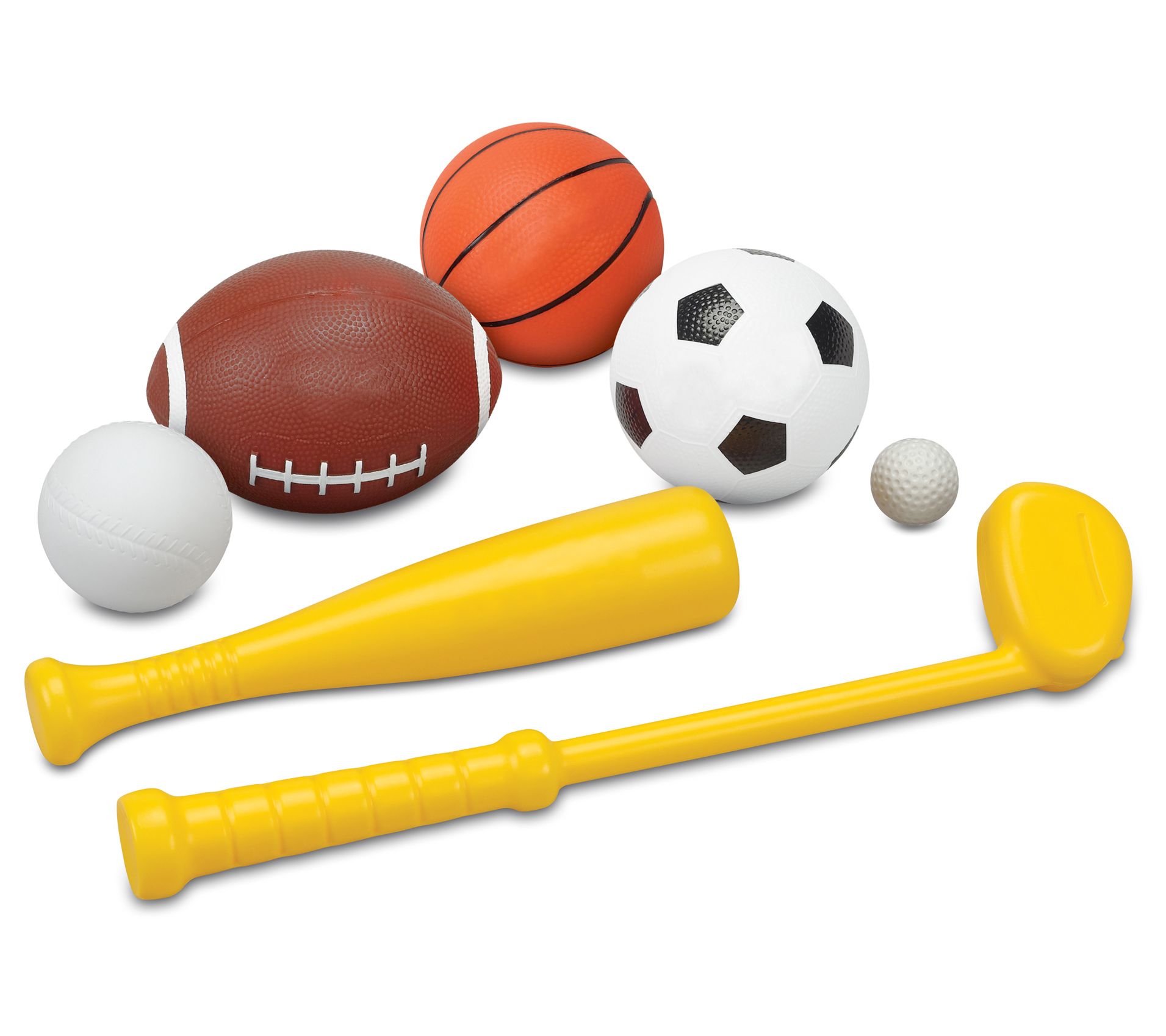 • Includes playset with baseball bat, golf club, baseball, football, soccer ball, basketball, golf putting hole, and golf ball