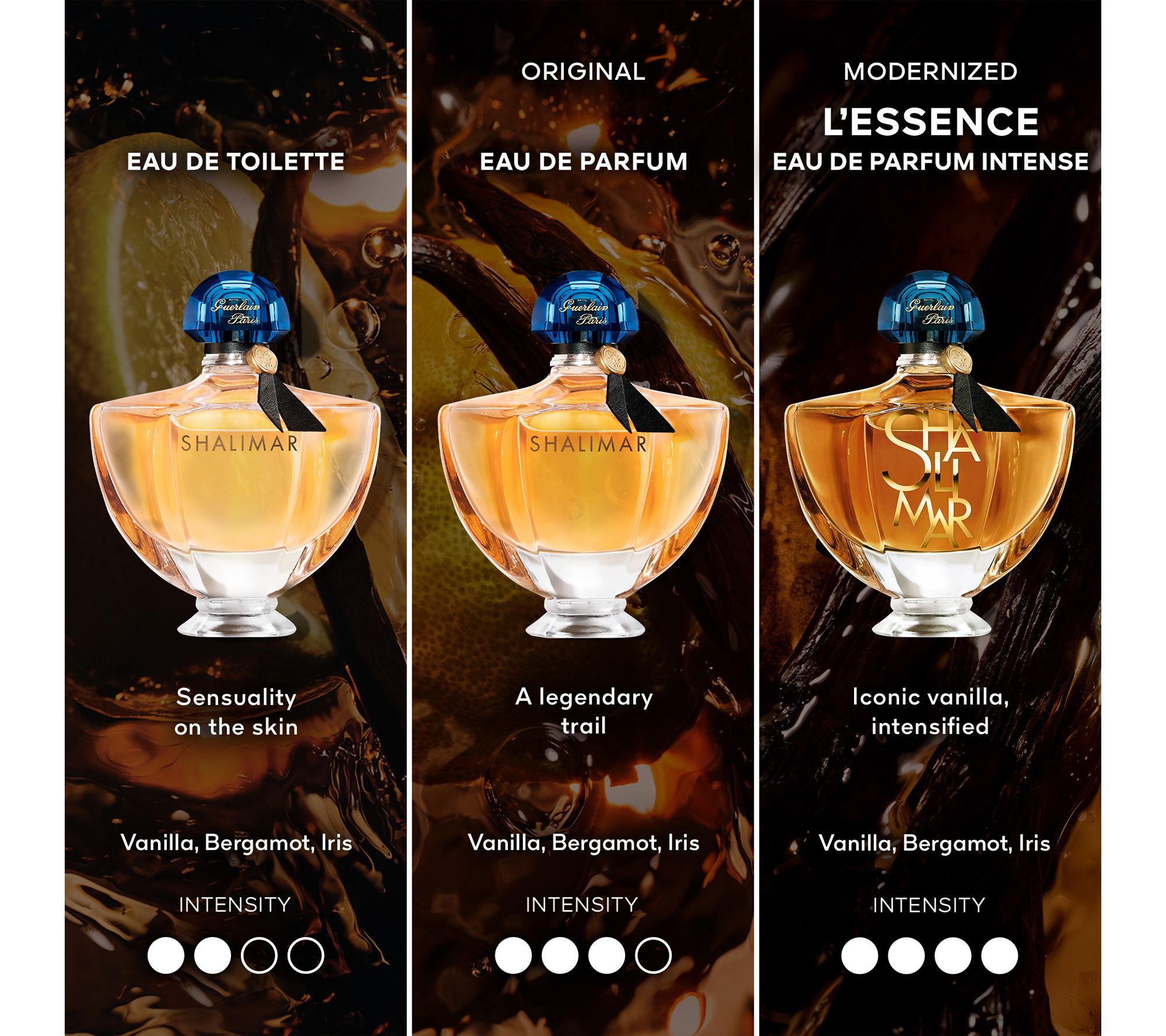 An intense vanilla perfume for women, Shalimar L'Essence celebrates Shalimar's 100th anniversary in an intense and contemporary variation. A flood of warm vanilla combines with bergamot and iris in a perfume that embodies sensuality.