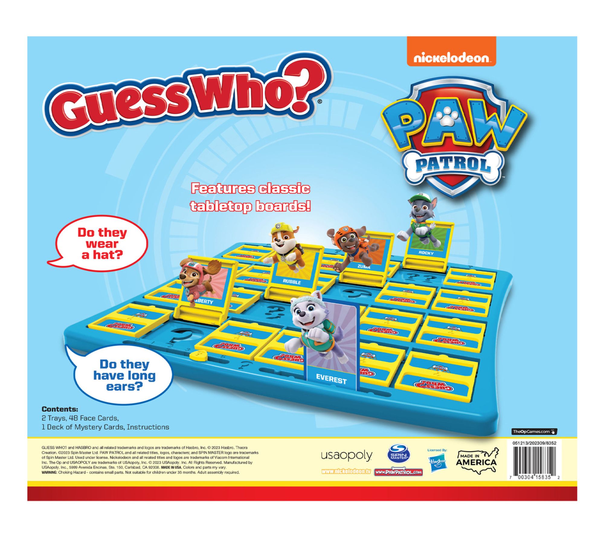 • Includes two classic tabletop game trays, 48 PAW Patrol face cards, one deck of PAW Patrol mystery cards, and instructions