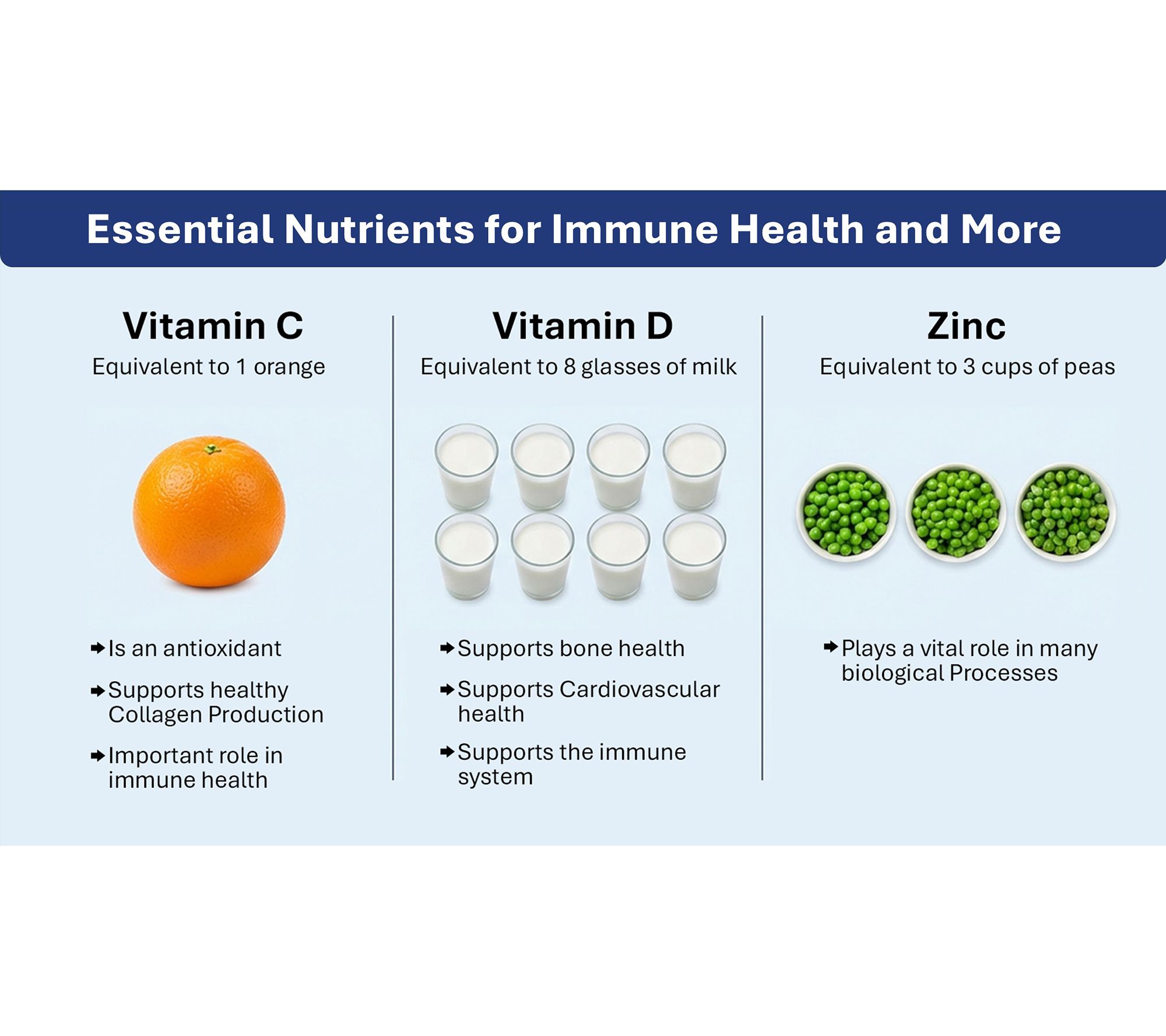 Vitamin D supports the immune system, calcium absorption and bone health, and cardiovascular health