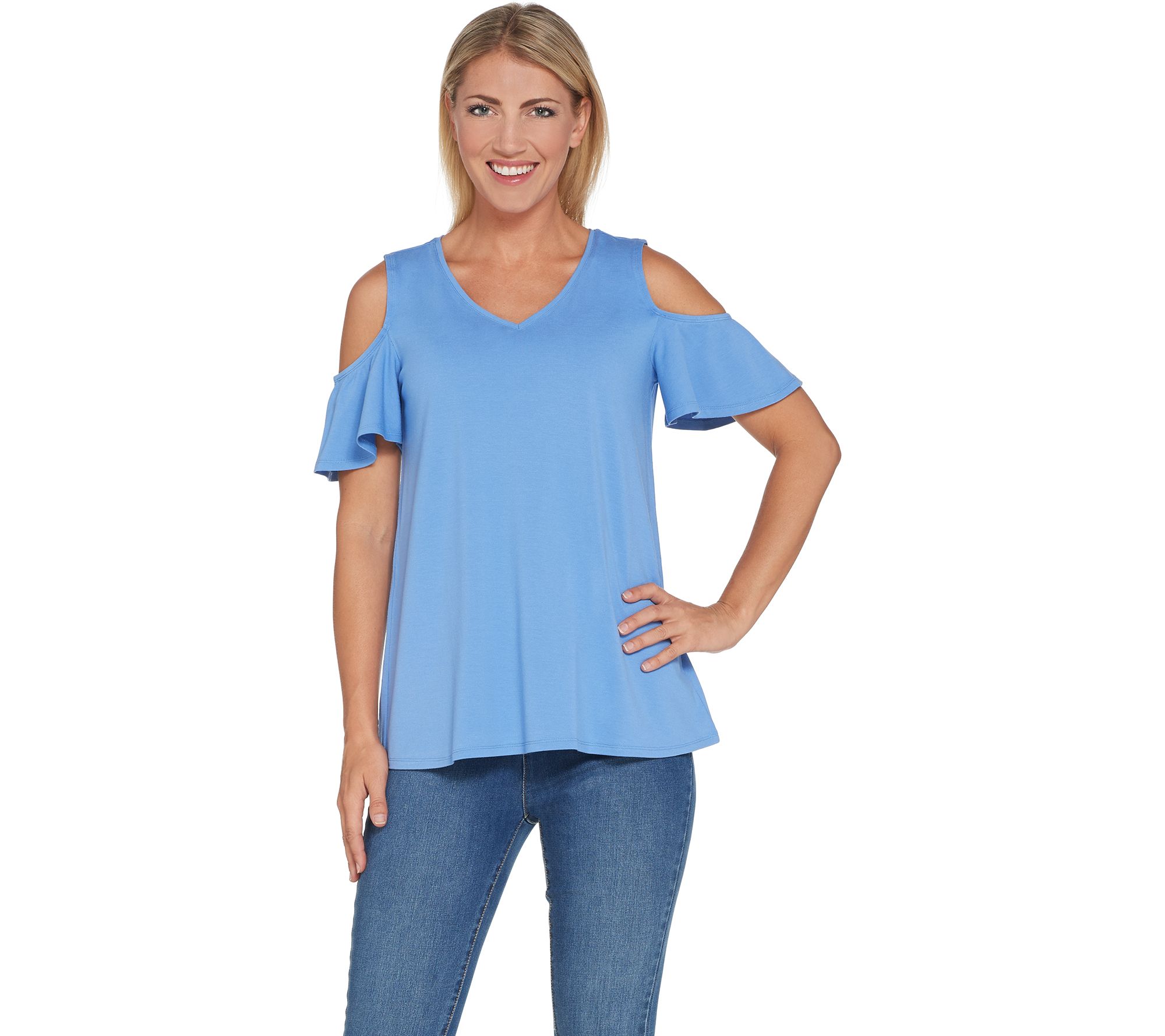 Cold-shoulder details add a little touch of fashion-forward flair to this easy-wearing everyday crepe knit top. From H by Halston.