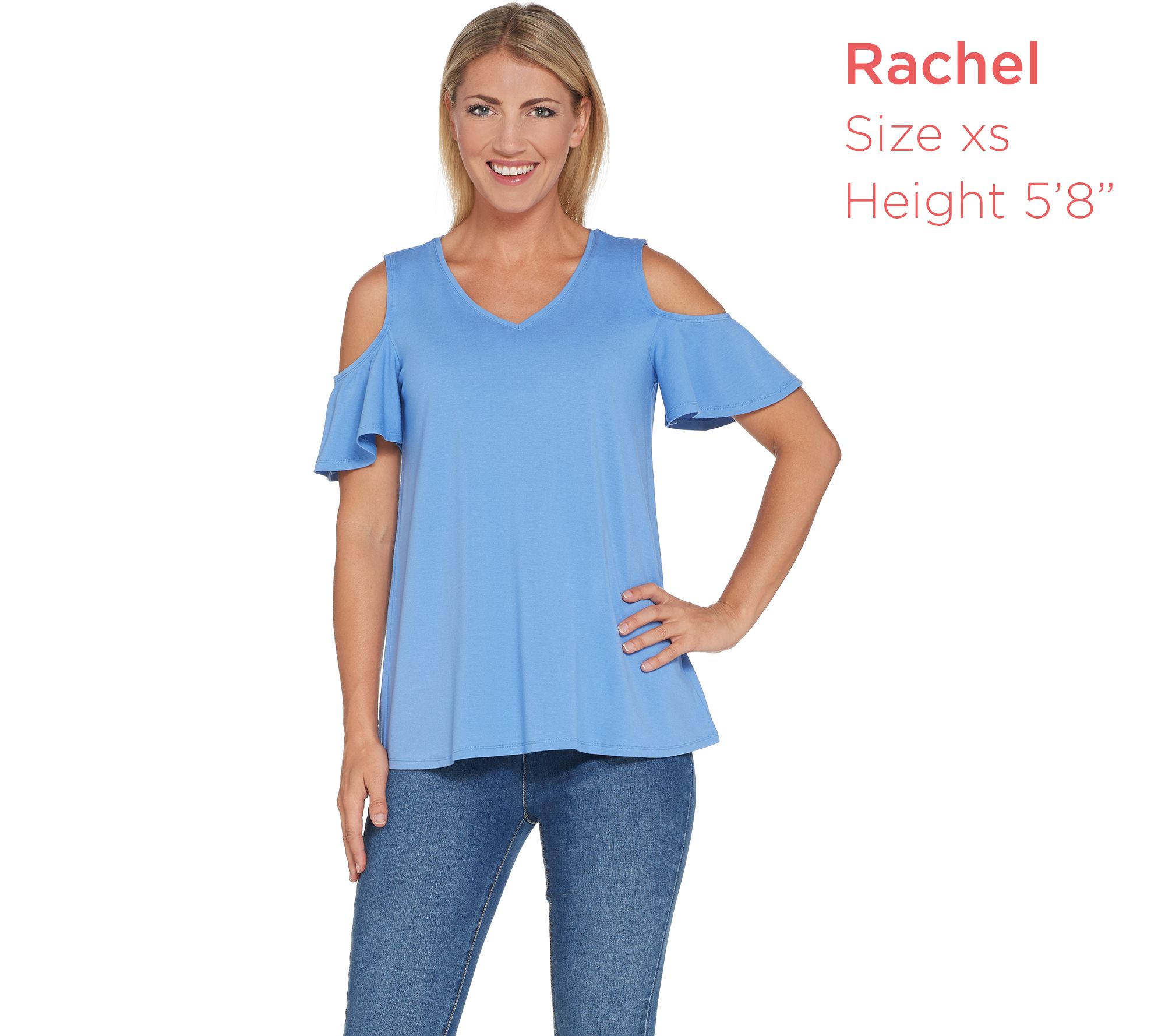 - Features: V-neckline, ruched short sleeves, cold-shoulder details