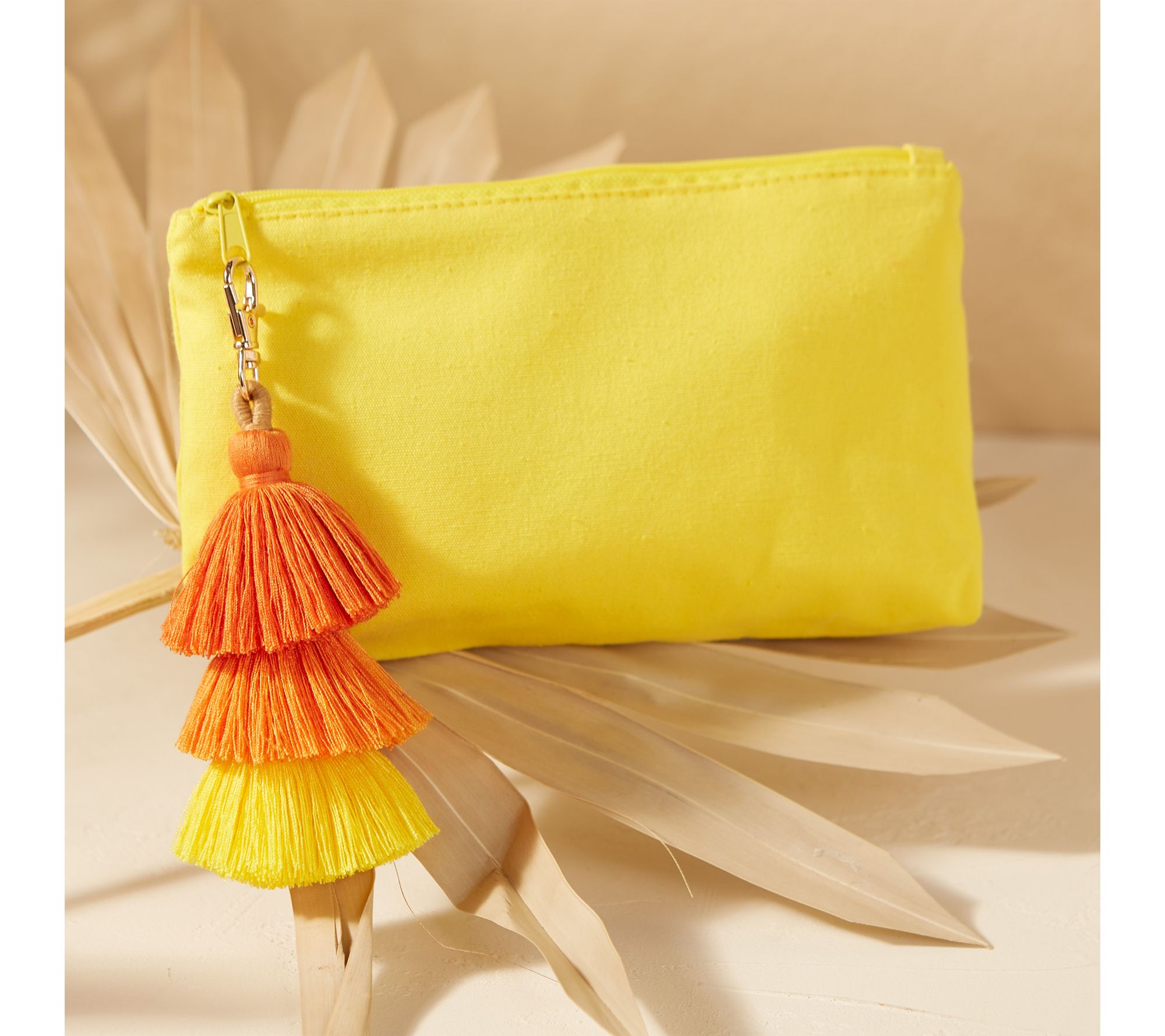 Switching bags for date night or organizing your must-haves for a weekend away, this pouch keeps essentials stylishly within reach. A detachable ombre tassel charm elevates the look, while the zip-top closure and lightweight polyester build ensure convenience at every stop along your day. From Hadley Wren.