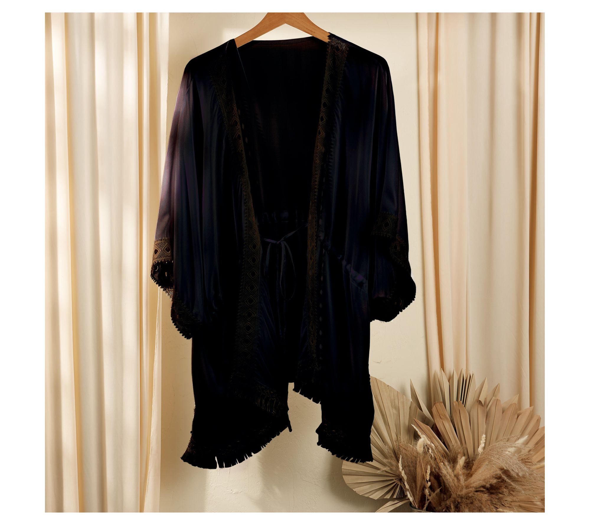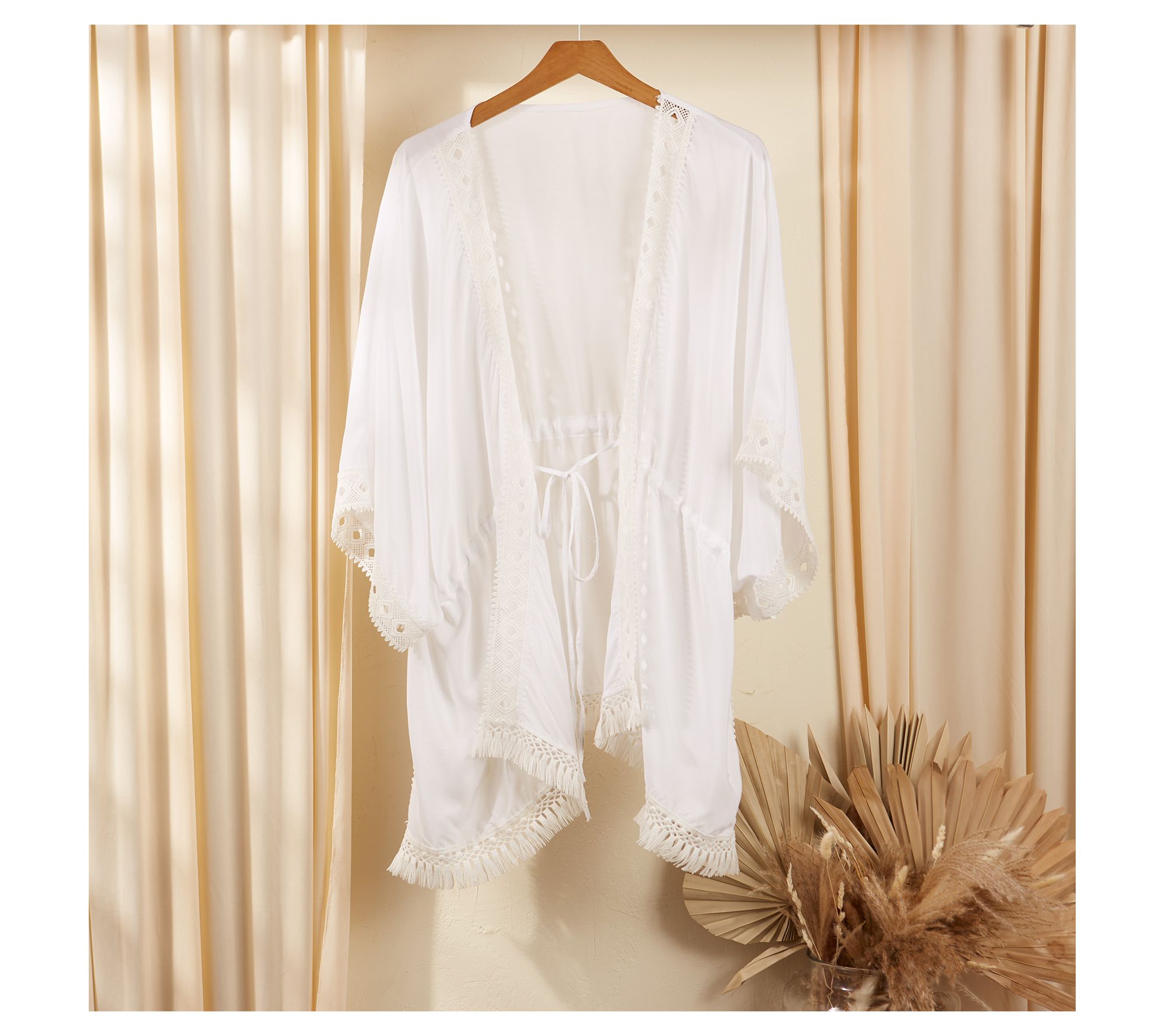 Whether you are heading to the pool or planning a sun-soaked lunch al fresco, this breezy cover-up kimono brings effortless sophistication to every summer adventure. Eyelet trim is matched by a fringe-finished hem, while the mid-tie drawstring shapes a flattering silhouette for any occasion. From Hadley Wren.