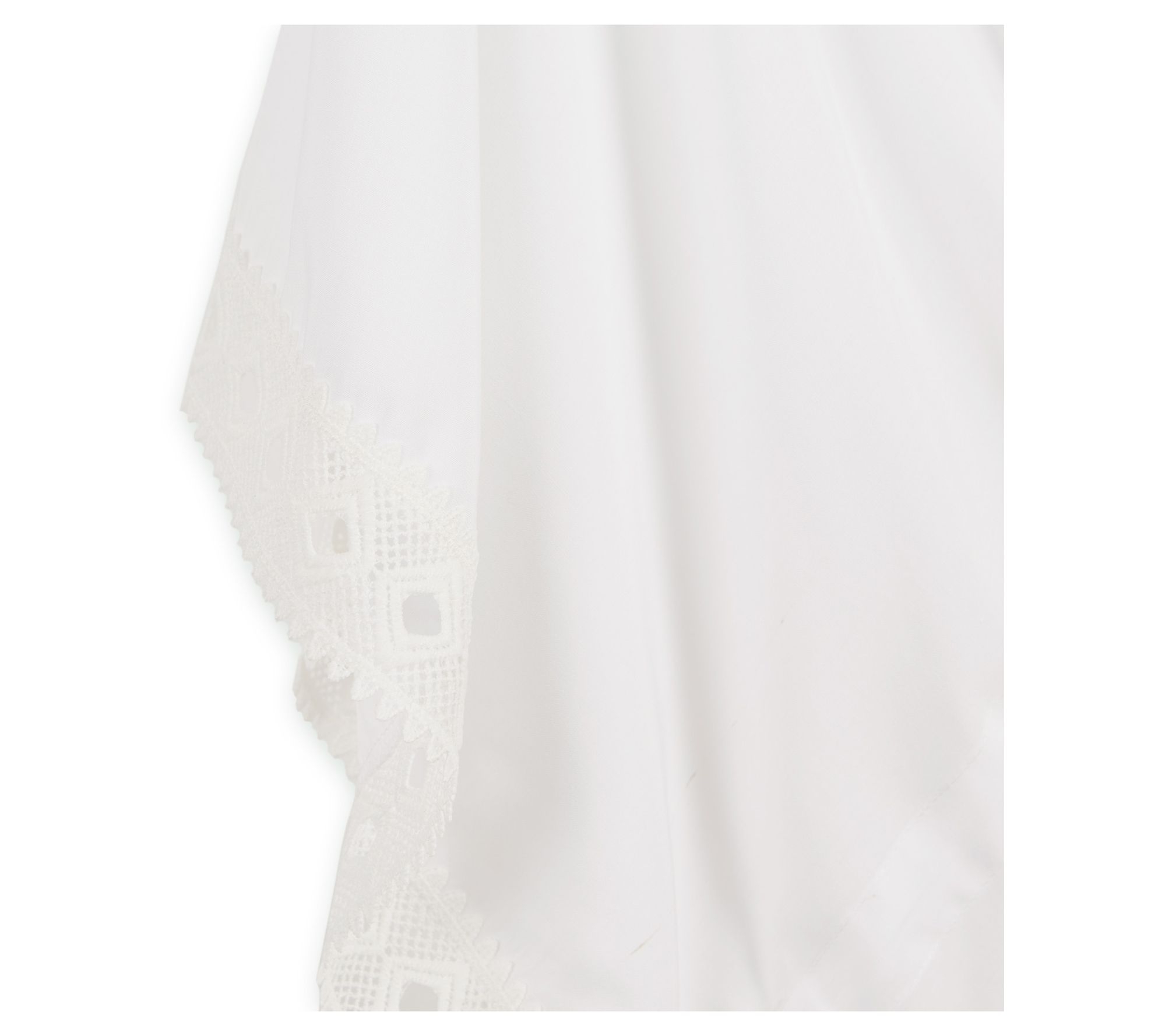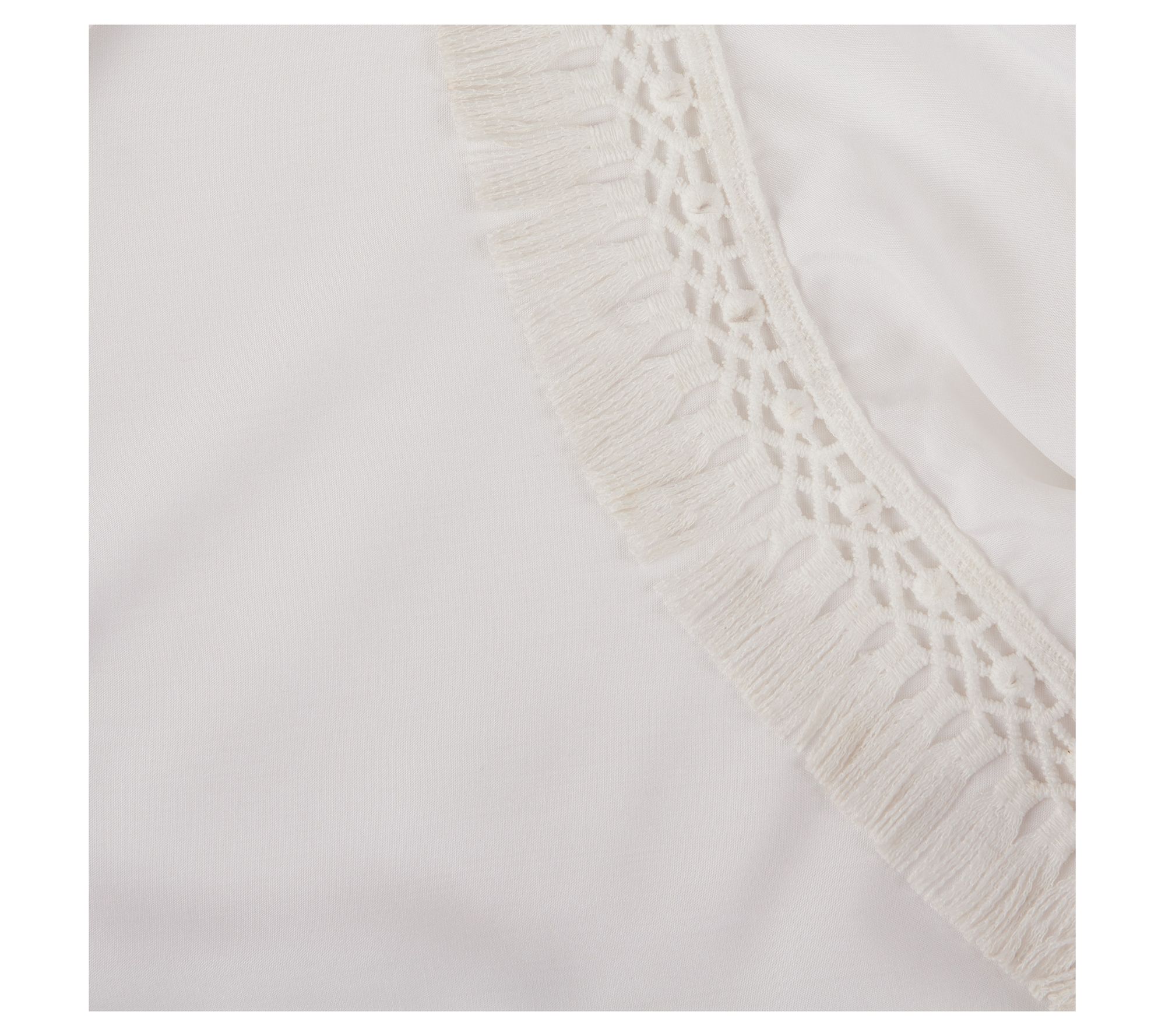 • Features: crew neckline, no collar, three-quarter sleeves, mid-tie drawstring at waist, intricate eyelet detail trim along front and around sleeves, delicate fringe around bottom hem
