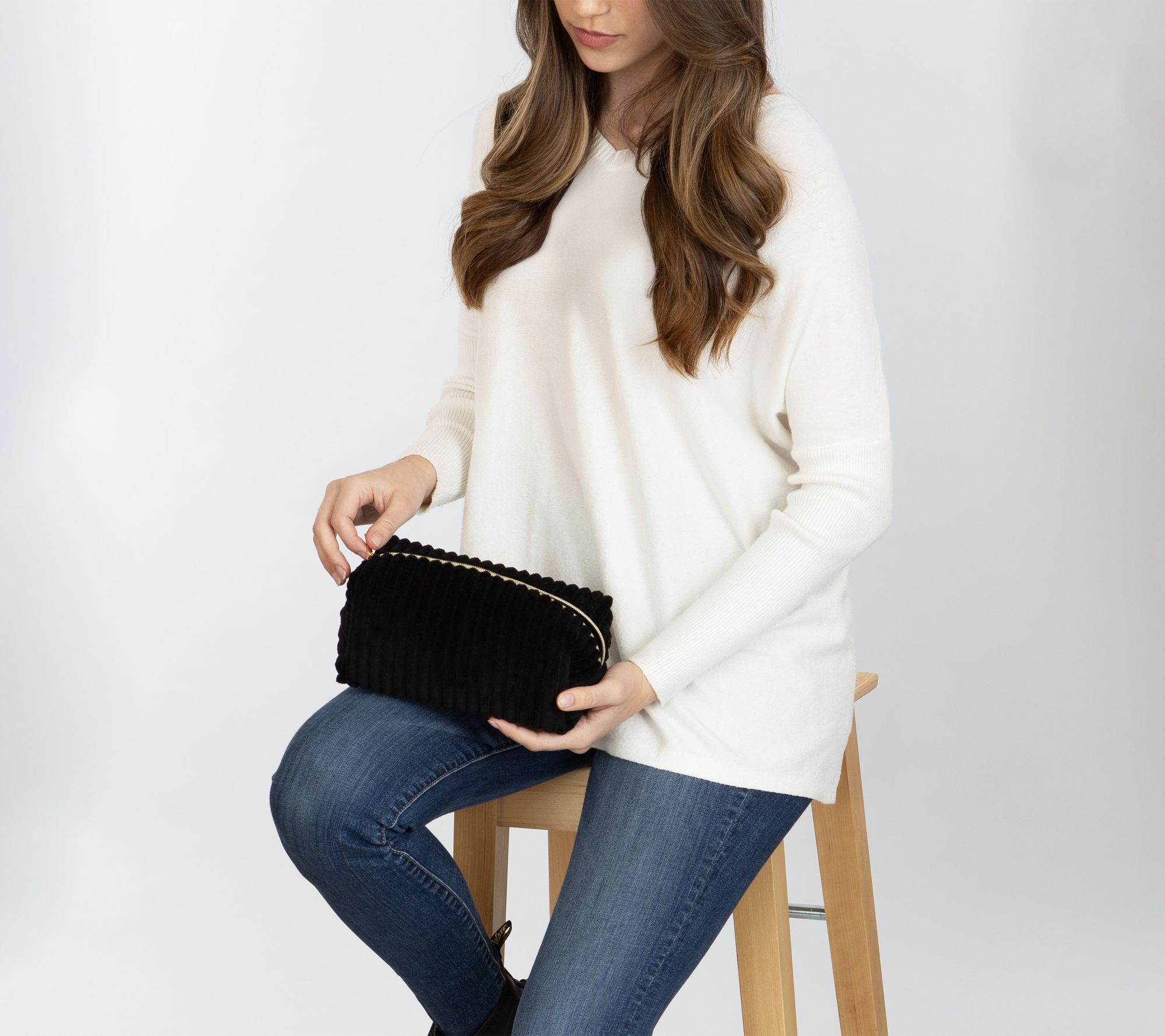 • Plush, wide whale corduroy exterior, goldtone metal zipper