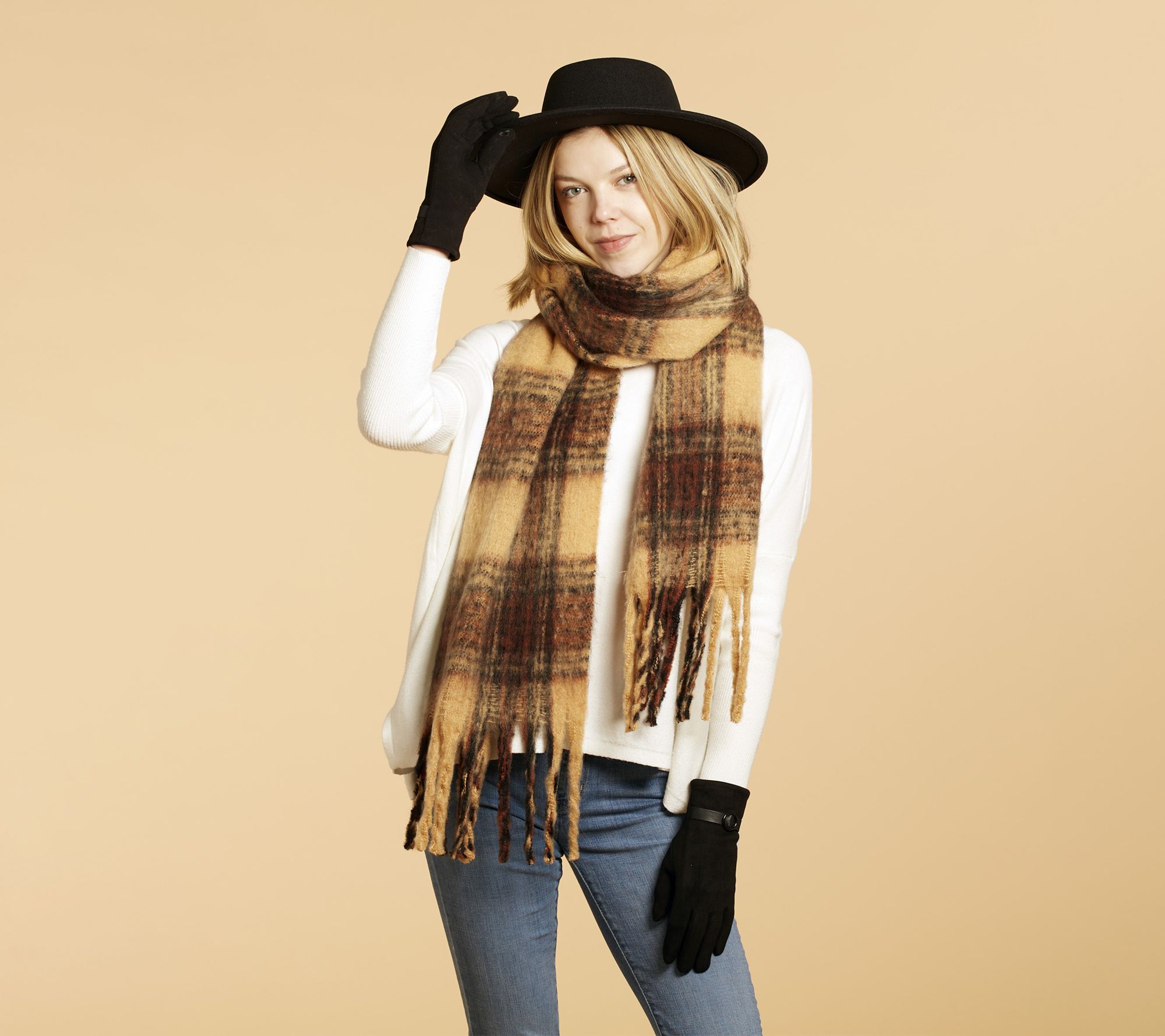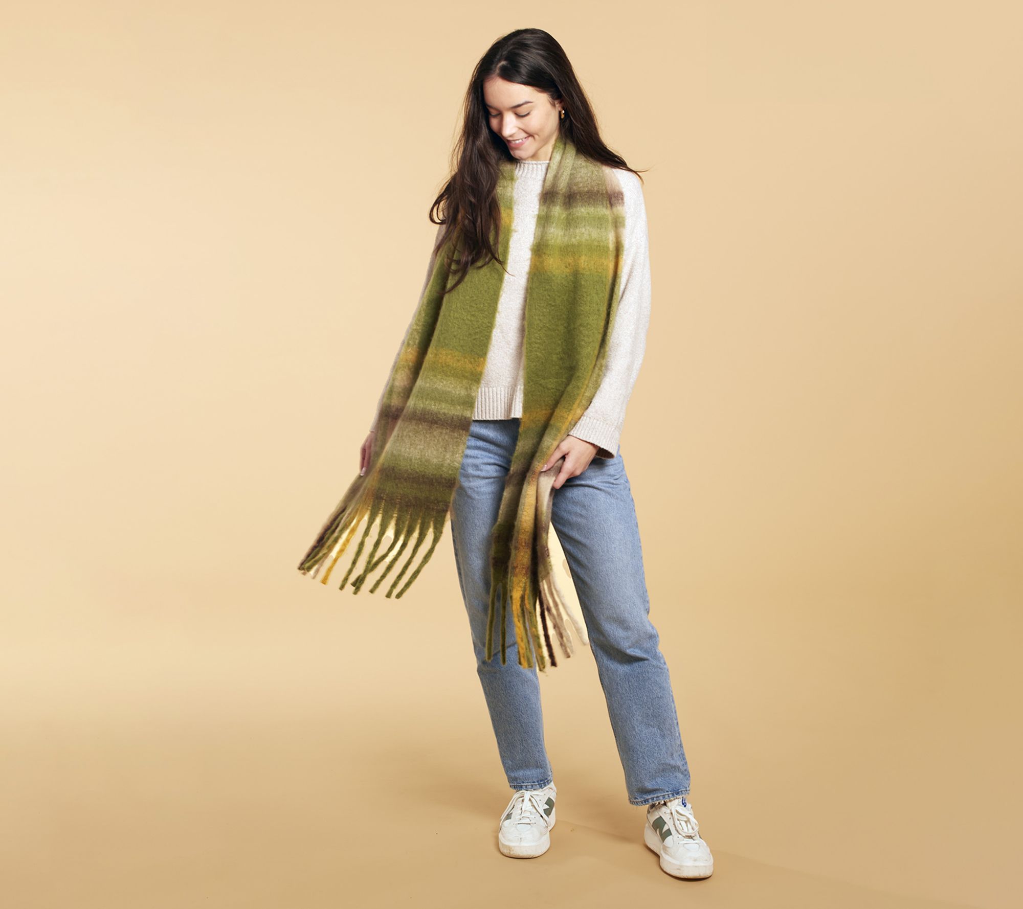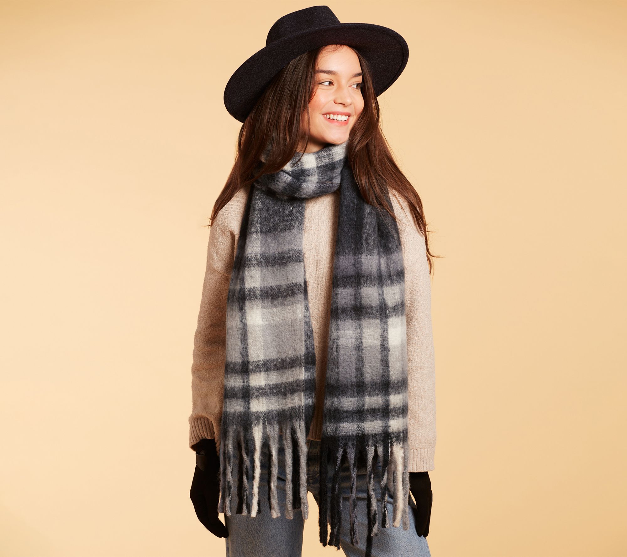 Chilly strolls and crisp days call for a layer of comfort, and this Cozy Plaid Scarf delivers warmth in style. With its generously-sized woven design and playful fringe detail, it's easy to bundle up for morning commutes or outdoor gatherings. This statement accessory adds a cheerful pop to any fall or winter outfit. From Hadley Wren.