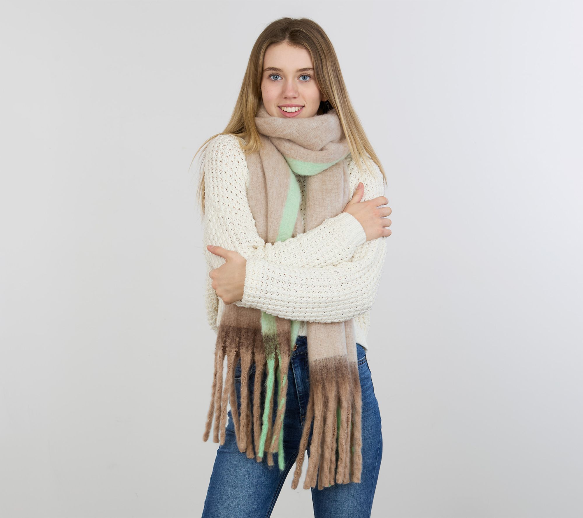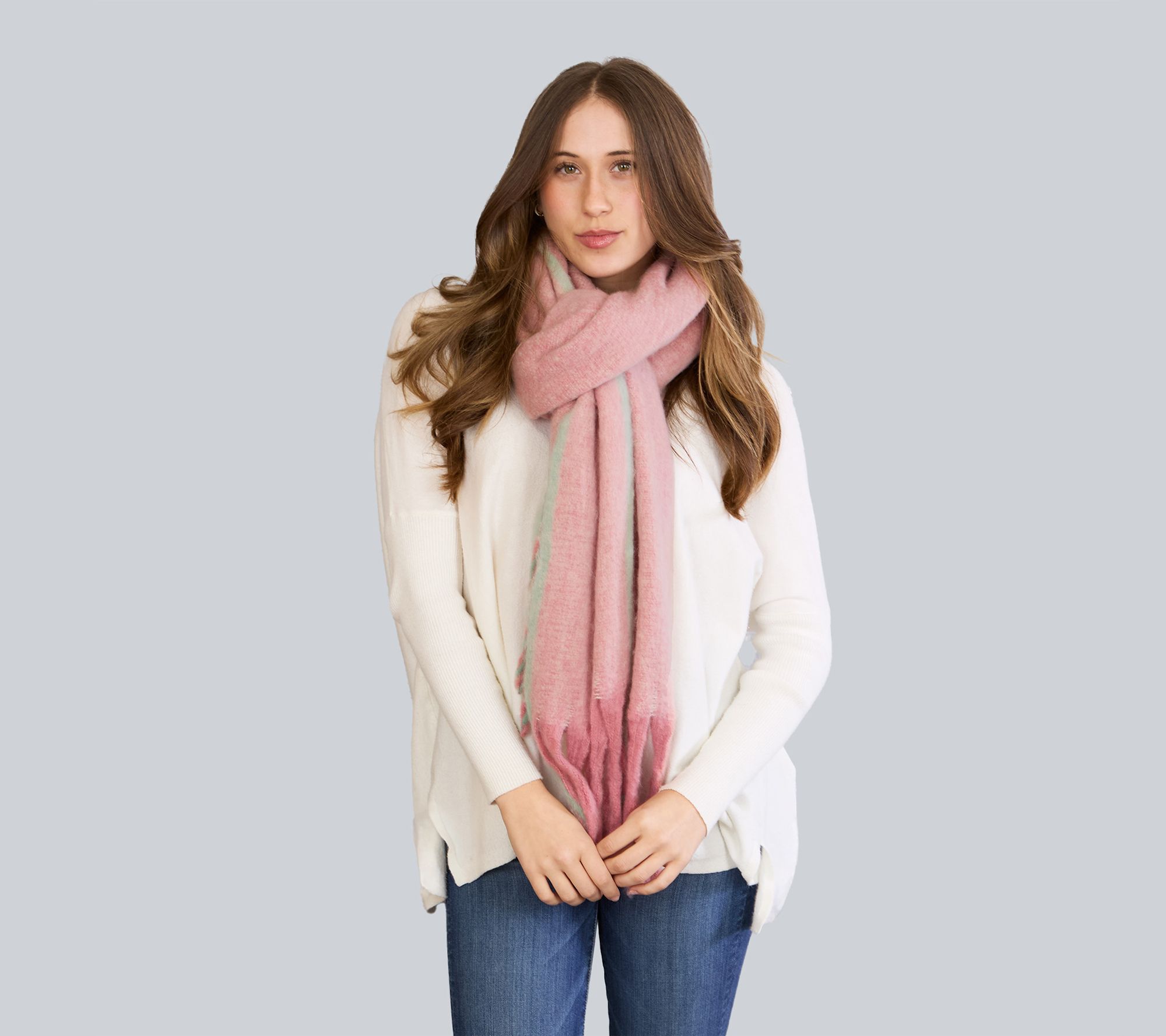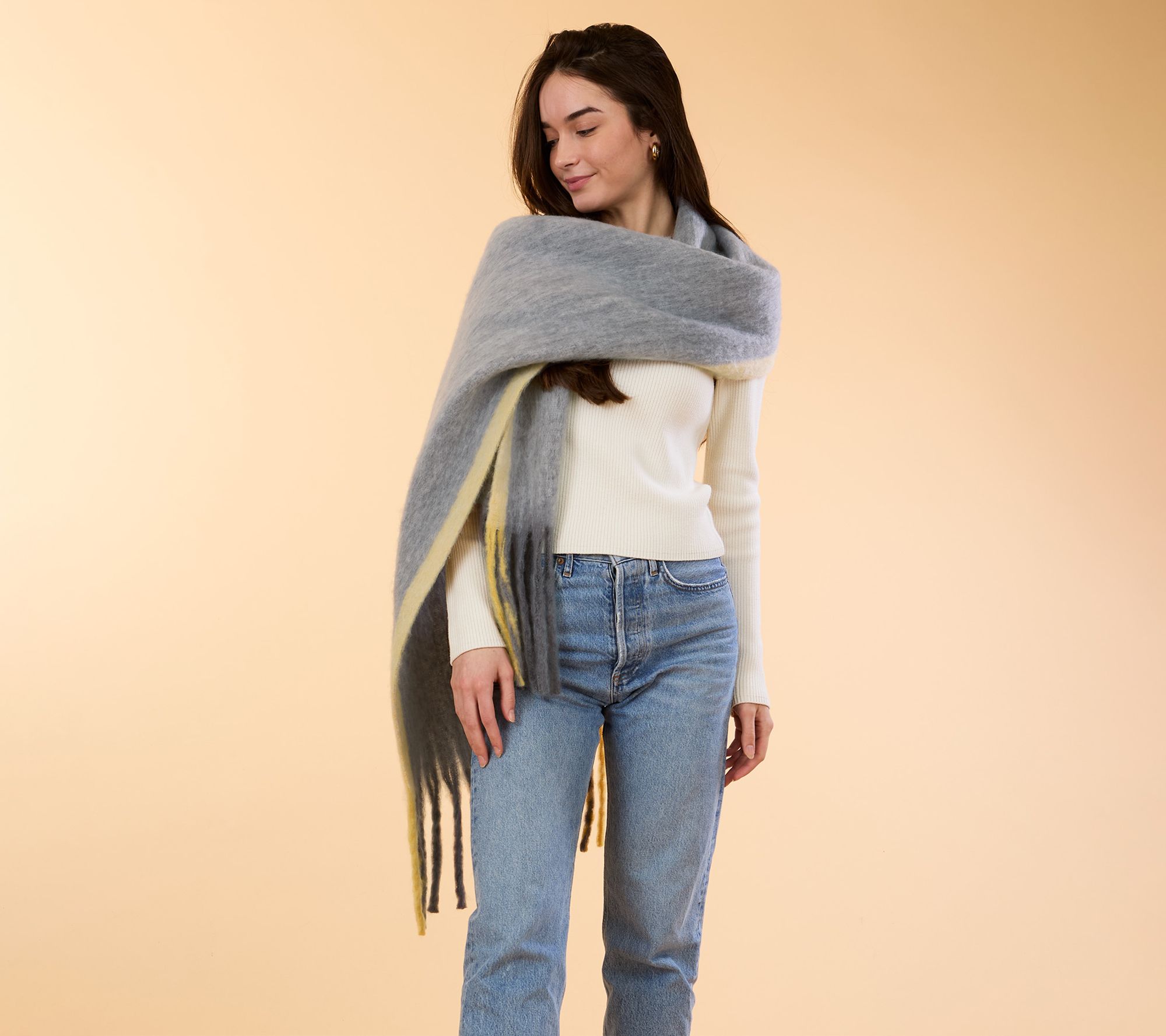 Add a bold touch to chilly days with this woven scarf, featuring striking side stripes and long fringe that bring movement and style to every outfit. Its generous size lets you drape, wrap, or layer with ease, making it a must-have accessory for cozy strolls or brisk commutes. From Hadley Wren.
