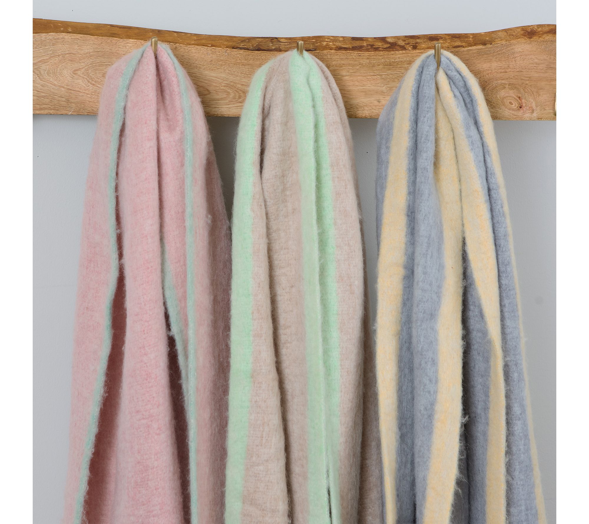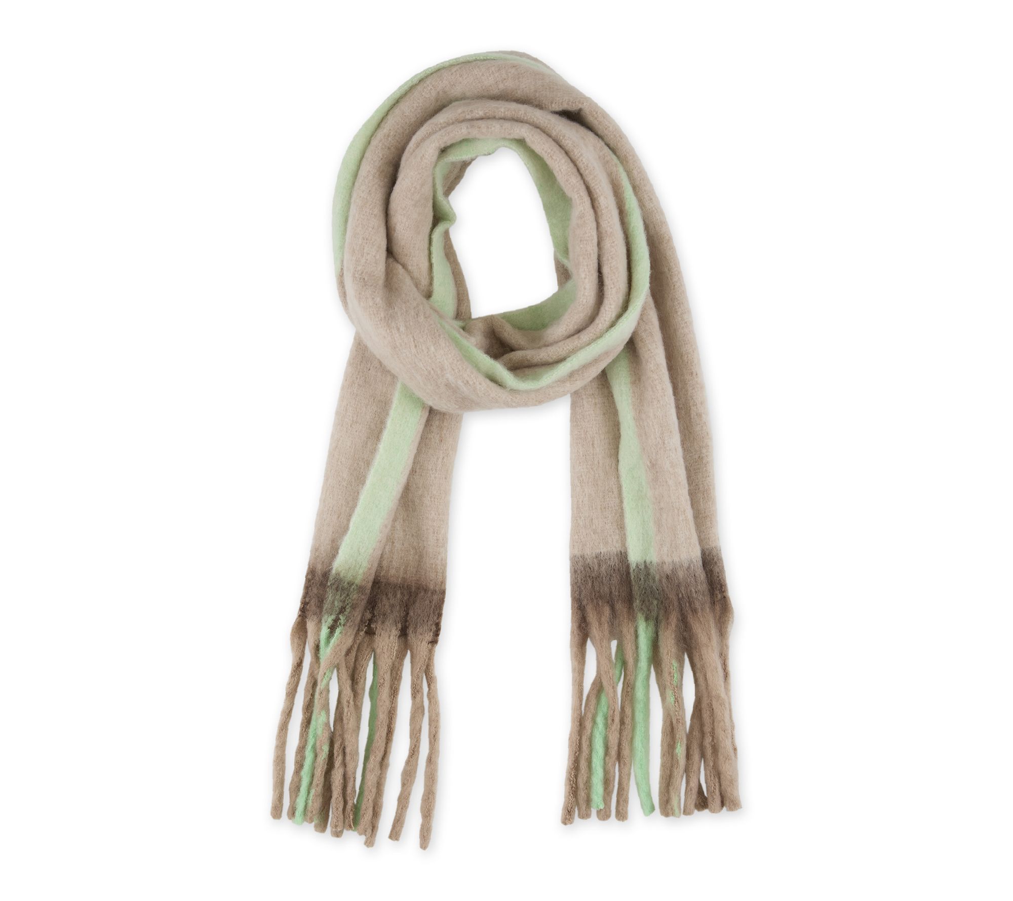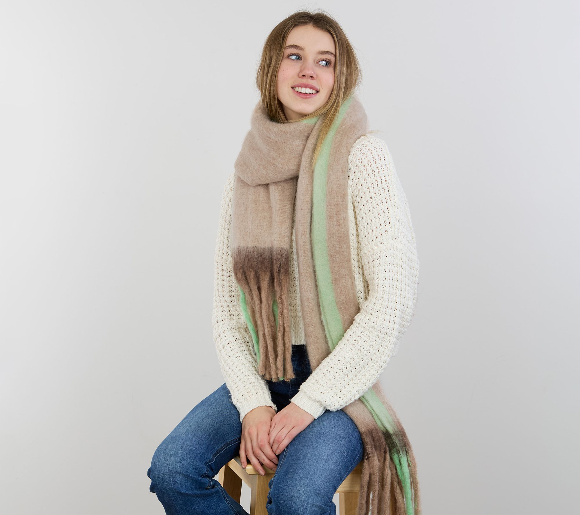 Add a bold touch to chilly days with this woven scarf, featuring striking side stripes and long fringe that bring movement and style to every outfit. Its generous size lets you drape, wrap, or layer with ease, making it a must-have accessory for cozy strolls or brisk commutes. From Hadley Wren.