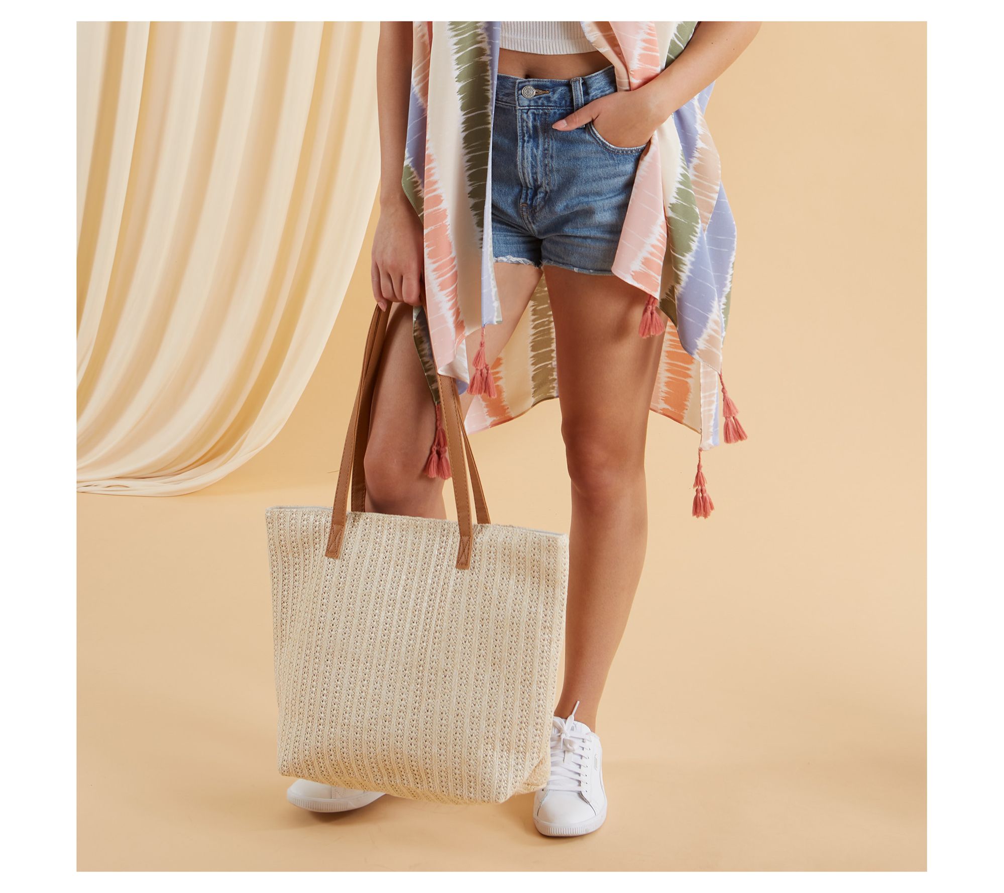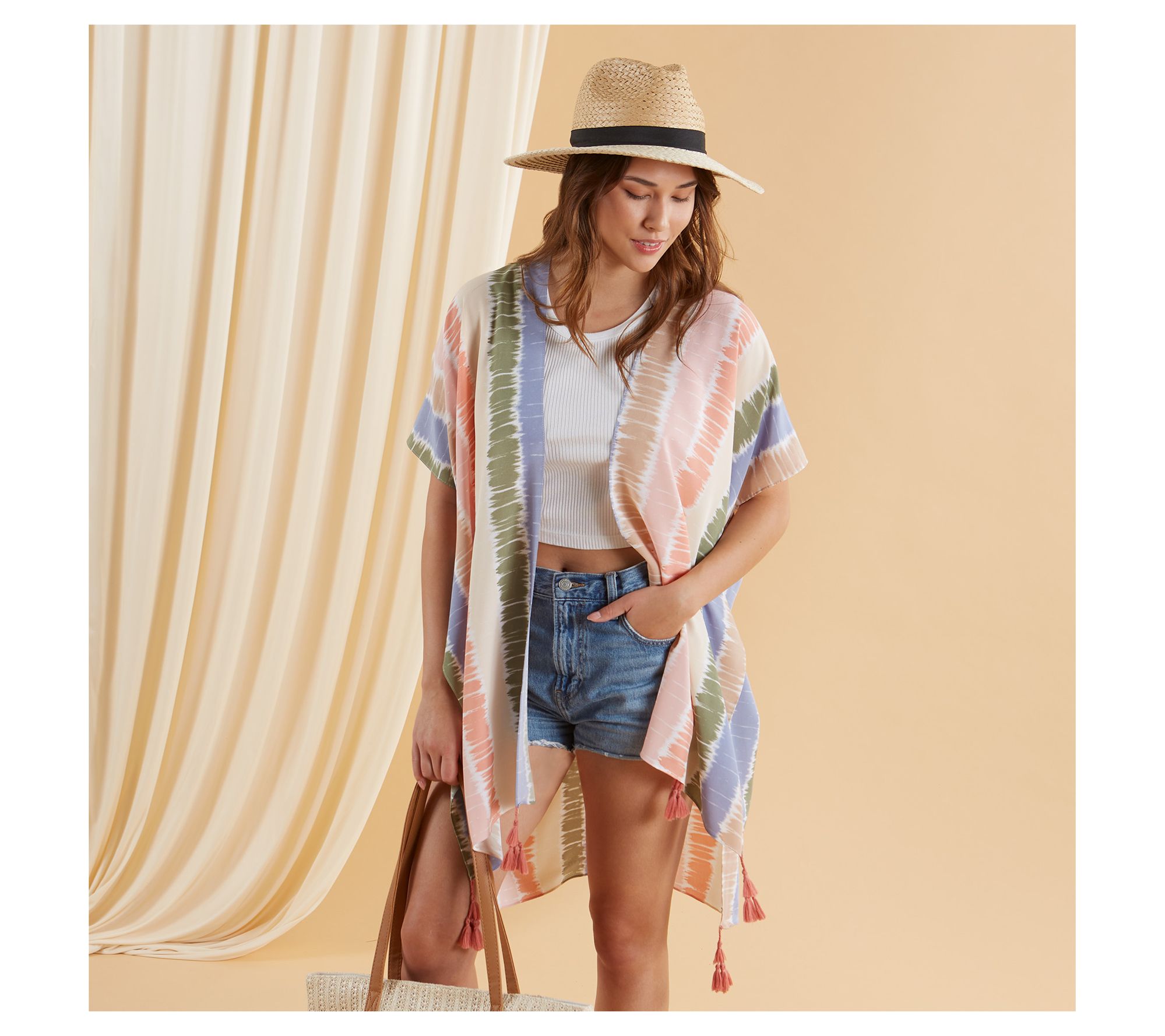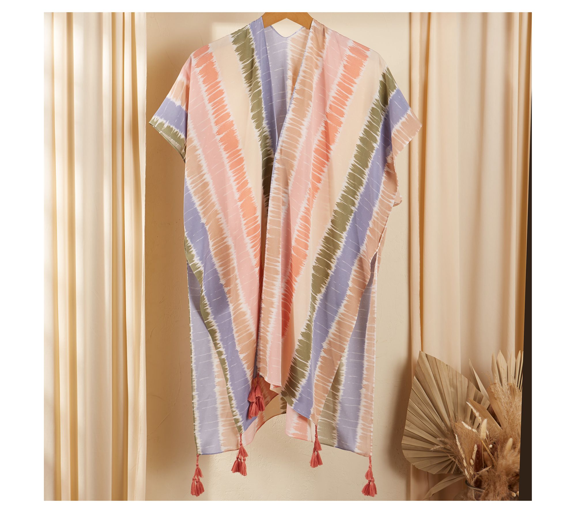 Sunny days turn effortlessly chic thanks to this woven kimono cover-up -- an easy layer that takes you from lounging poolside to sunset dinner without missing a beat. Wide, airy sleeves and decorative tassel accents offer comfort and flair, making it your go-to for warm weather adventures. From Hadley Wren.
