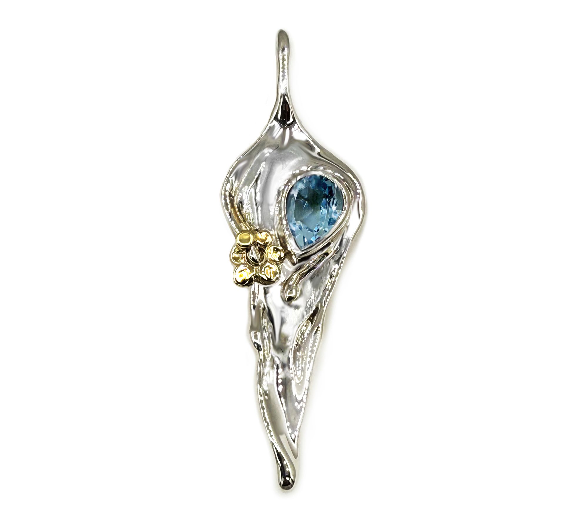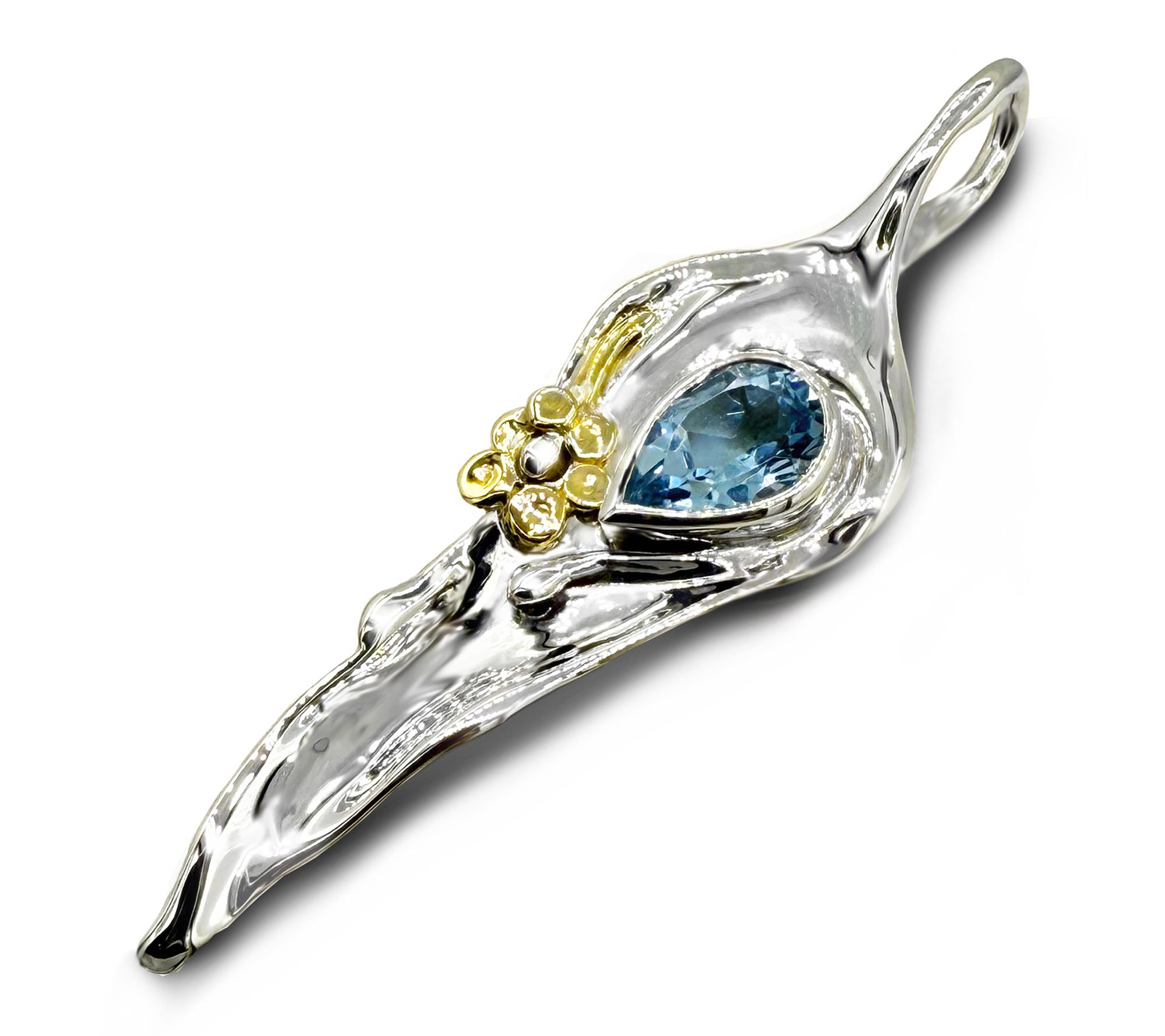 Enjoy standout style with this Hagit sterling silver and 14K gold pendant featuring a sparkling gemstone and molten-like look. The freeform design highlights wavy, polished silver and a solid 14K gold nugget set as a flower. A generous bail fits various chains, making it easy to personalize your look. From Hagit.