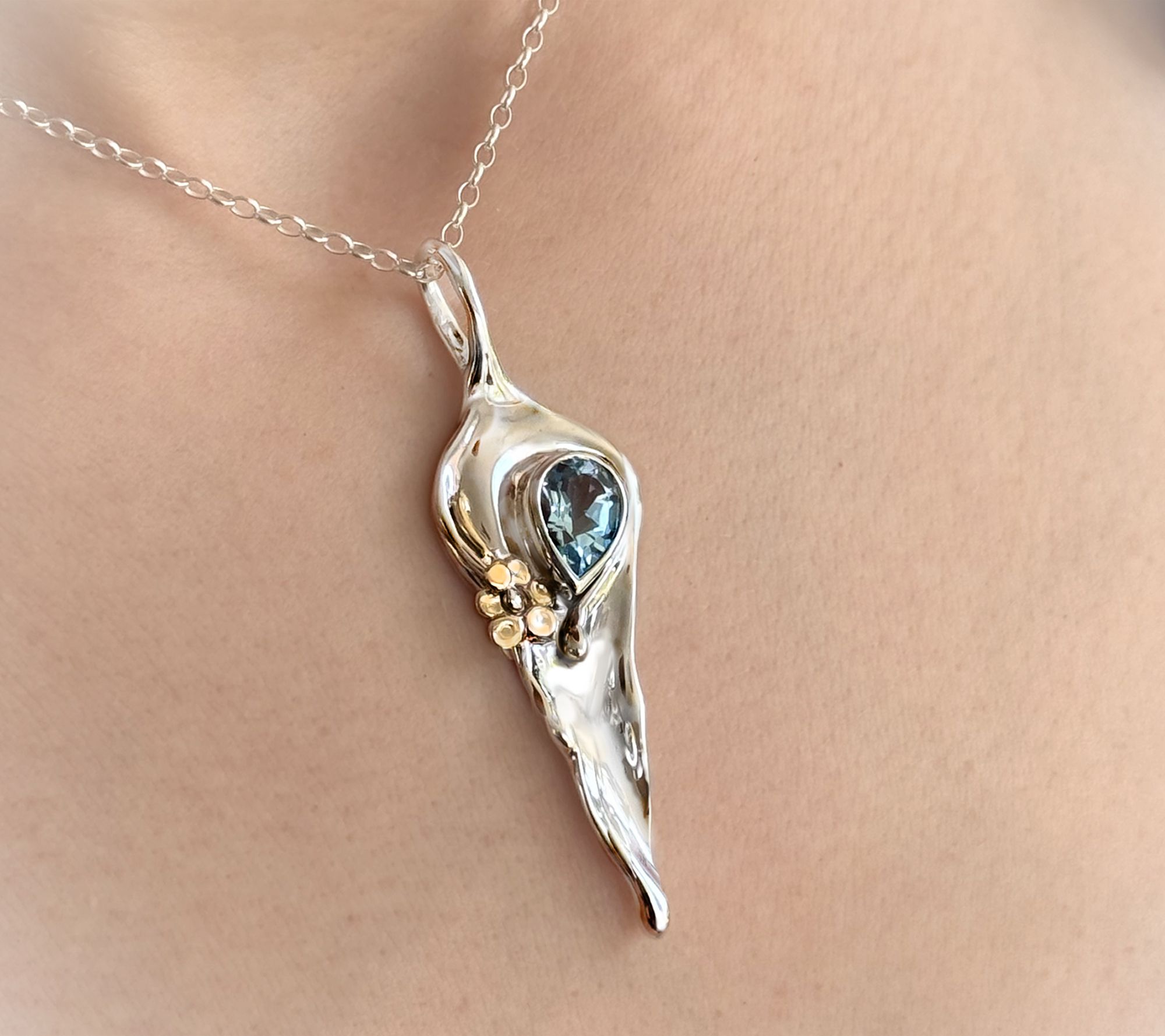 Freeform design slide pendant; faceted pear-cut gemstone in bezel setting; solid 14K gold flower accent; oxidized and polished finish