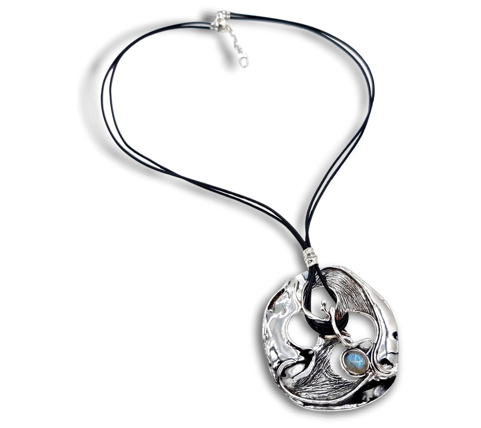 - Black leather cord; pendant with bezel-set labradorite cabochon; oxidized and polished finish