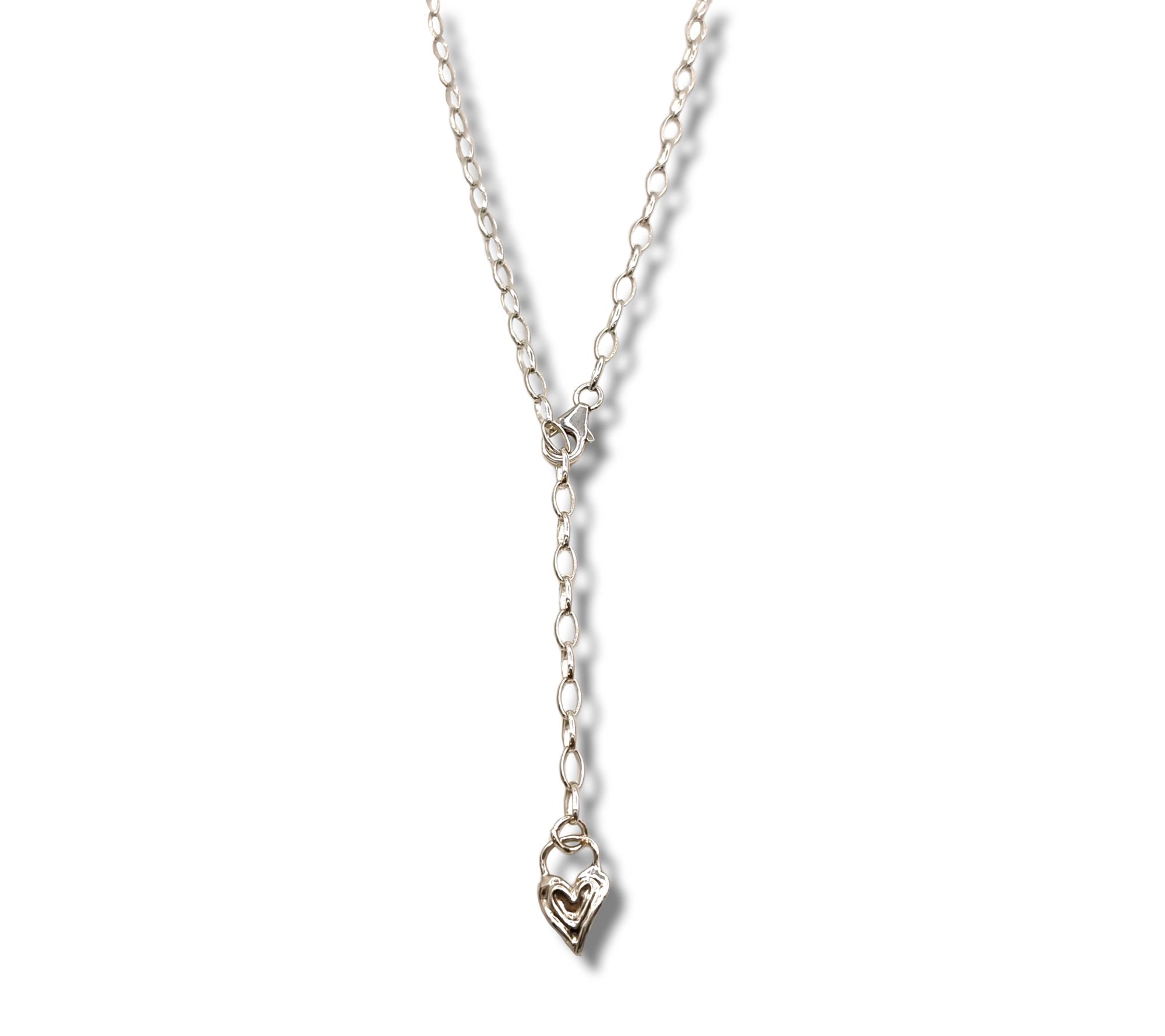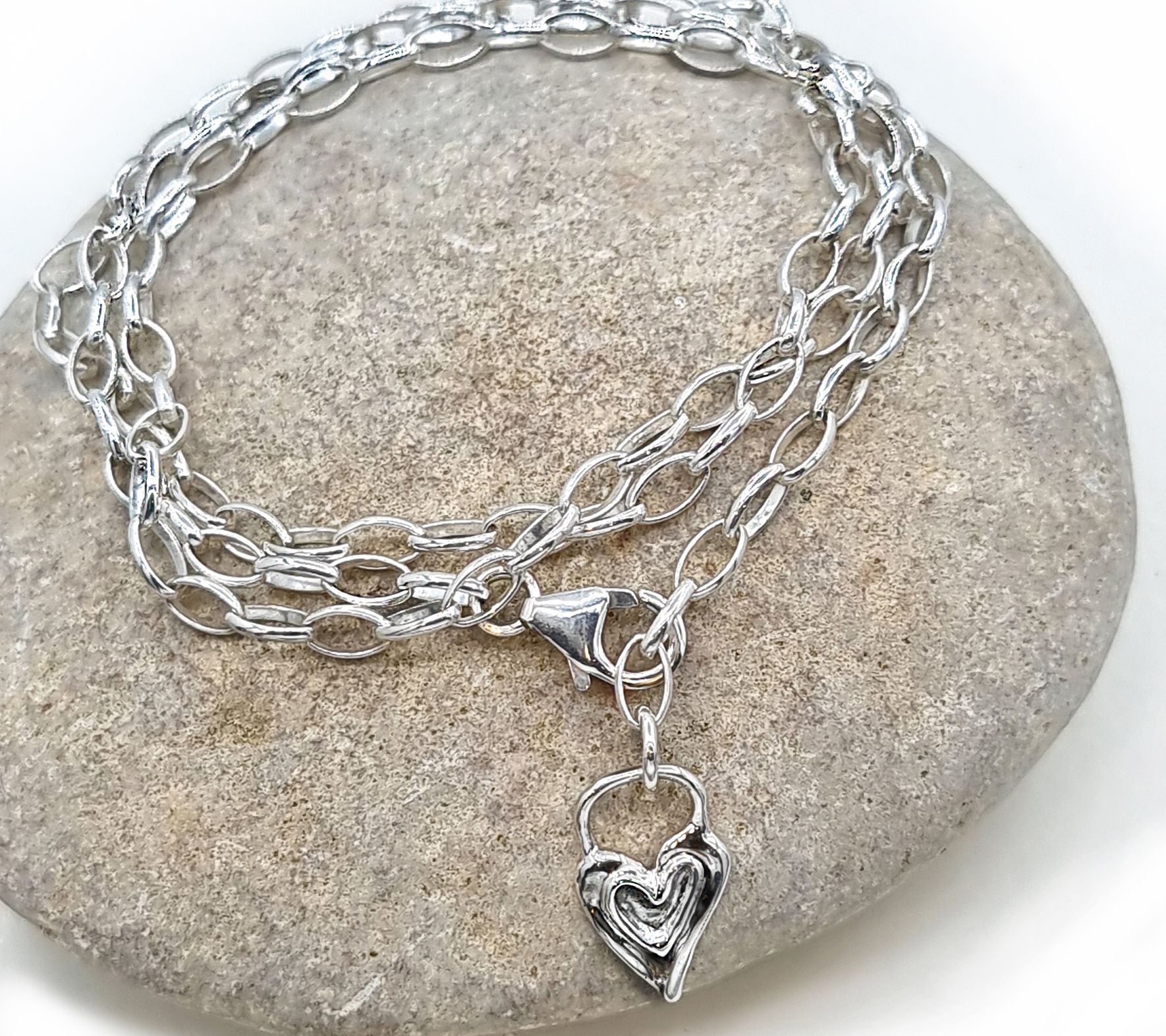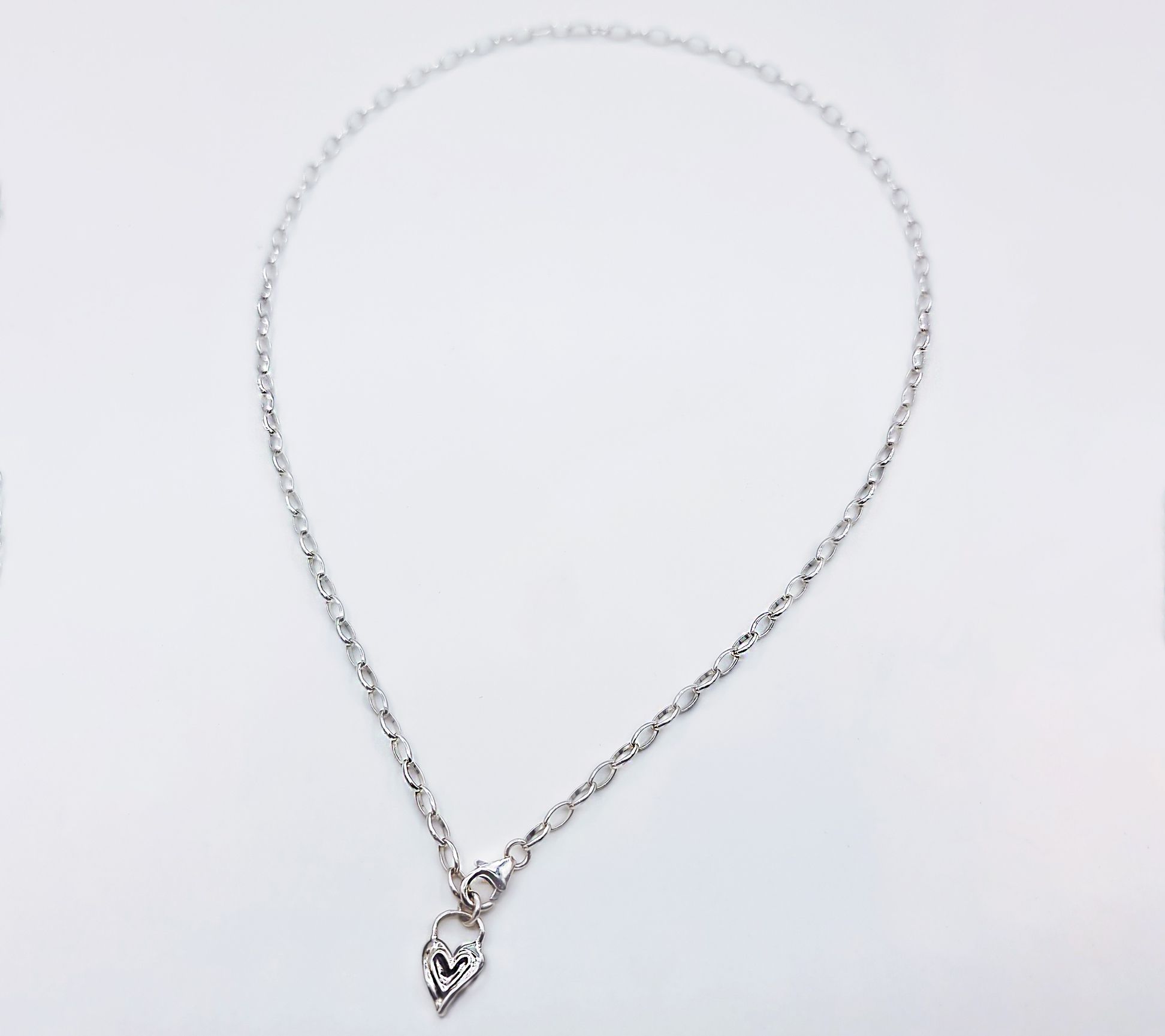 • Polished oval links seamlessly connected; clasp on one end of chain, heart-shaped charm dangling on other end