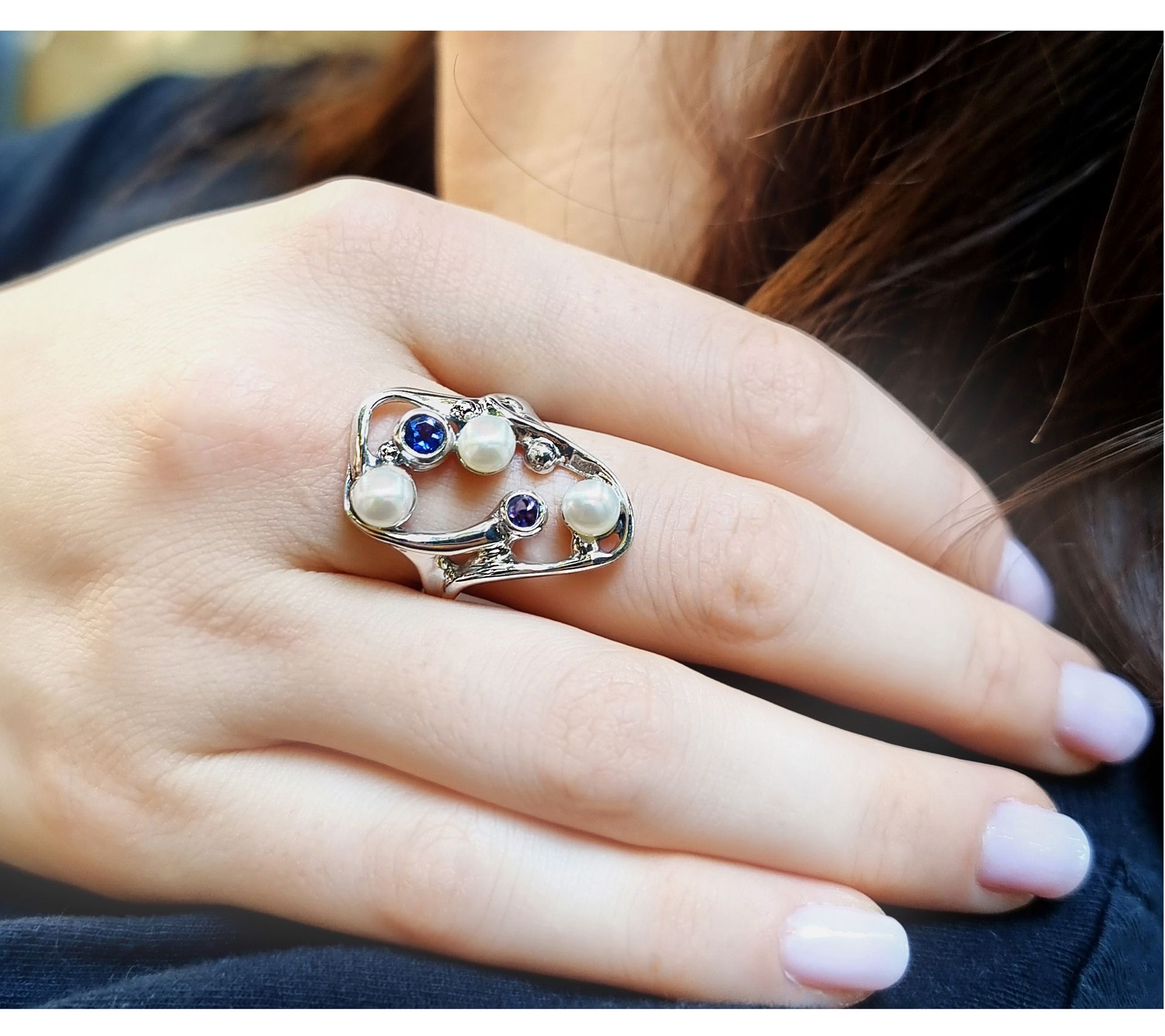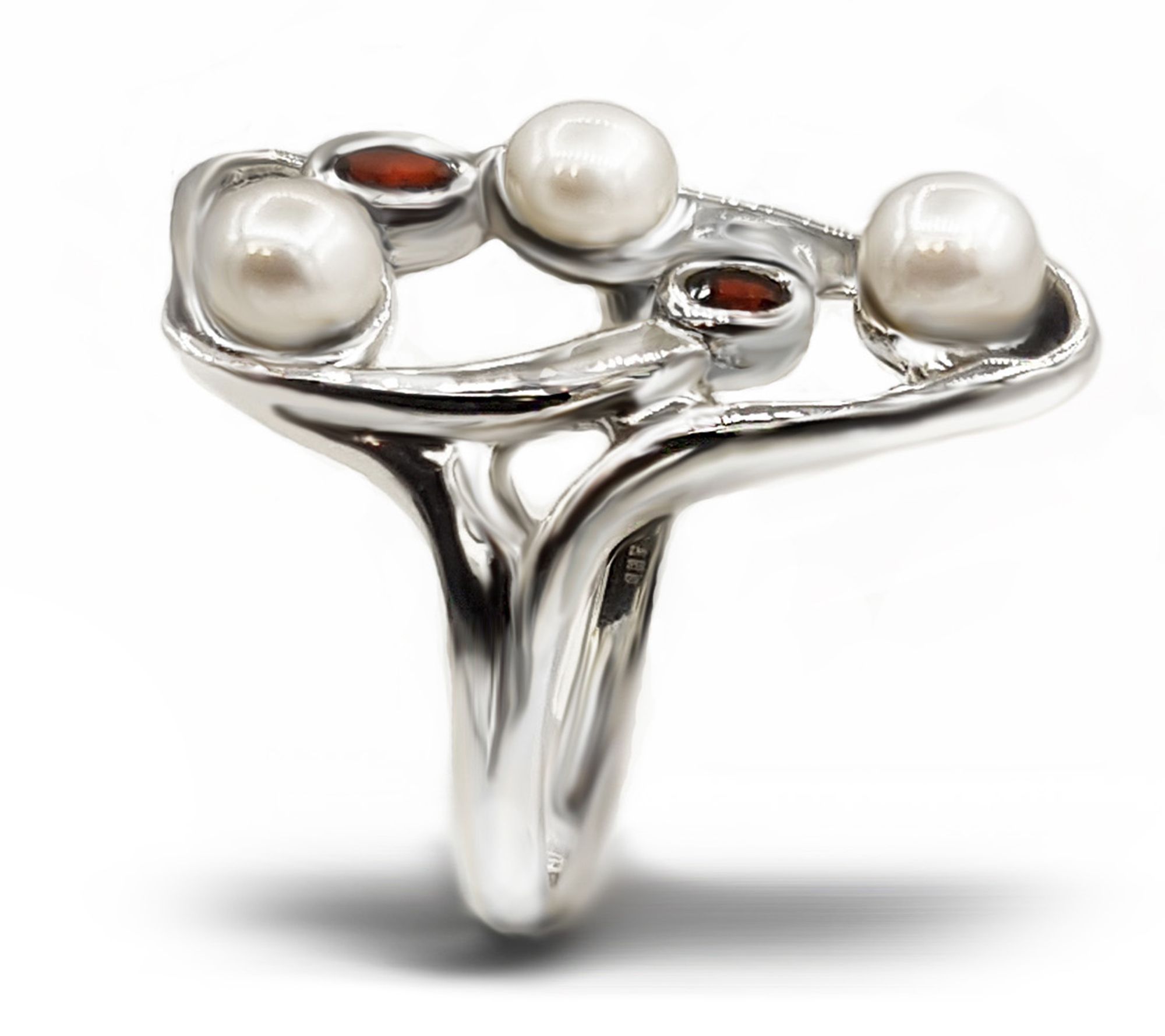 - Open-work ring with two bezel-set, faceted gemstones and thre cultured freshwater pearls; polished and oxidized finishes