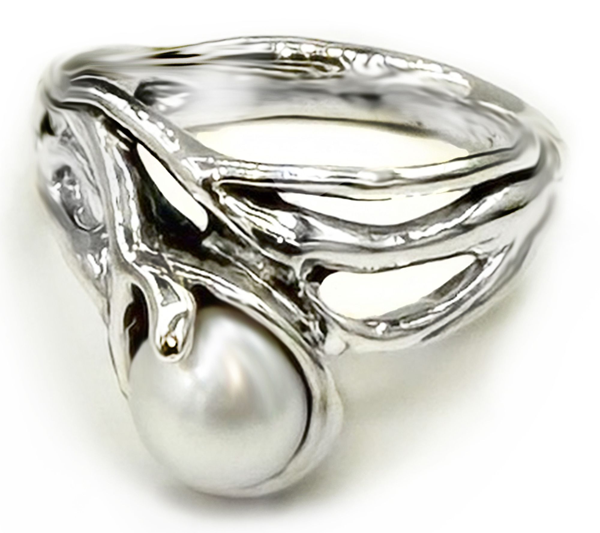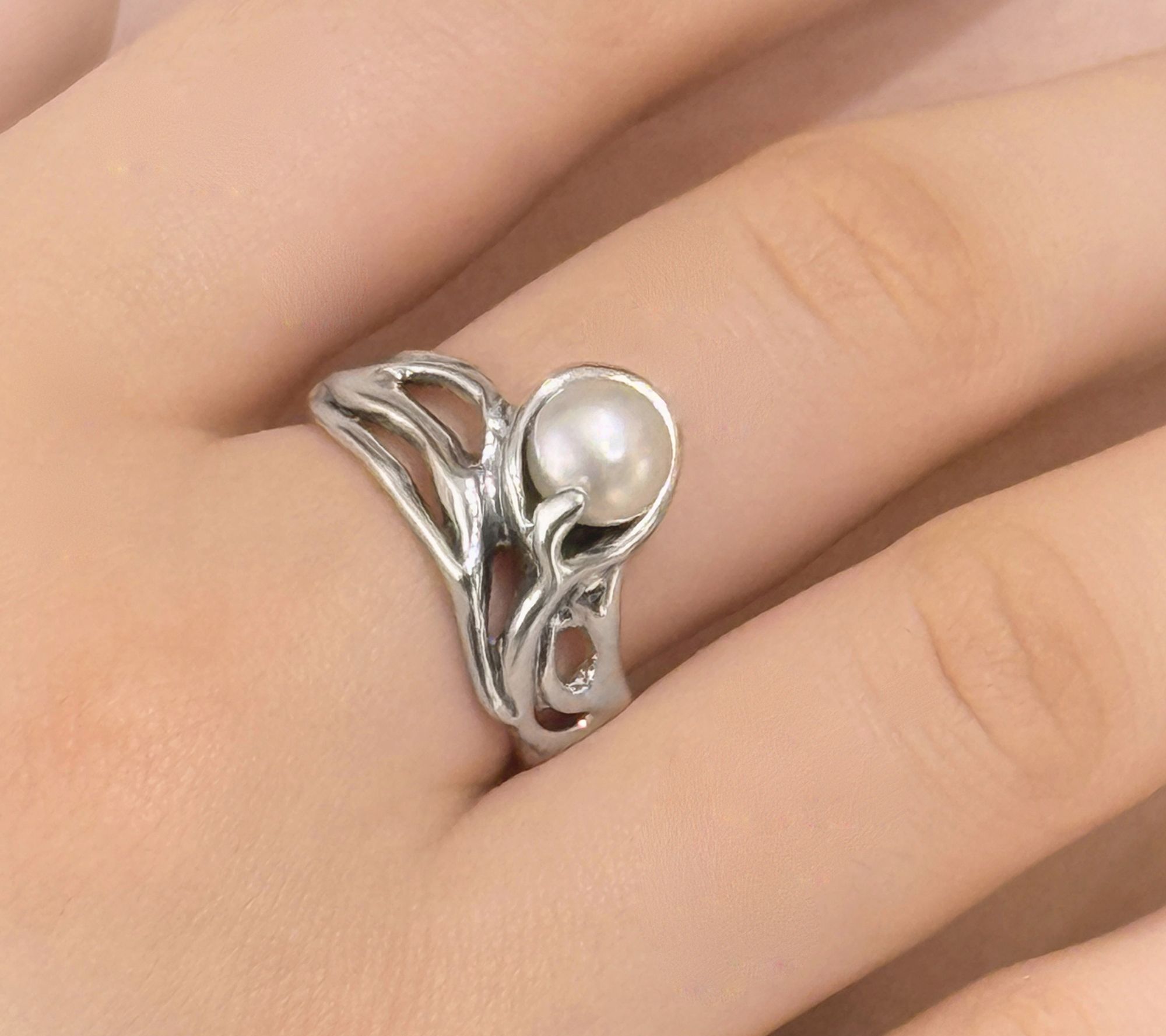 Like a dreamy treasure discovered beneath glistening waves, this sterling silver ring captures the allure of ocean depths with its freeform, undulating design that echoes a miniature coral forest. Nestled at the center, a luminous cultured freshwater pearl radiates with timeless elegance, inviting you to add a touch of sea-inspired mystery to every day. From Hagit.