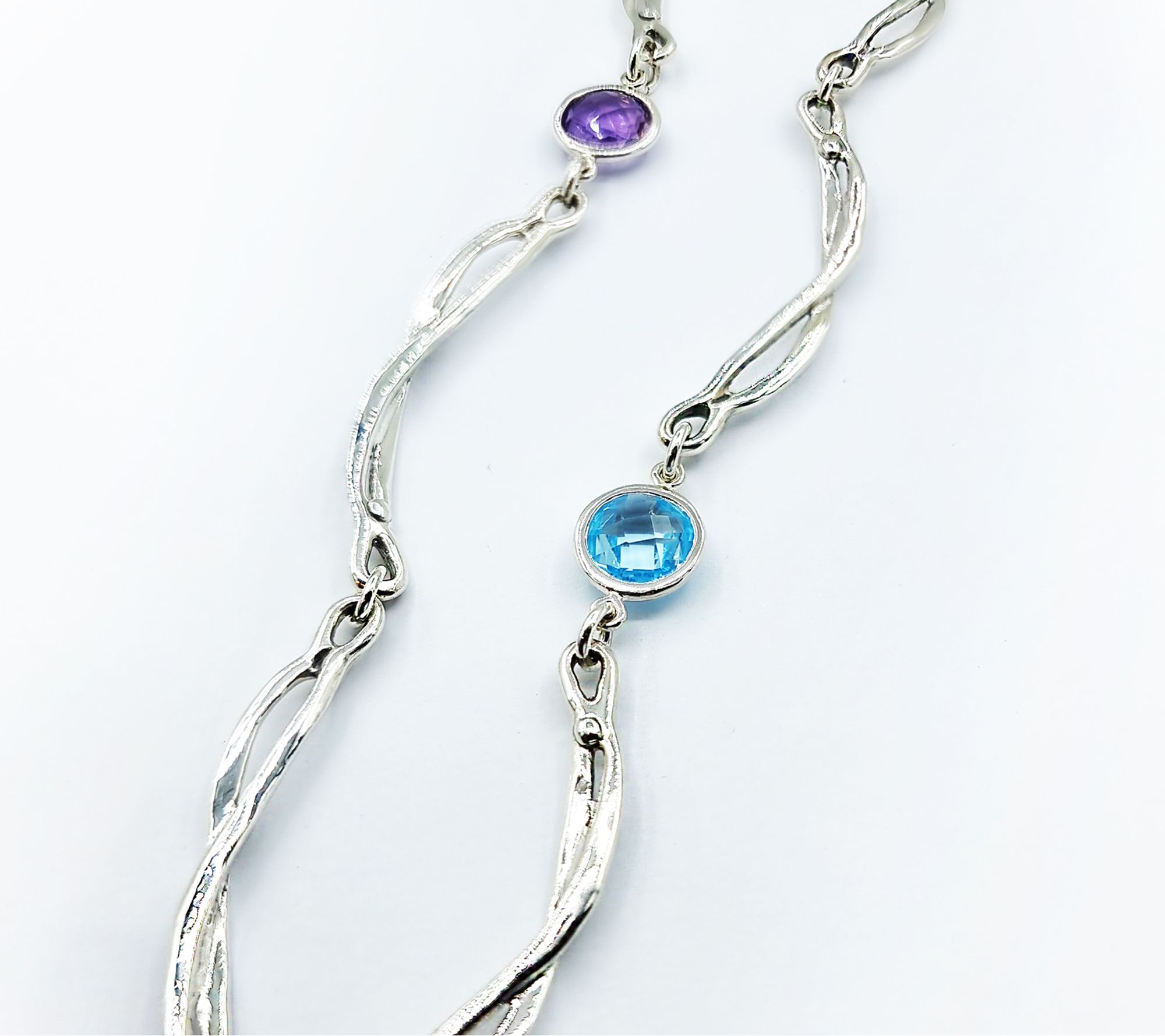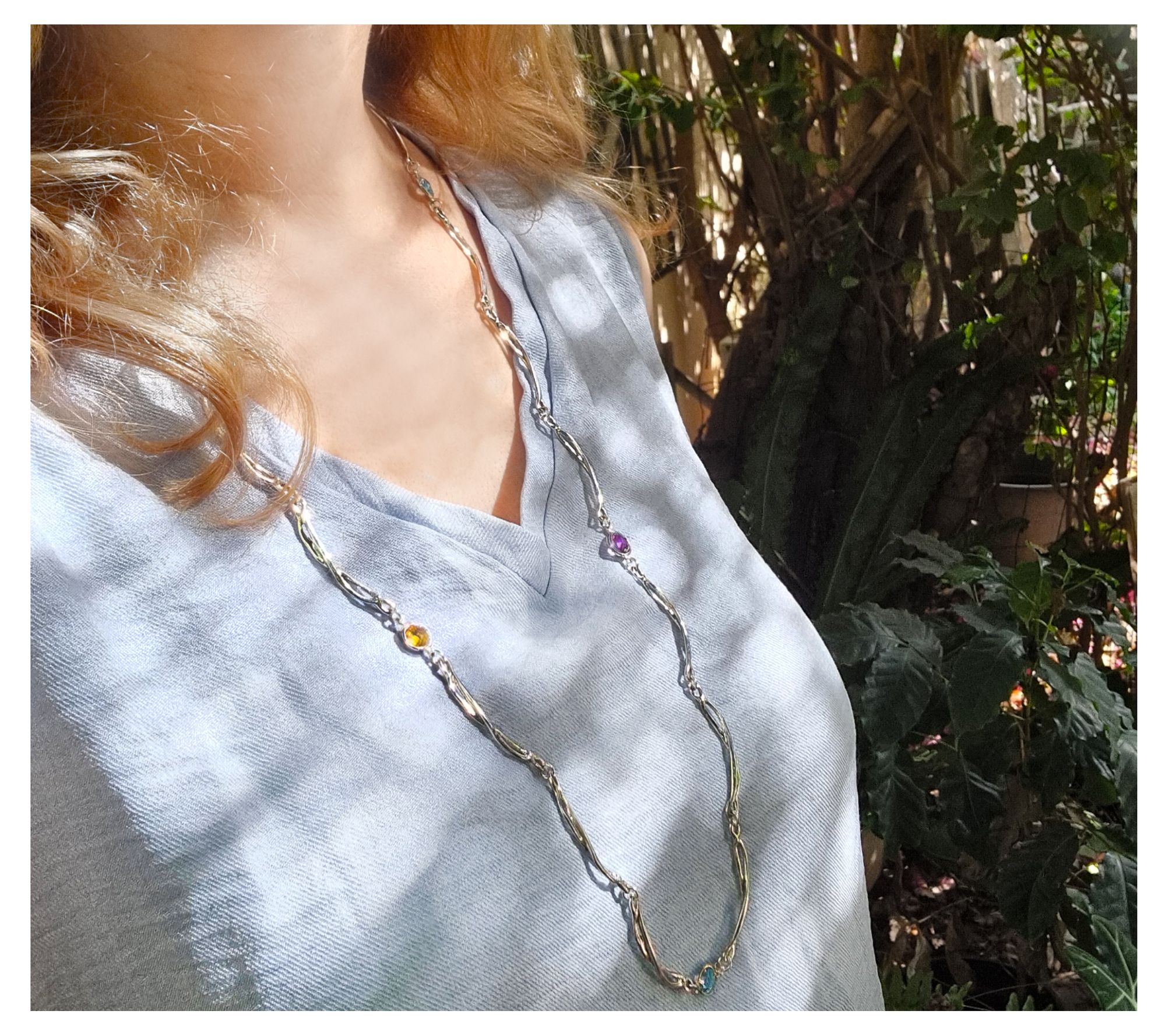 Turn heads and make a statement with this astonishing Hagit Sterling Silver Twiggs Sparkle multi-gemstone necklace. The piece dances with colorful elegance, featuring five double-sided checkerboard-cut gemstones in amethyst, blue topaz, and citrine. Whether you're dressing up for a formal event or adding a touch of sparkle to your everyday outfit, this necklace promises to dazzle. From Hagit.