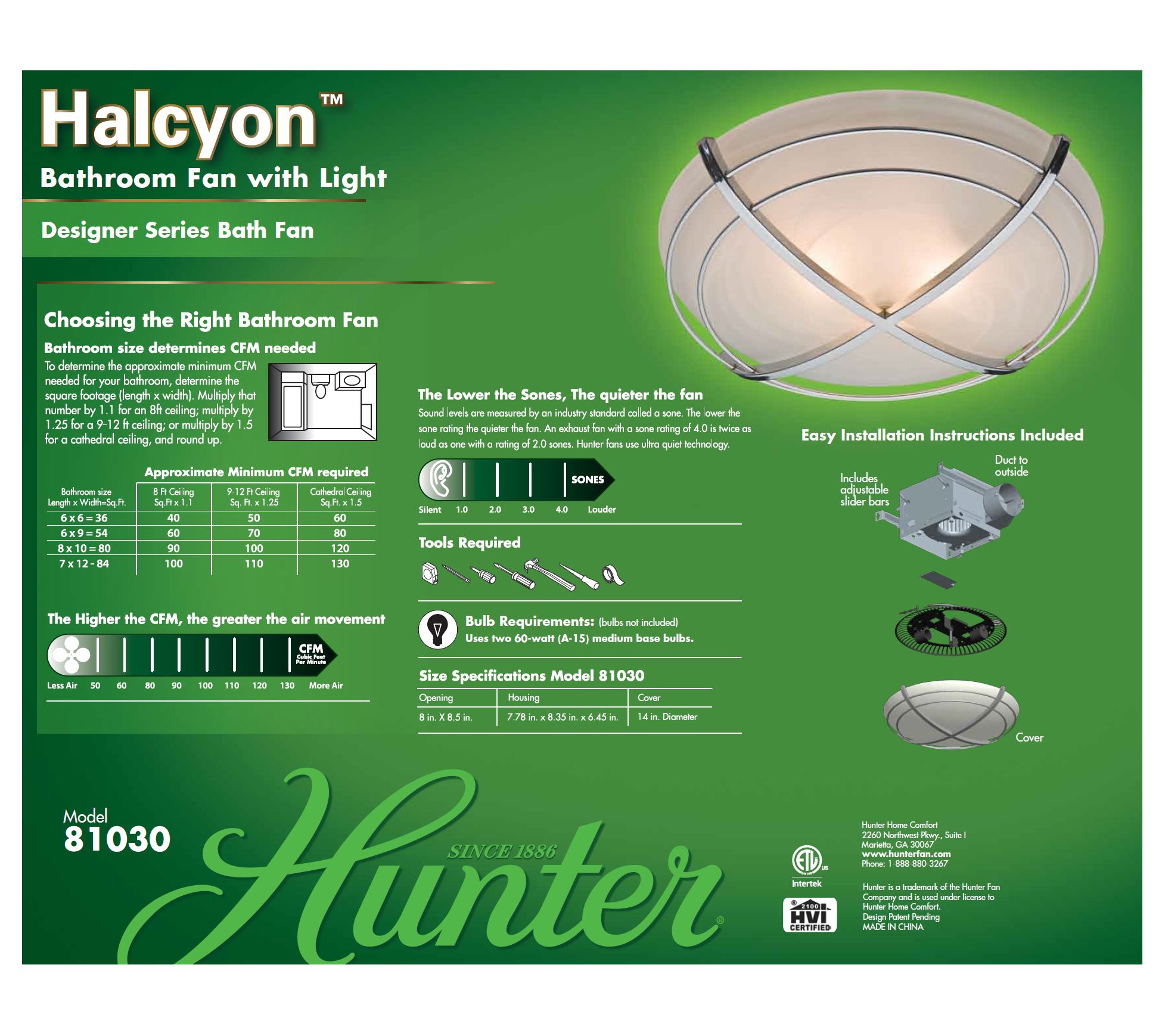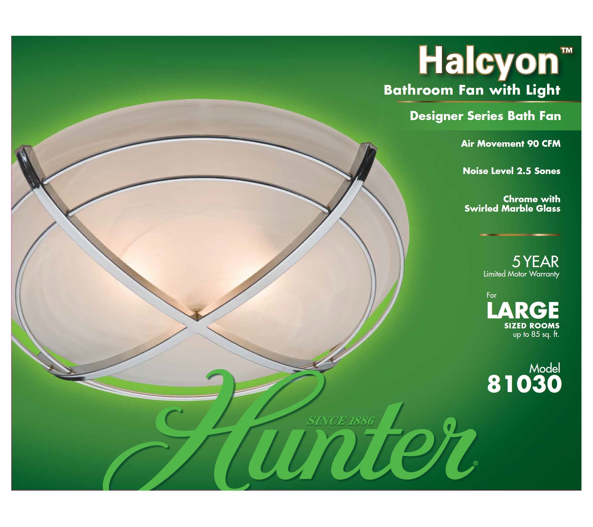 Operating at 2.5 sones with a 90 CFM output, the Halcyon ventilation fan with light features a sleek, contemporary cast chrome design with a swirled marble glass enclosure. From Hunter.