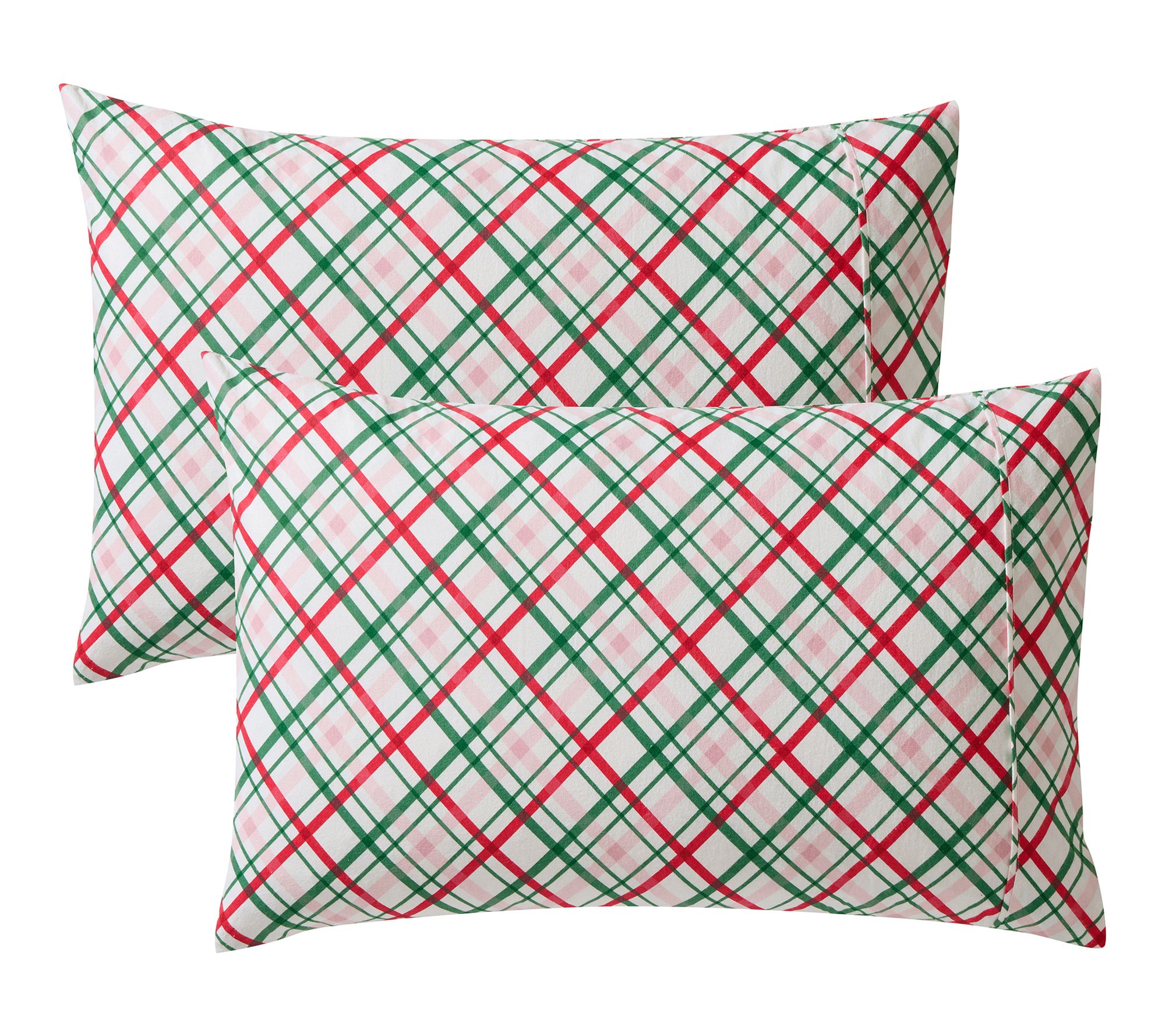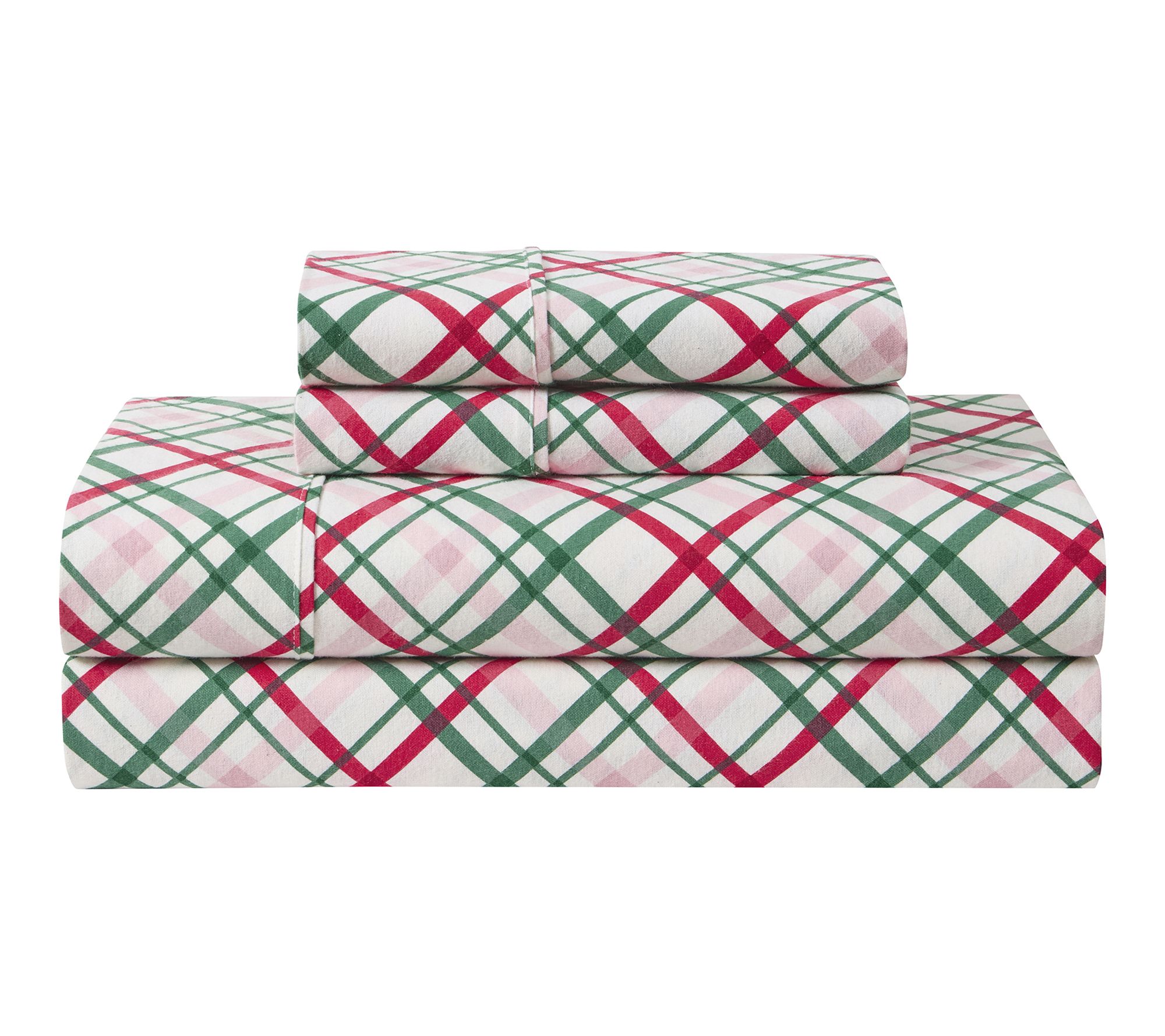 Add a festive touch to your bedroom with these holiday sheet sets, featuring cheerful green and pink plaid prints crafted from ultra-soft brushed cotton. Designed to keep your nights cozy all season, the deep-pocket fitted sheet easily stays in place on thick mattresses, while the easy-care design makes laundry a breeze. From Hallmark.