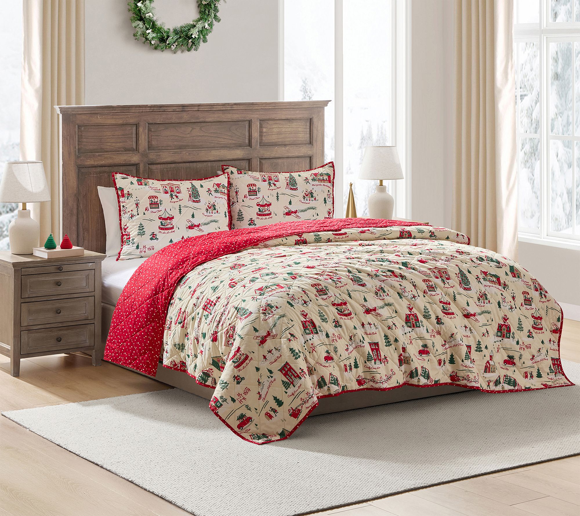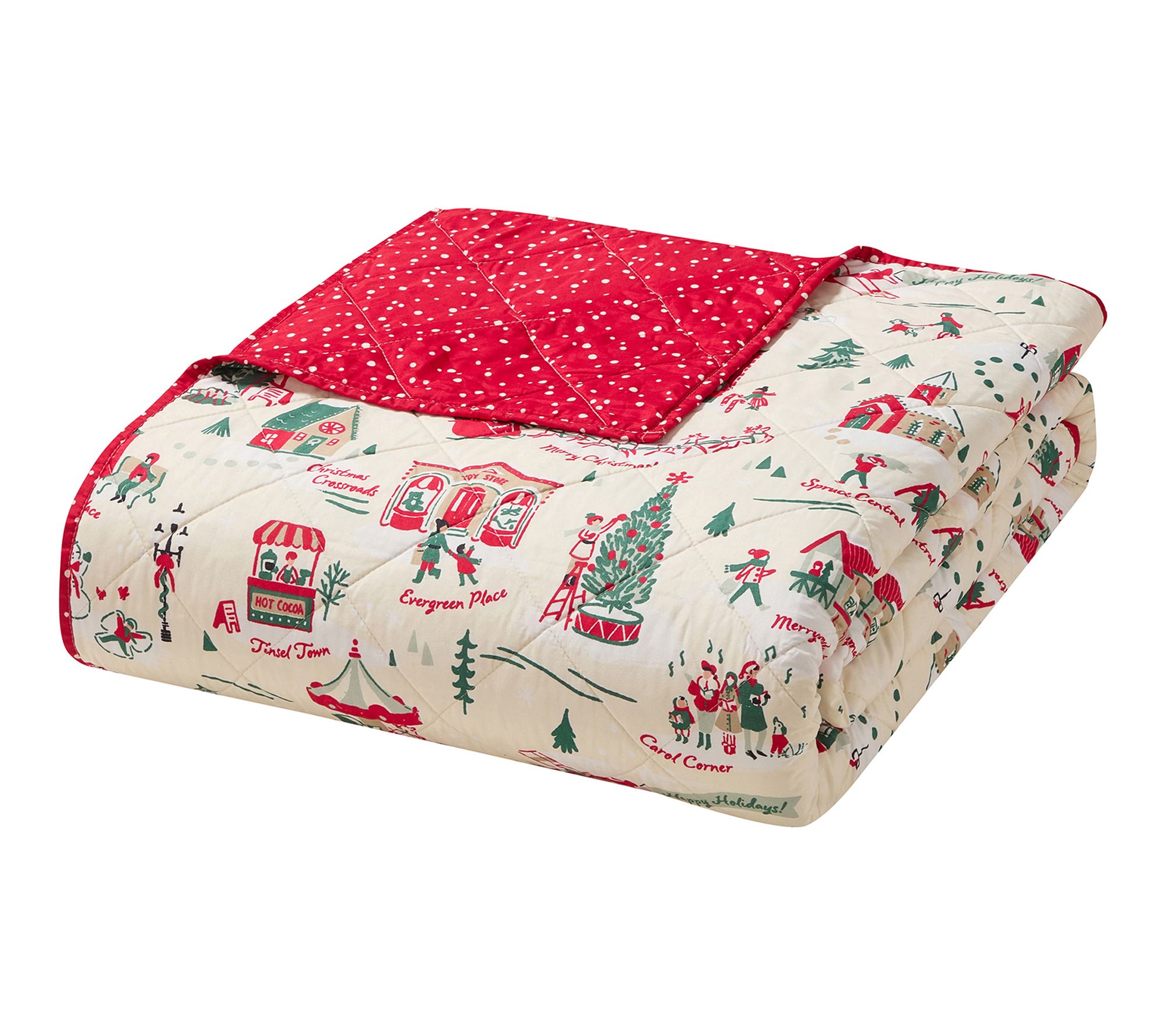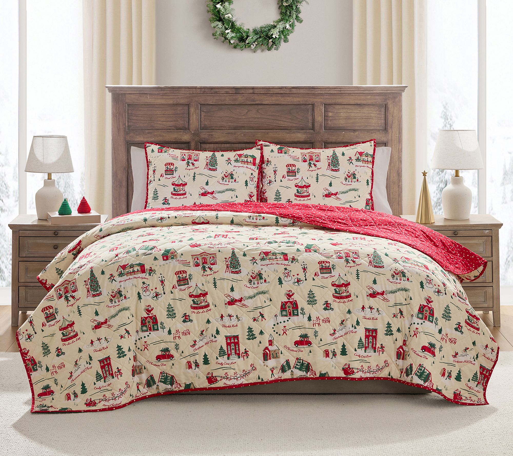 Bring festive cheer to your bedroom with this holiday quilt set, featuring a charming Christmas village and playful snowflake prints. The reversible design lets you switch up your seasonal style, while soft microfiber keeps you cozy all winter long. From Hallmark.