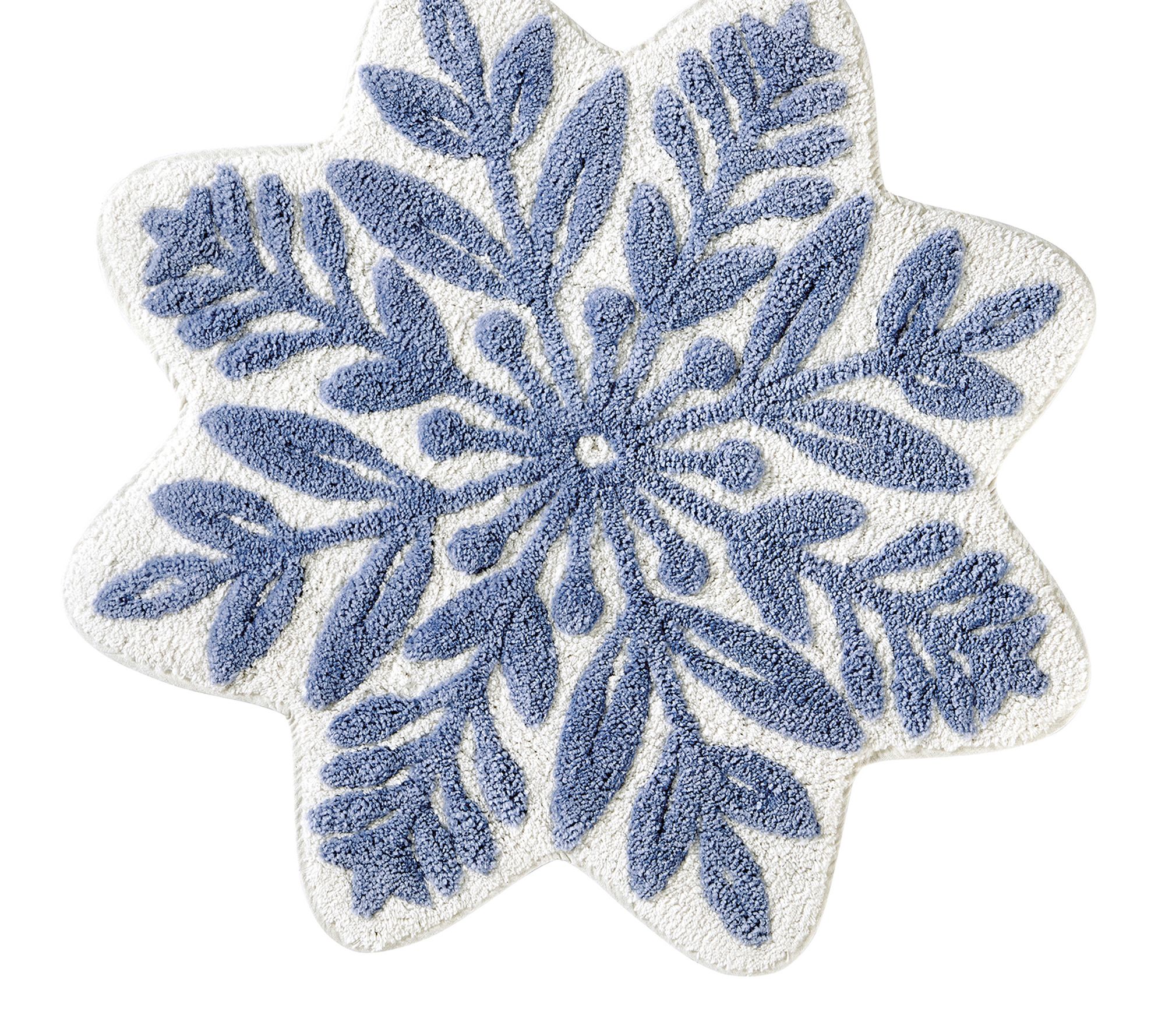 Bring a touch of winter magic to your bathroom with this holiday bath rug, featuring a beautiful blue and white snowflake design on a tufted high-low pile. The round 30" shape adds a cheerful accent to your space and coordinates effortlessly with Hallmark's All Is Calm holiday bedding and pillow collections. From Hallmark.