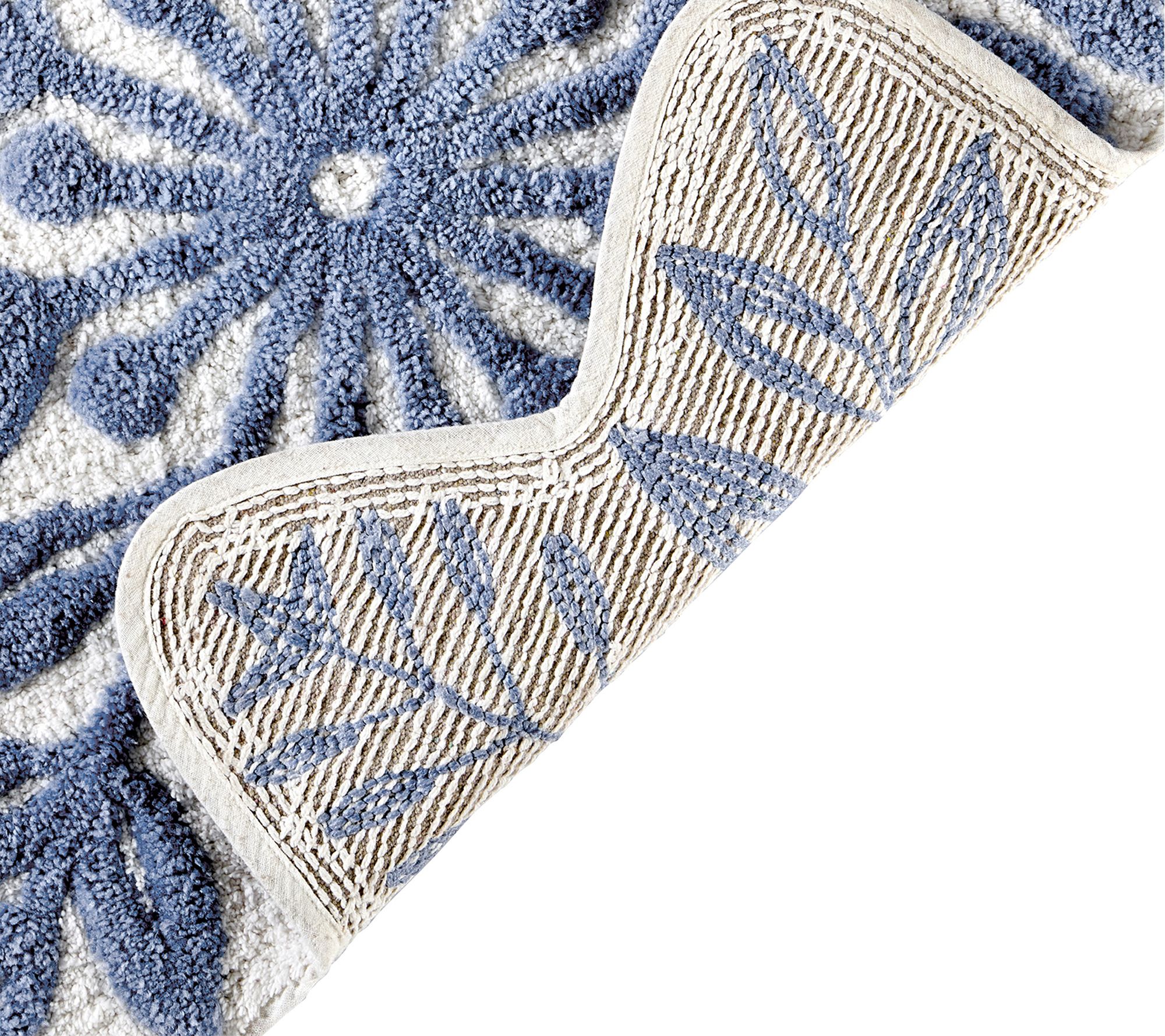 • Holiday bath rug features blue and white snowflake design
