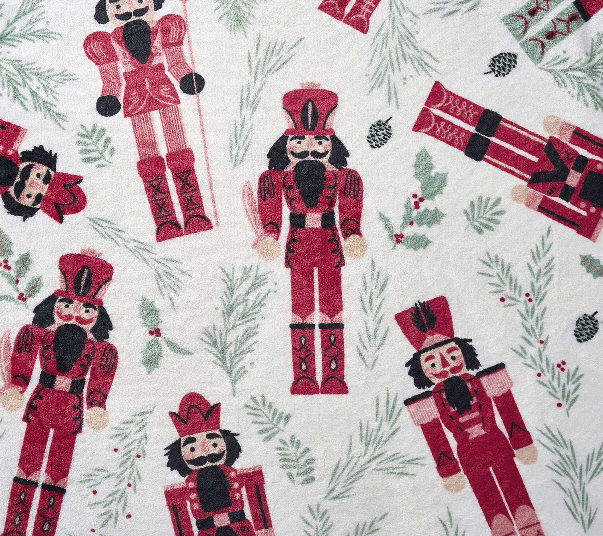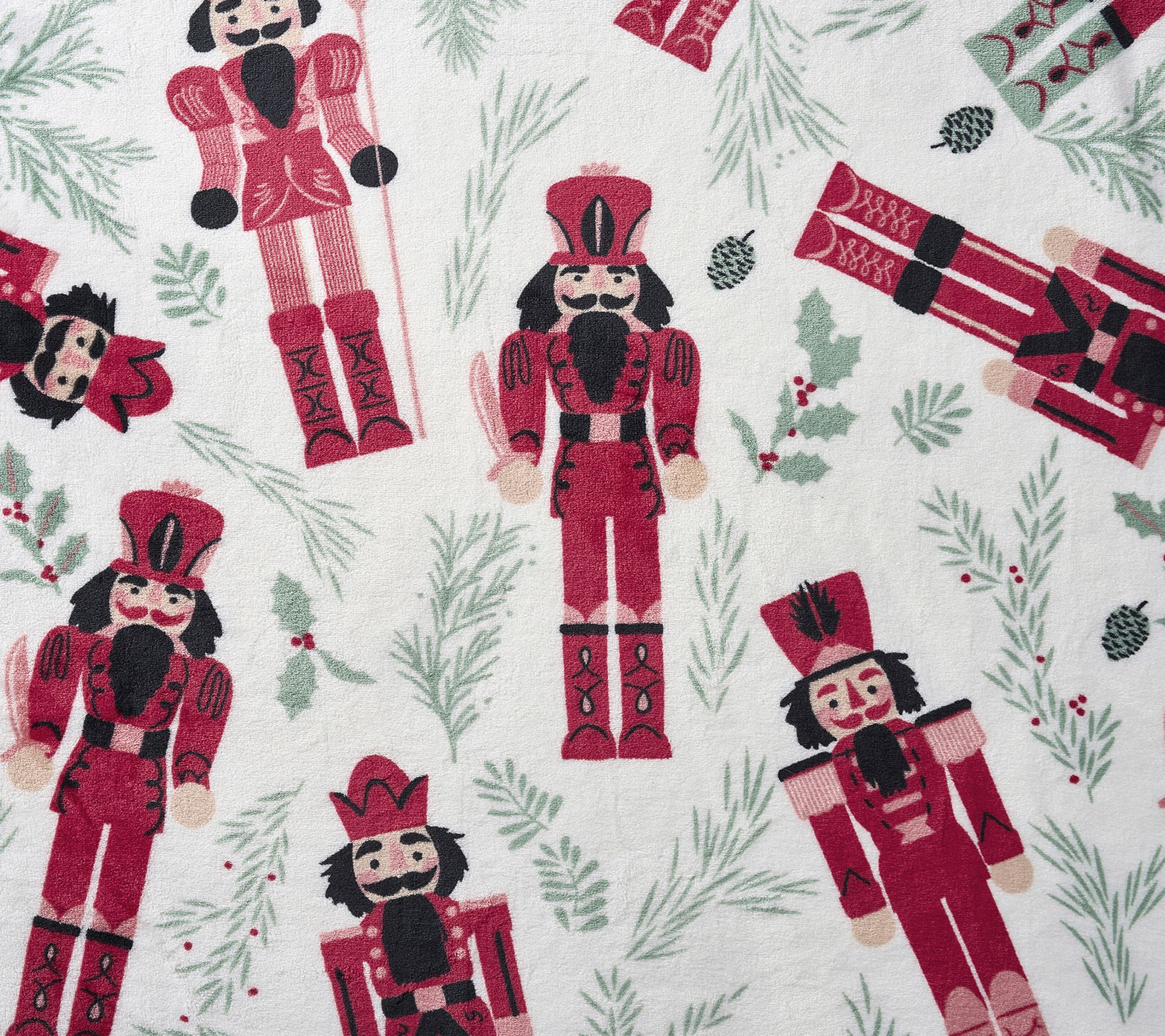 • Plush holiday throw with charming nutcracker soldier prints