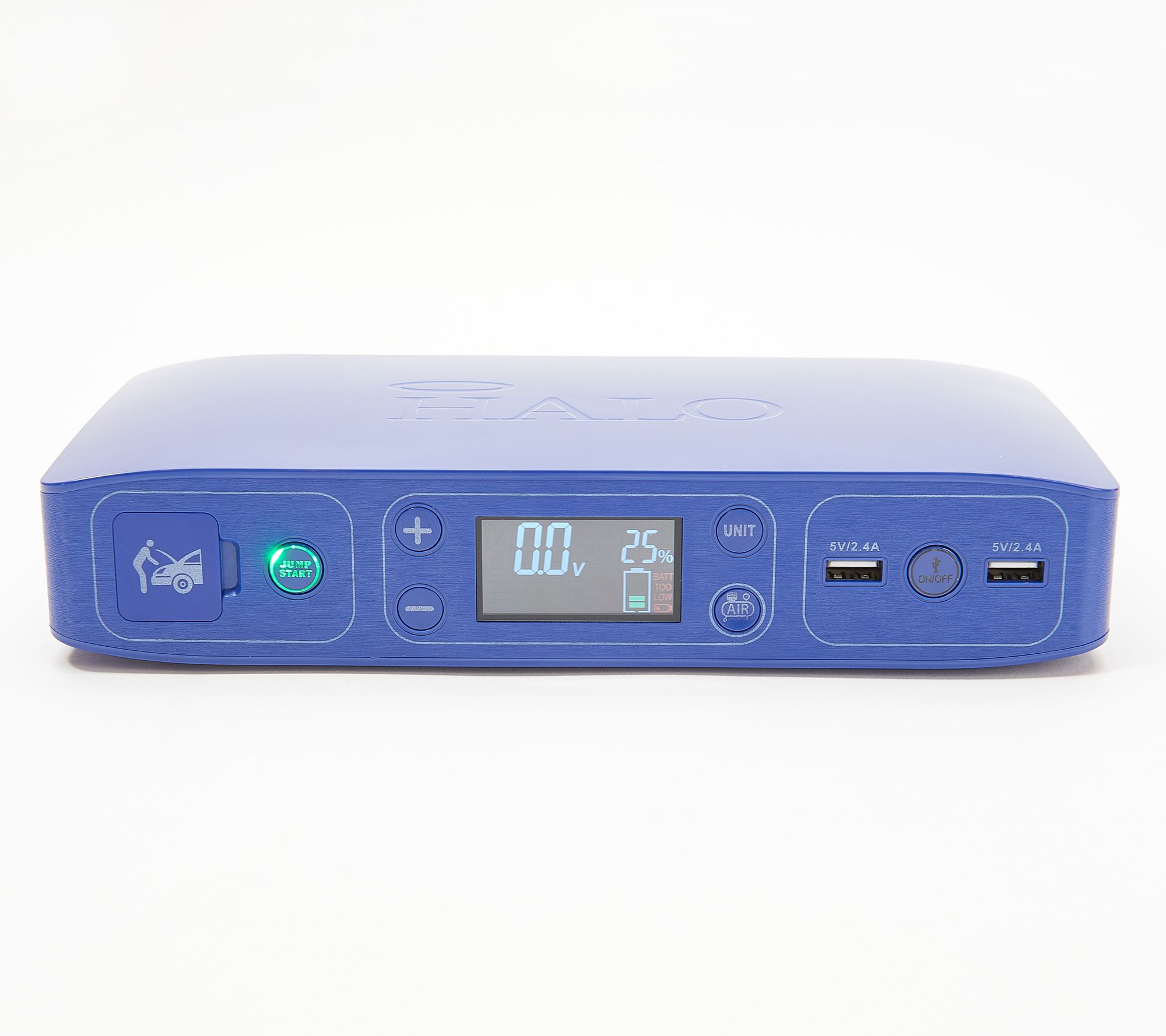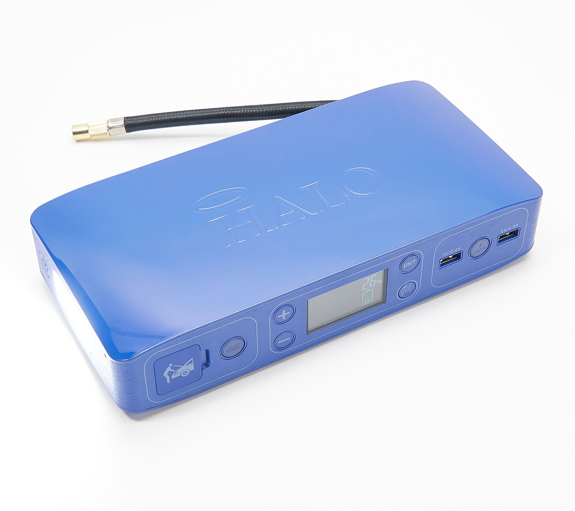 Think of it as a guardian angel for your vehicle. From a dead battery to low tire pressure, the Halo Bolt Air+ takes care of your emergency roadside needs with a one-button jump starter paired with an integrated air compressor that also pumps up basketballs, bike tires, and rafts. Two USB charging ports let you power up your family's phones while you're sitting in traffic or stuck without power, while the improved LCD display keeps an accurate eye on battery life. So pop this helpful device into your trunk for your own peace of mind while you're out-and-about -- and know it's always there to get you out of a jam at home, too! From Halo.