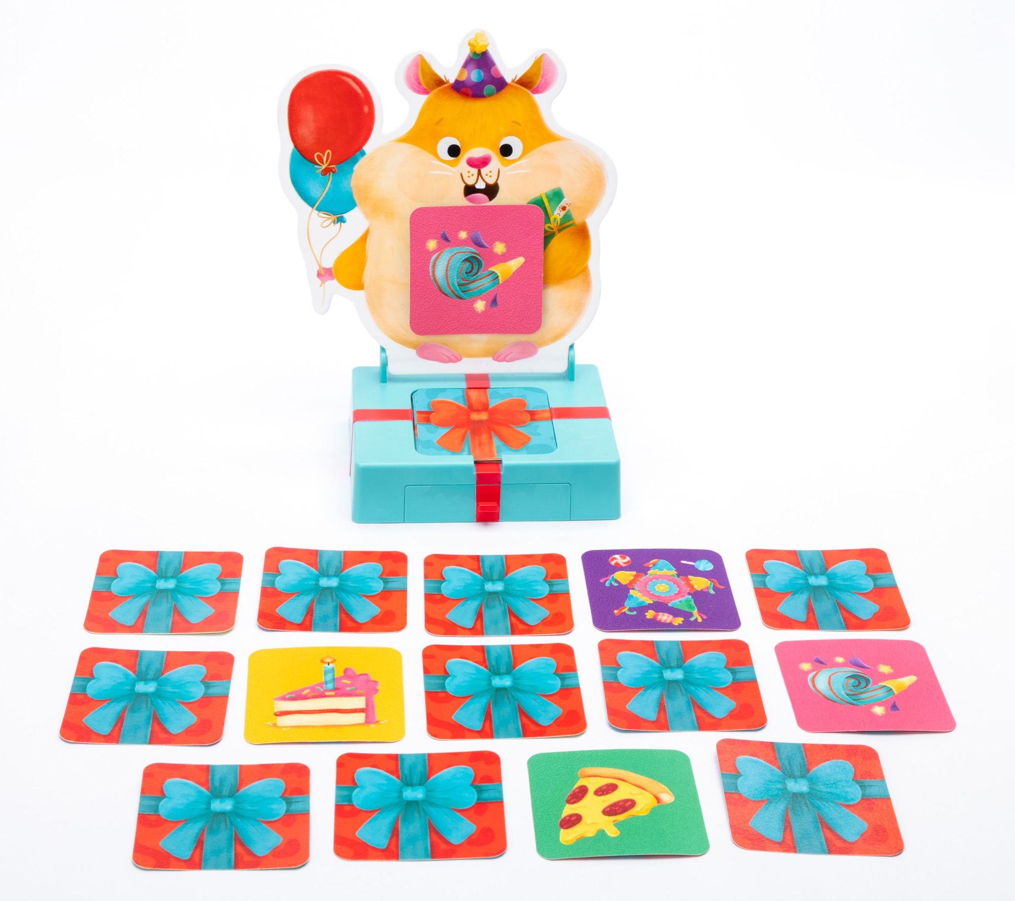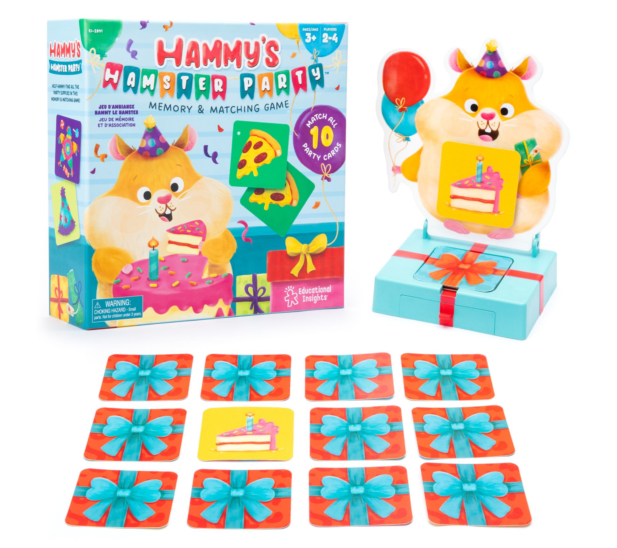 Hammy's throwing a party, and your child is invited! Engage in endless fun while developing memory skills with this delightful game. Press the adorable Hammy randomizer and find matches to the cards Hammy holds. And when a pinata player card is flipped, everyone races to find matches! A perfect blend of entertainment and learning, it's all about turn-taking and visual recognition practice. From Educational Insights.