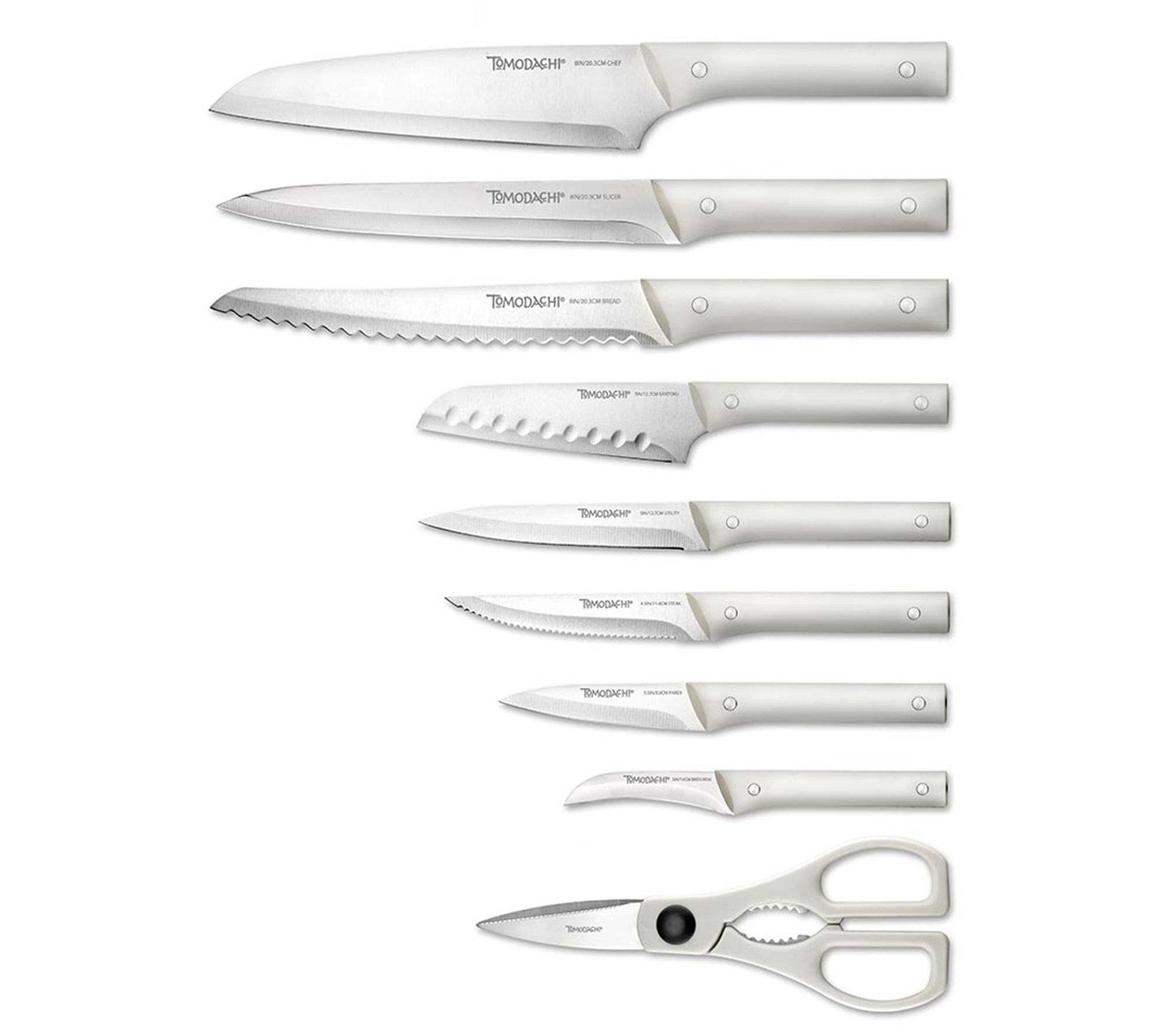 • Includes eight chef knife, eight slicing knife, eight bread knife, five santoku knife, five utility knife, six 4.5" steak knives, 3.5" paring knife, three bird's beak knife, kitchen shears, knife block